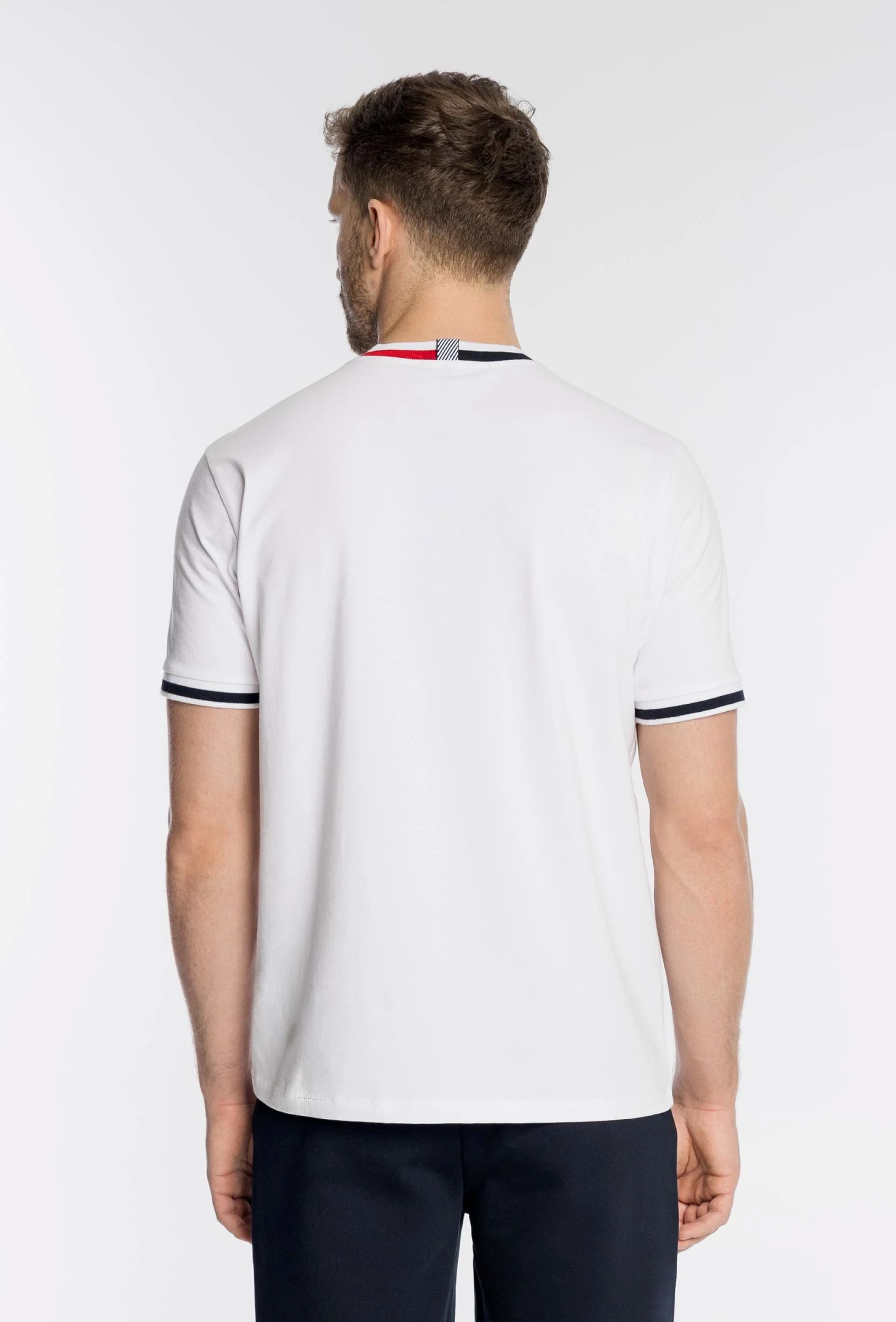 ⇒ Krótki rękaw wykończony biało-granatowym ściągaczem.