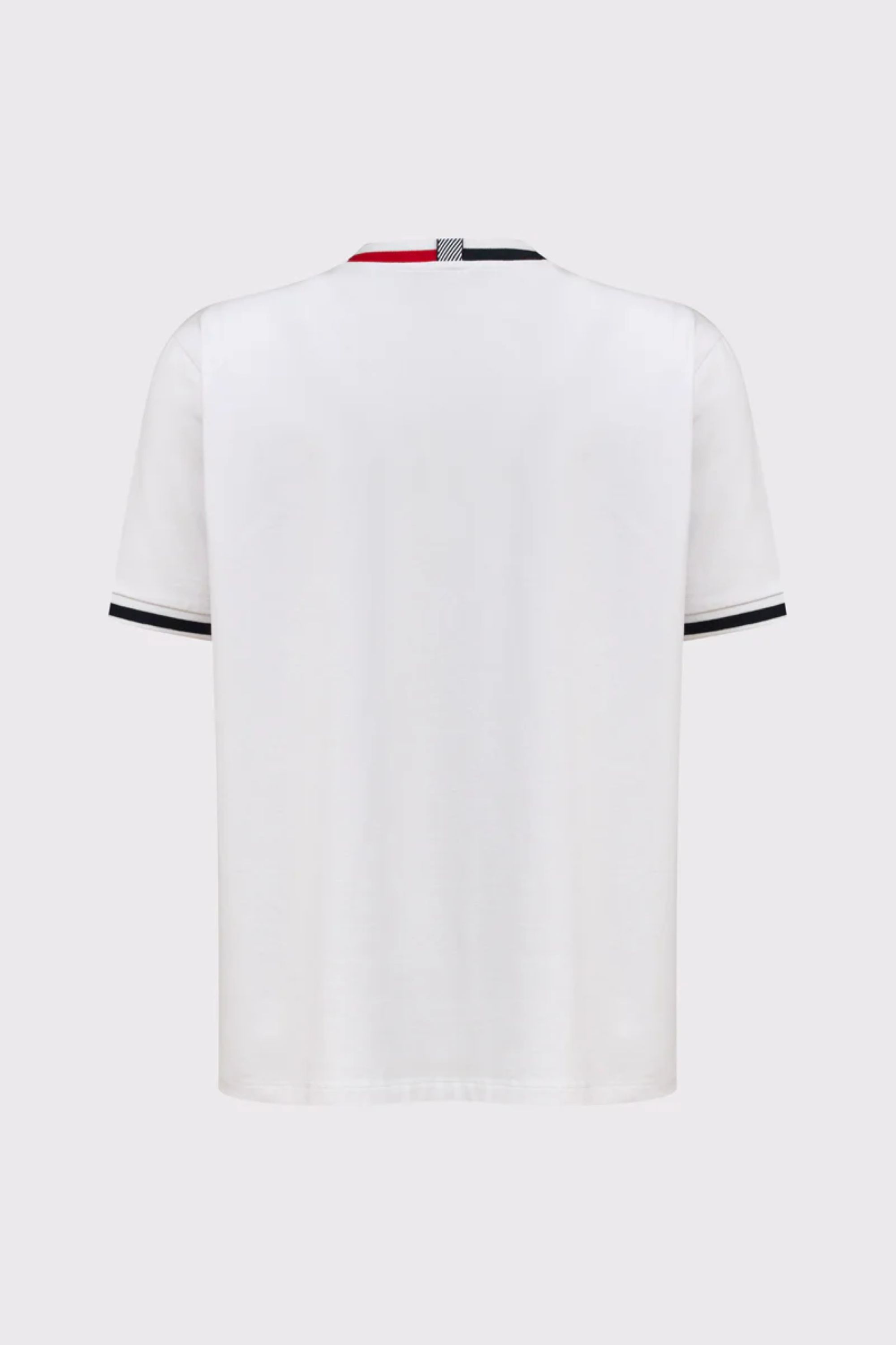 ⇒ Okrągły dekolt z granatowo-czerwoną wstawką.