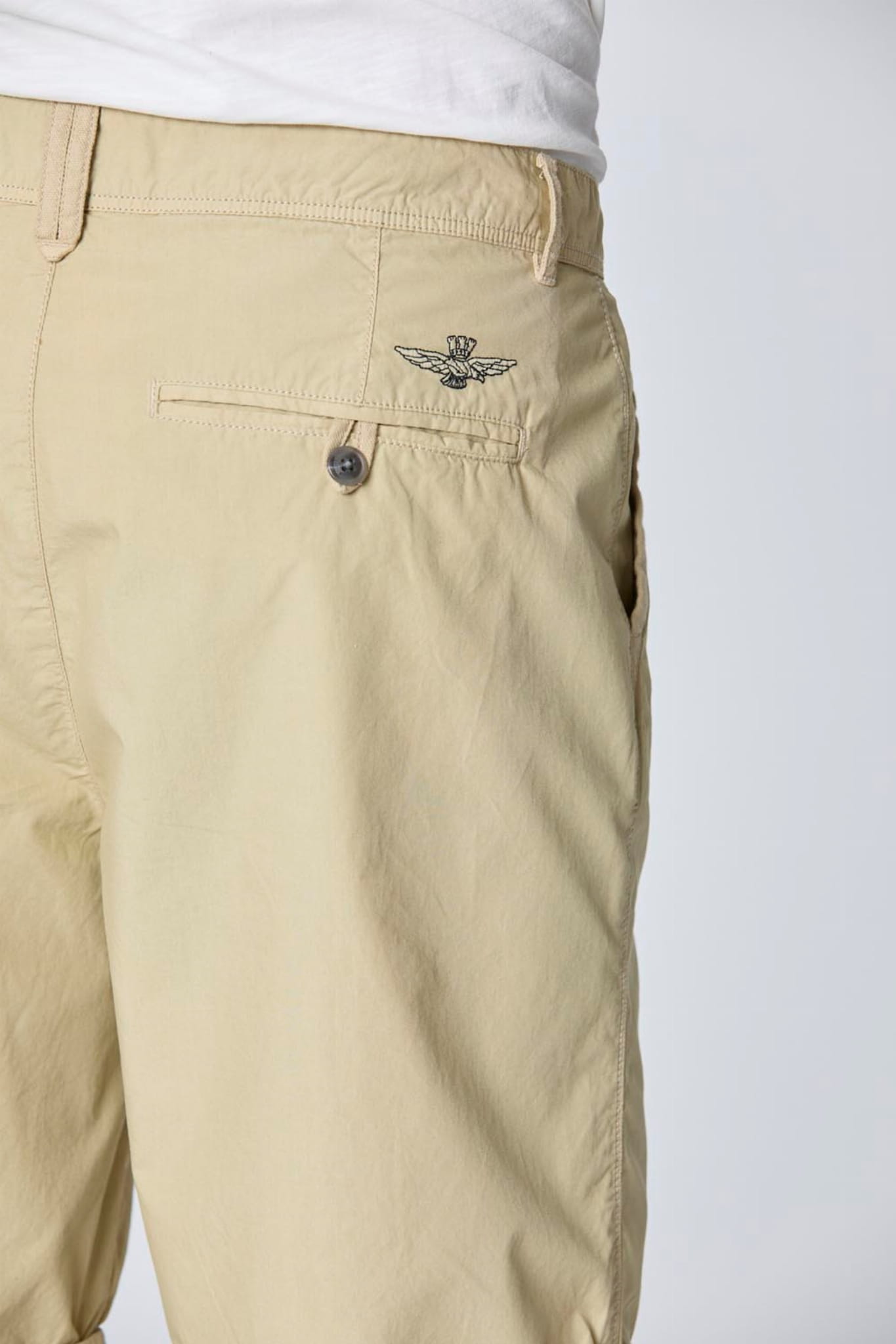 ⇒ Nad jedną z tylnych kieszeni znajduje się starannie wyhaftowane logo marki Aeronautica Mlitare w formie kultowego orzełka z wieżyczką.