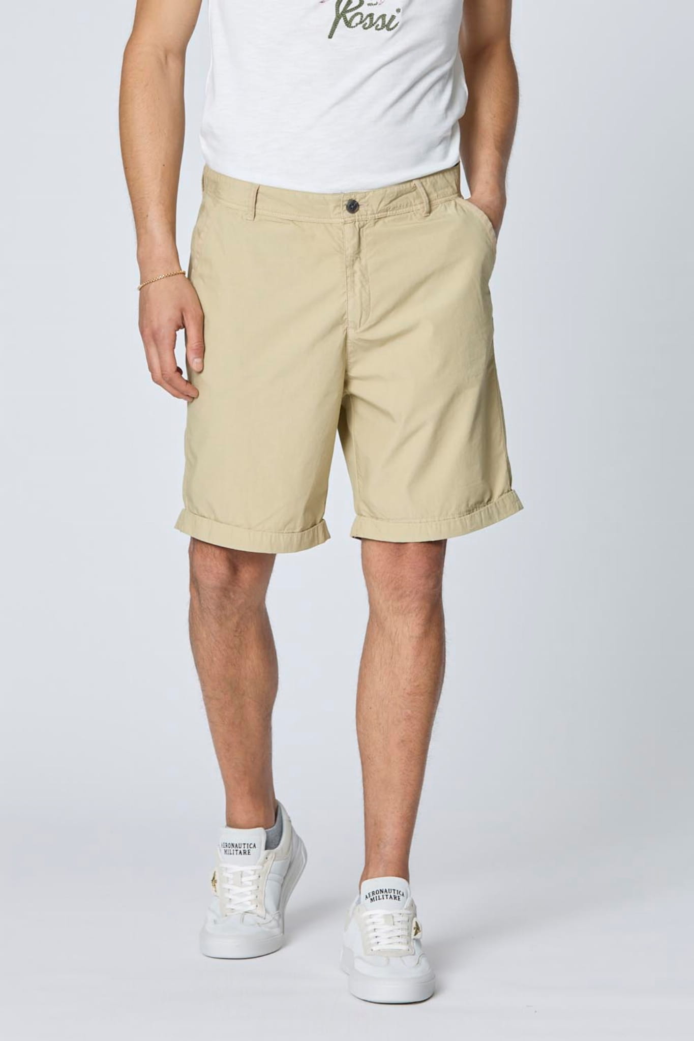 Męskie krótkie spodenki bermudy szorty marki Aeronautica Militare, w kolorze beżowym.
