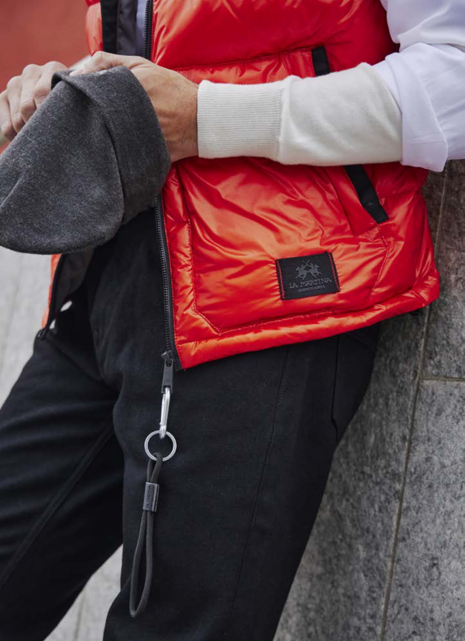 ⇒ Bezrękawnik zapinany jest na logowany zamek błyskawiczny, a do niego doczepiony jest brelok.