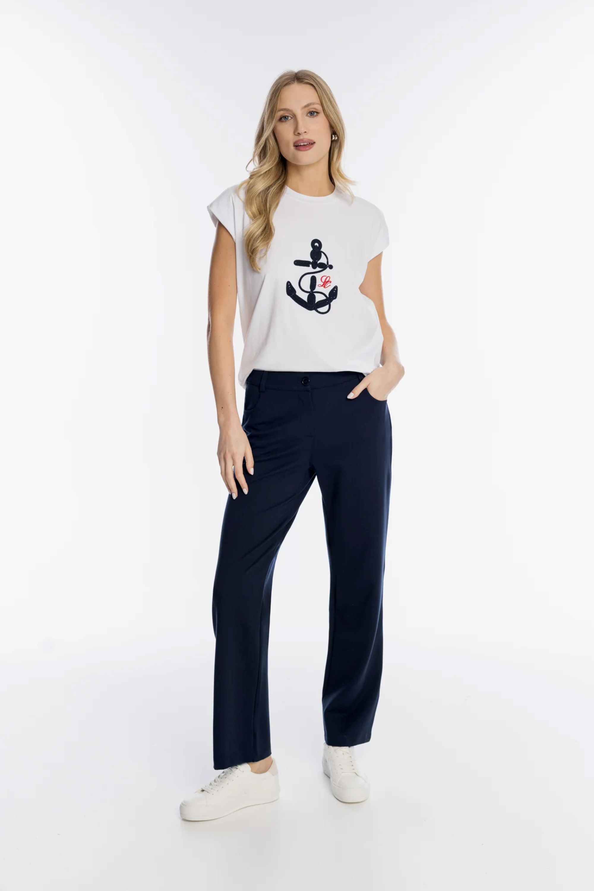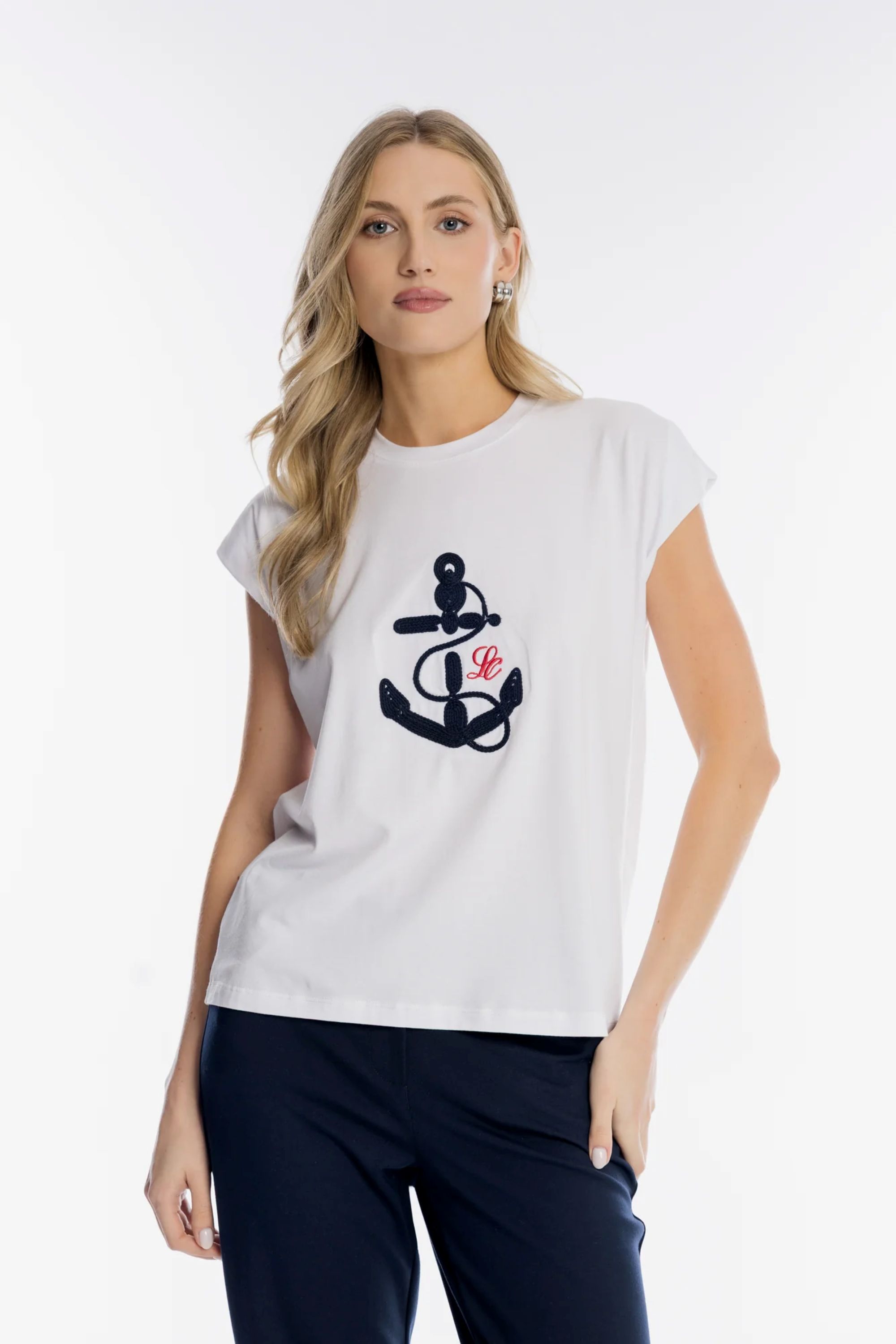 ⇒ Z przodu znajduje się duża, efektowna aplikacja w kształcie kotwicy wykonana z granatowego sznurka, uzupełniona subtelnym czerwonym haftem z logo marki.