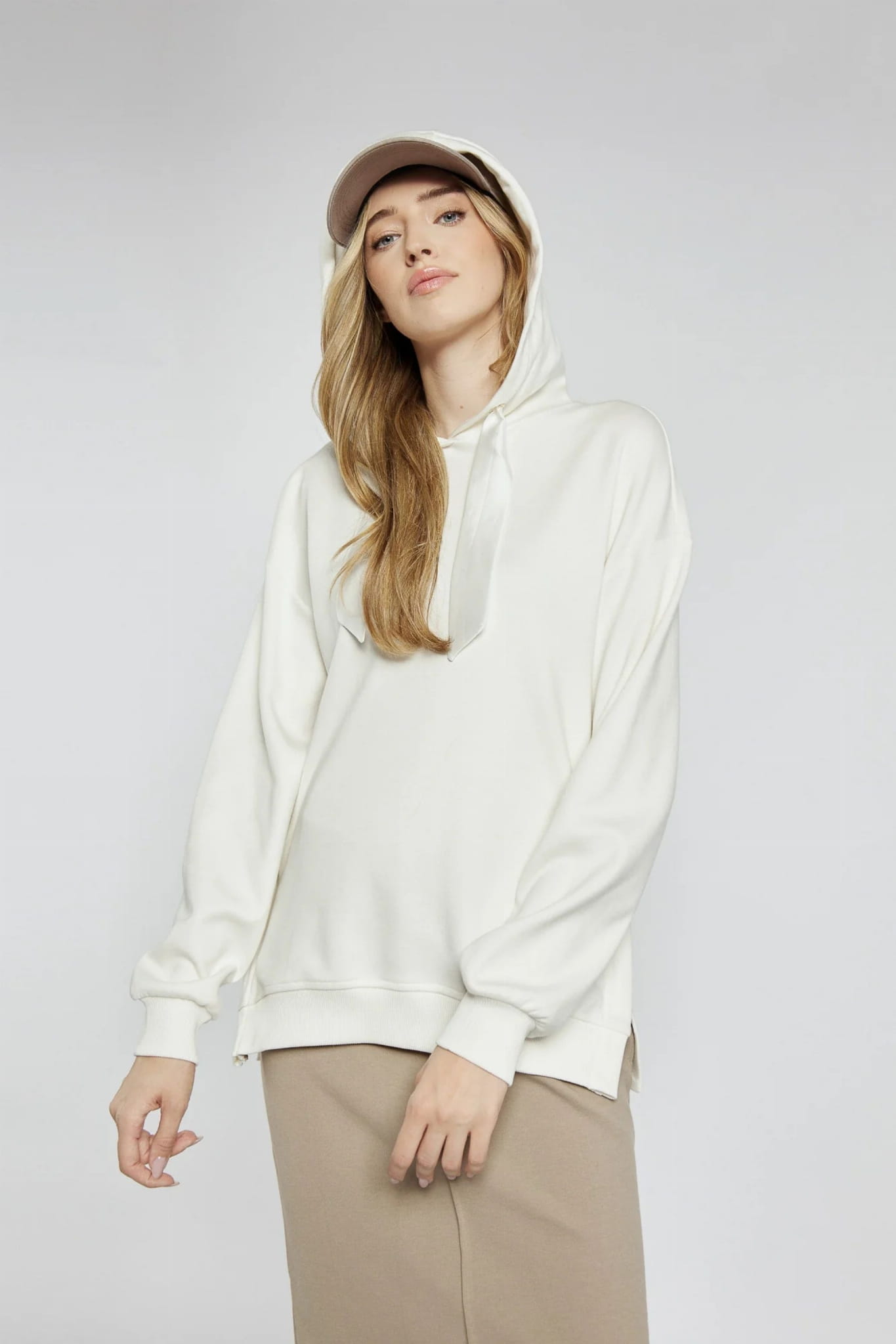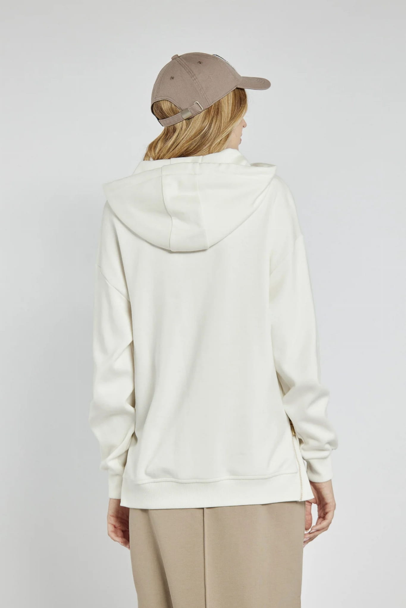 ⇒ Po bokach znajdują się suwaki, które można odpiąć, co umożliwia noszenie bluzy na różne sposoby.