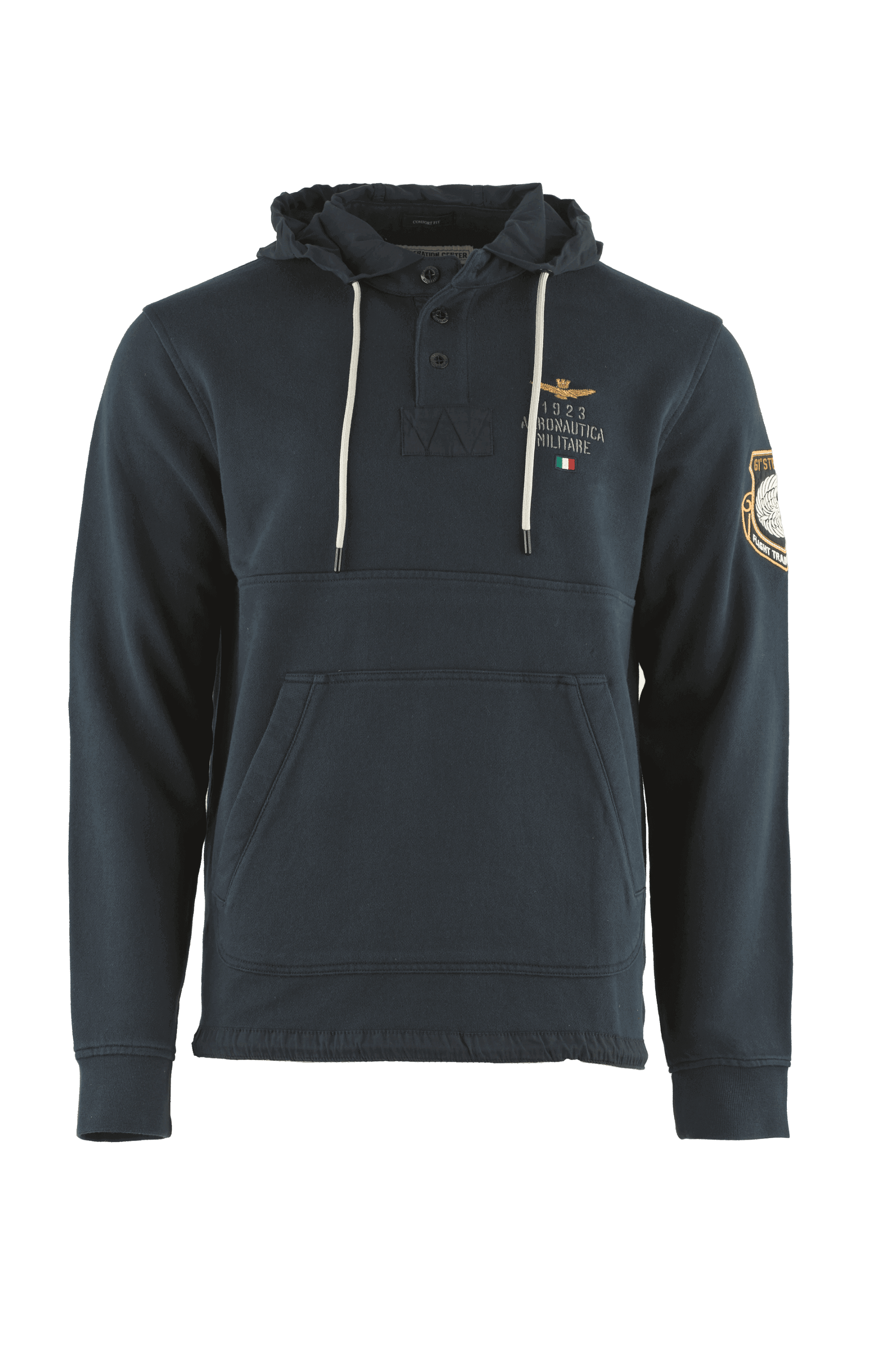 ⇒ Na wysokości klatki piersiowej znajduje się starannie wyhaftowane logo marki oraz napis „1923 Aeronautica Militare”, a także mała włoska flaga.