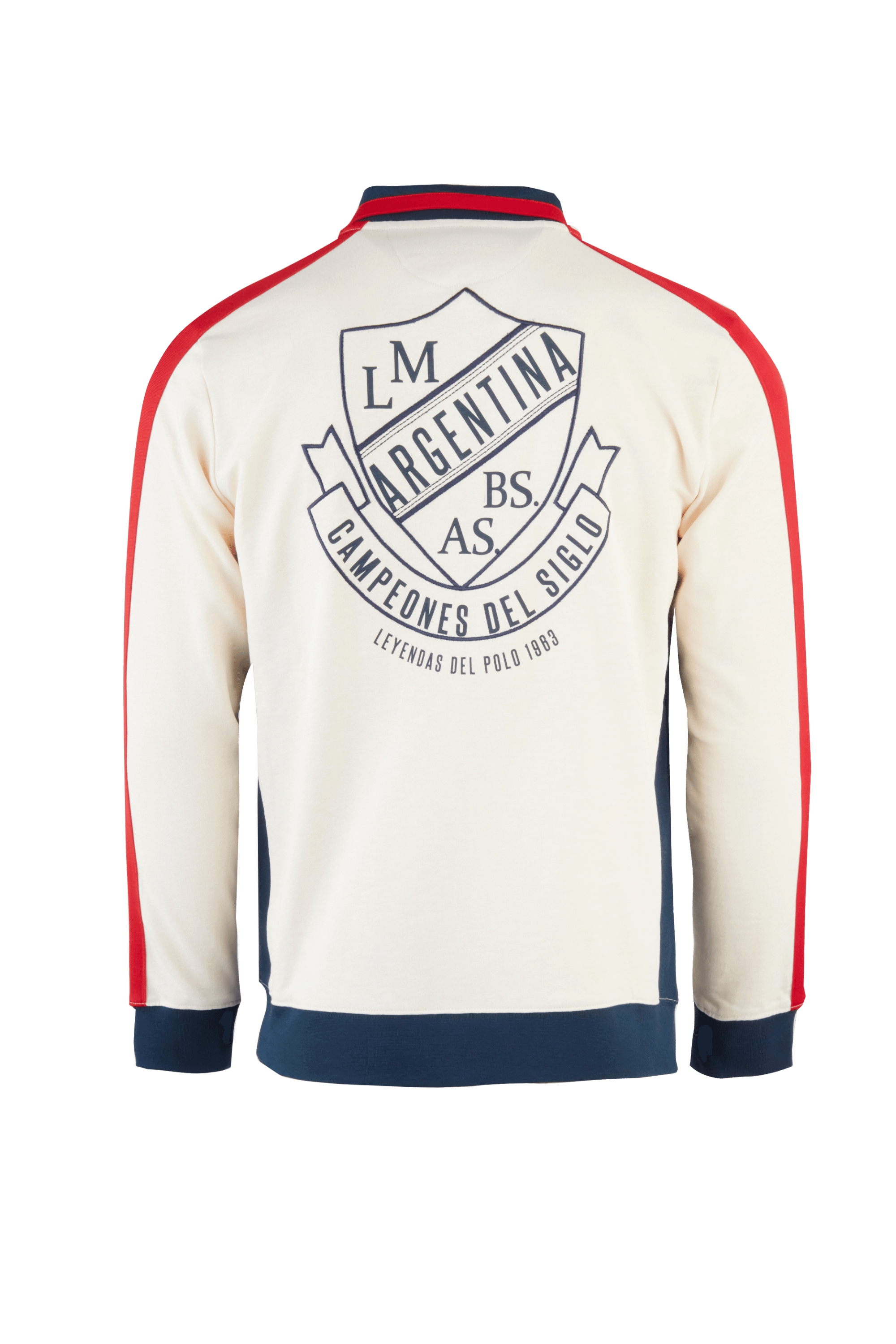 Męska bluza ze stójką marki La Martina, w kolorze kremowym z czerwonymi i granatowymi wstawkami z linii Leyendas del Polo.