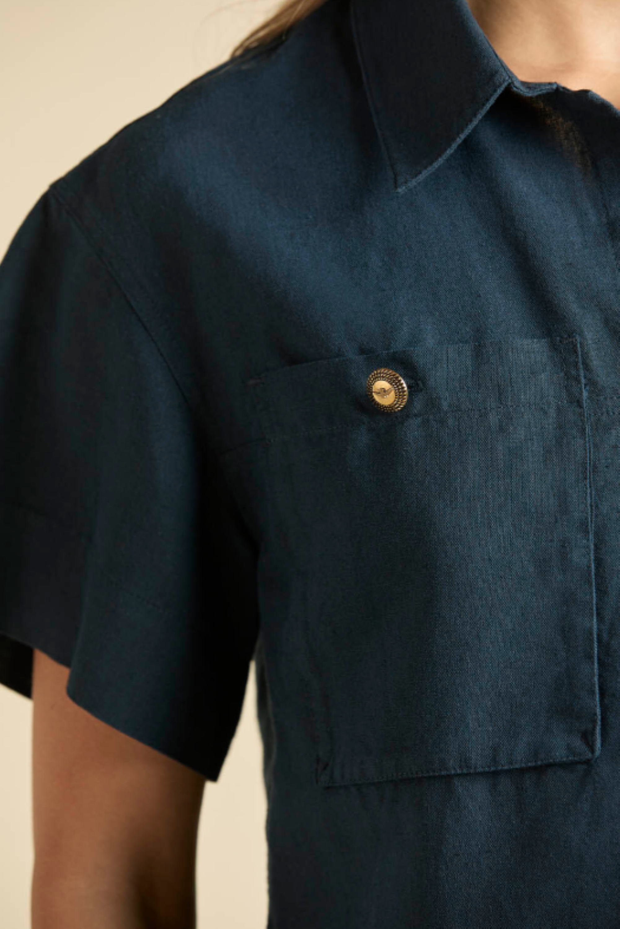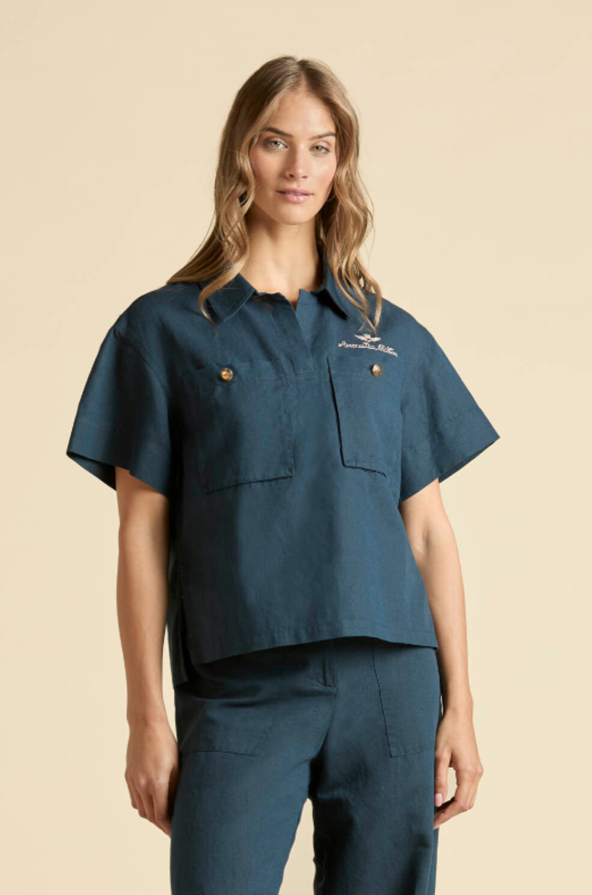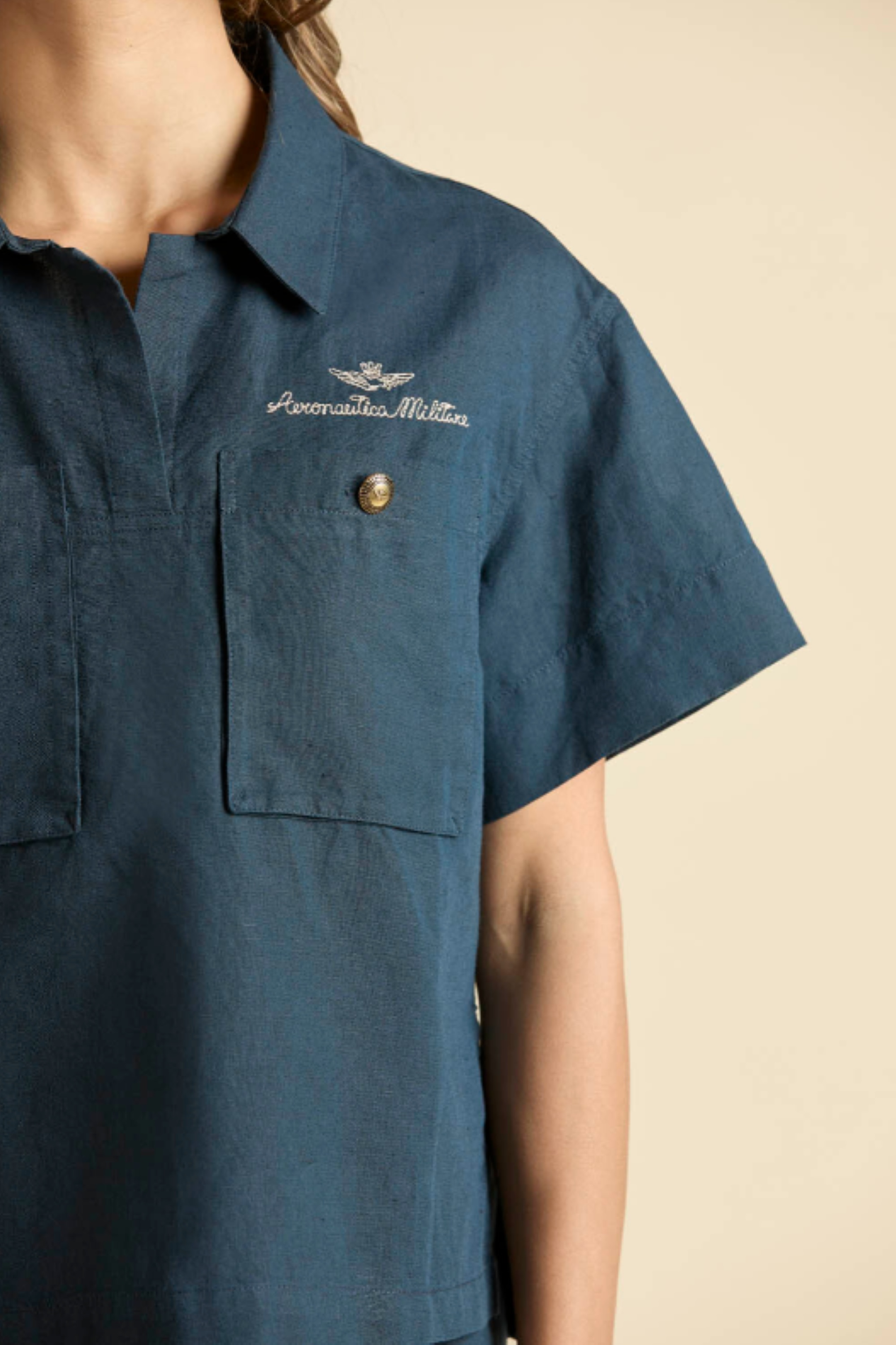 Damska lniana koszula z krótkim rękawem marki Aeronautica Militare, w kolorze granatowym.