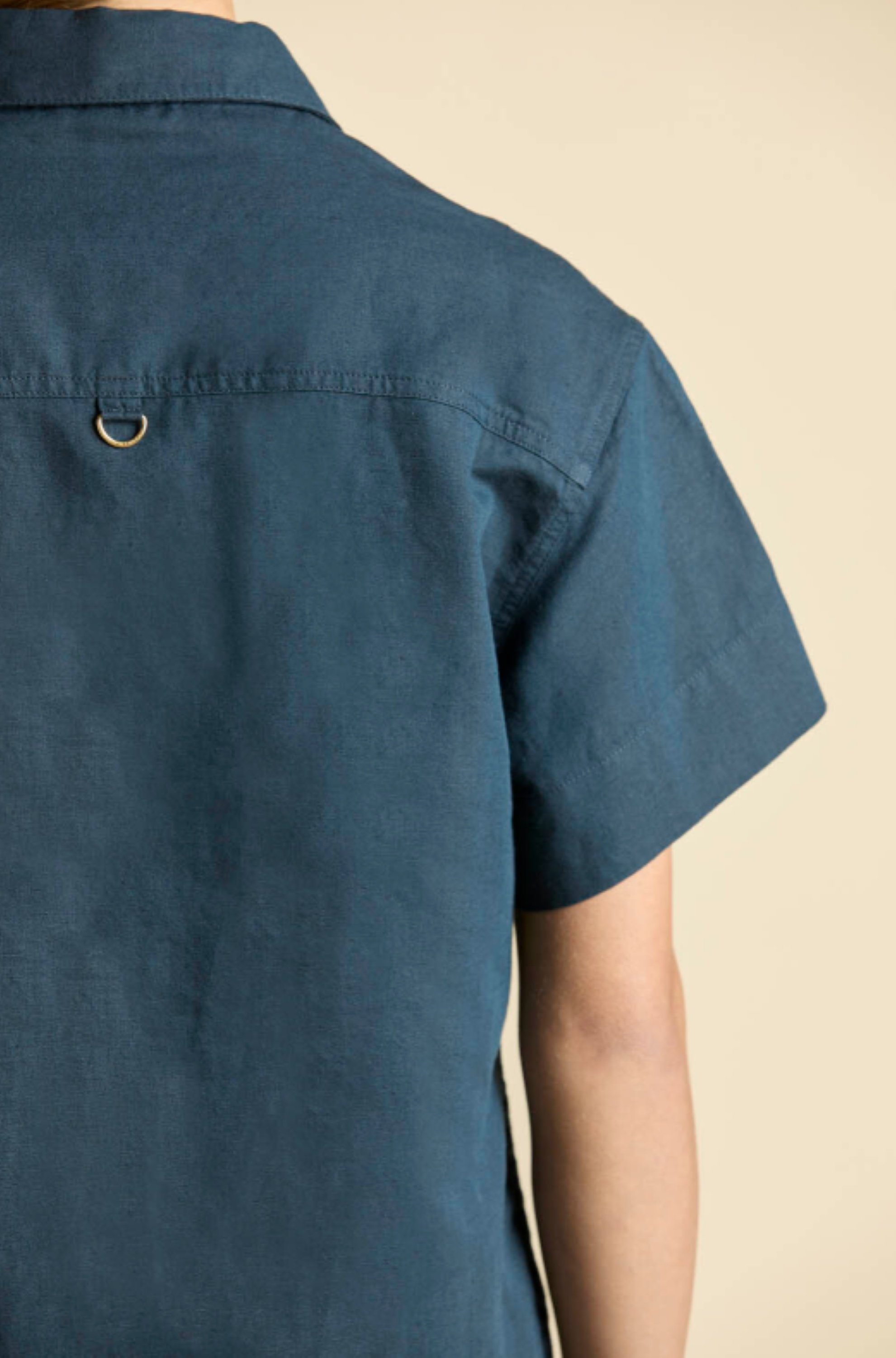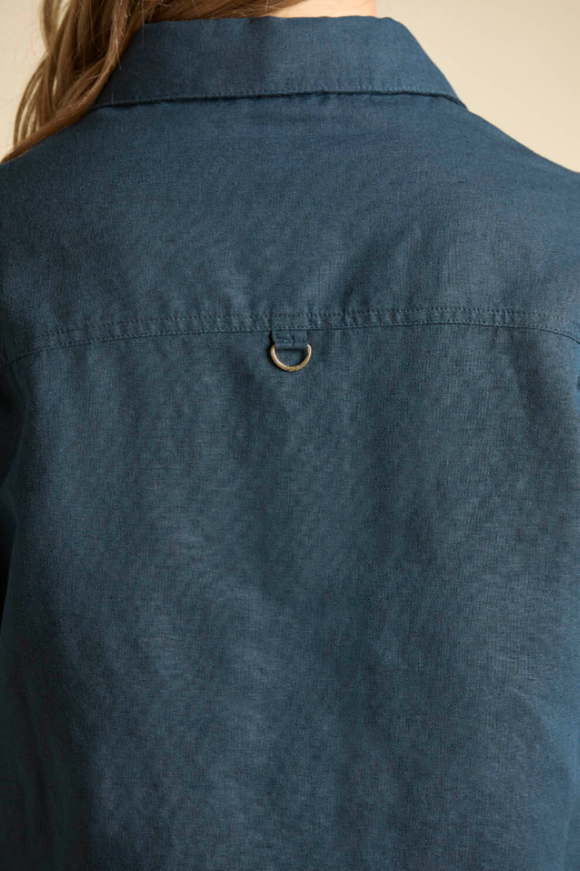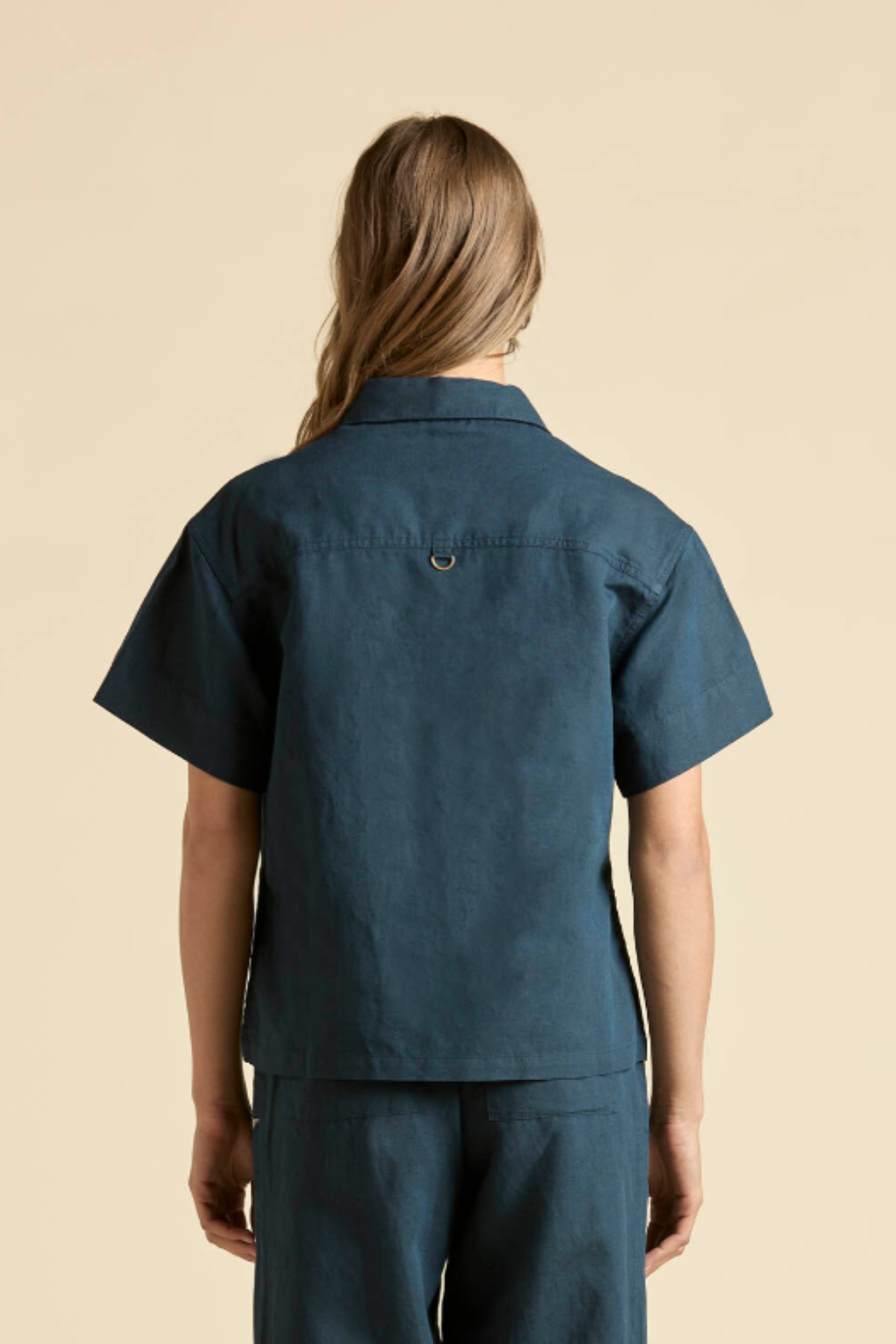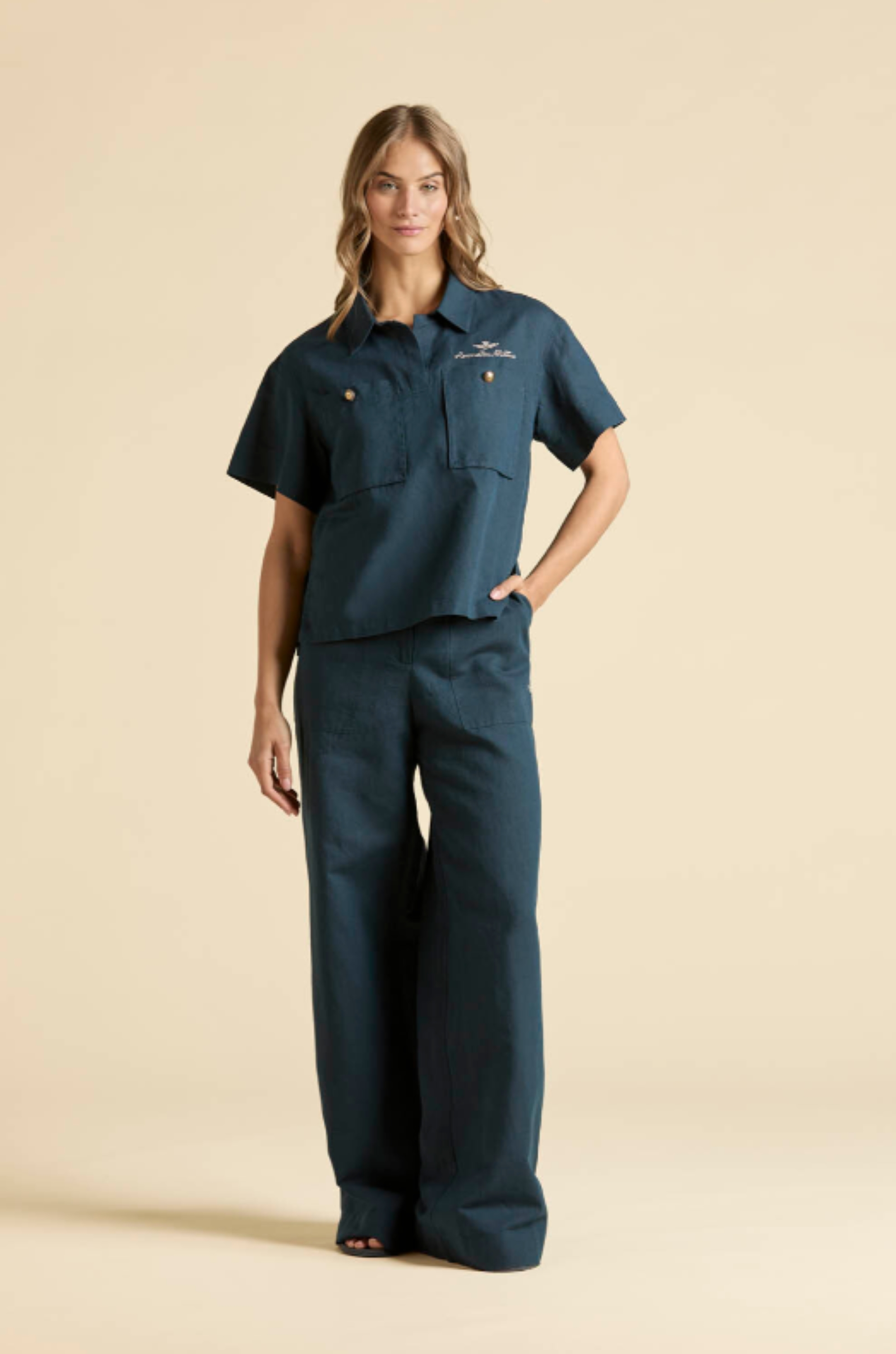 Damska lniana koszula z krótkim rękawem marki Aeronautica Militare, w kolorze granatowym.