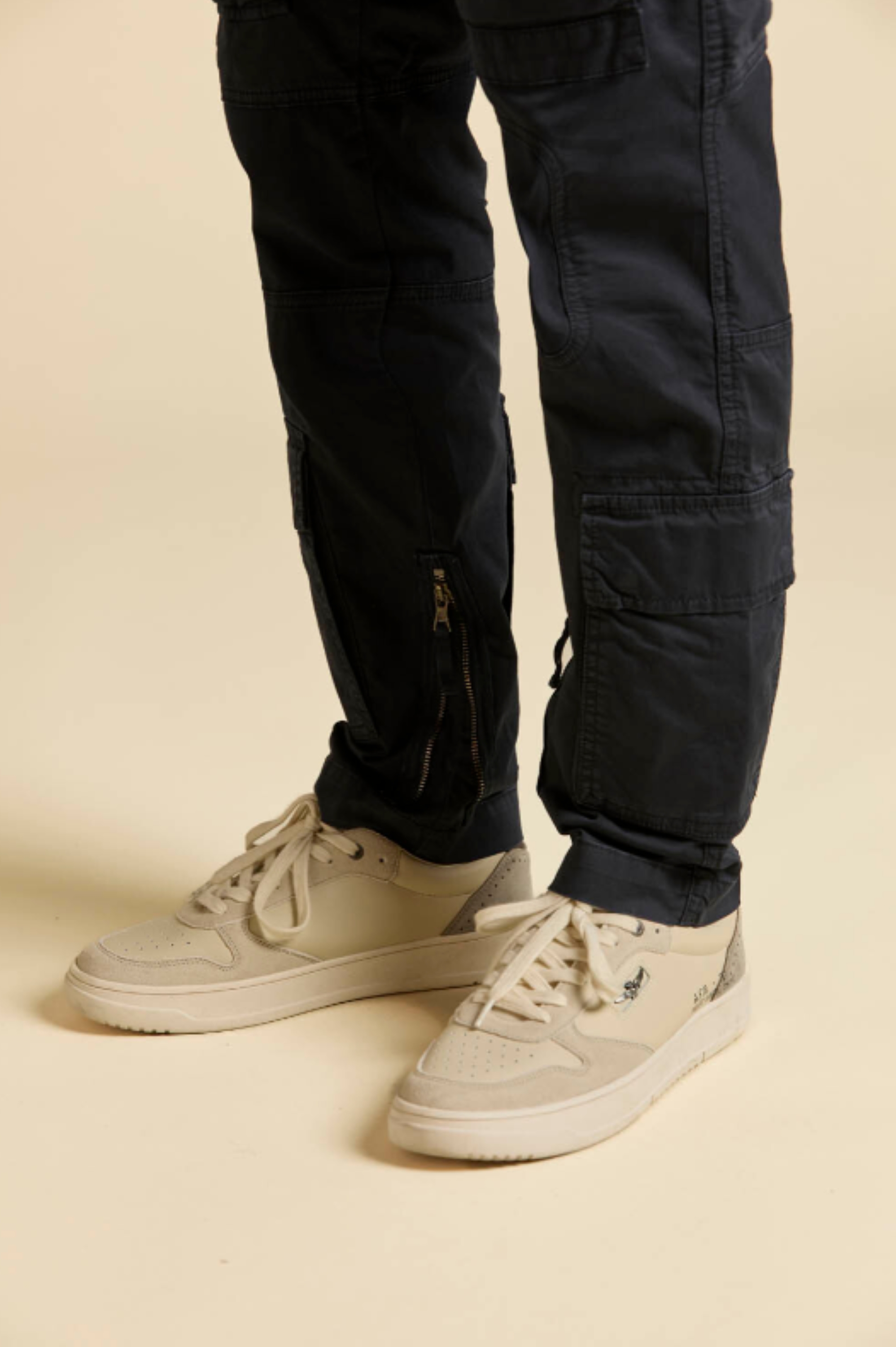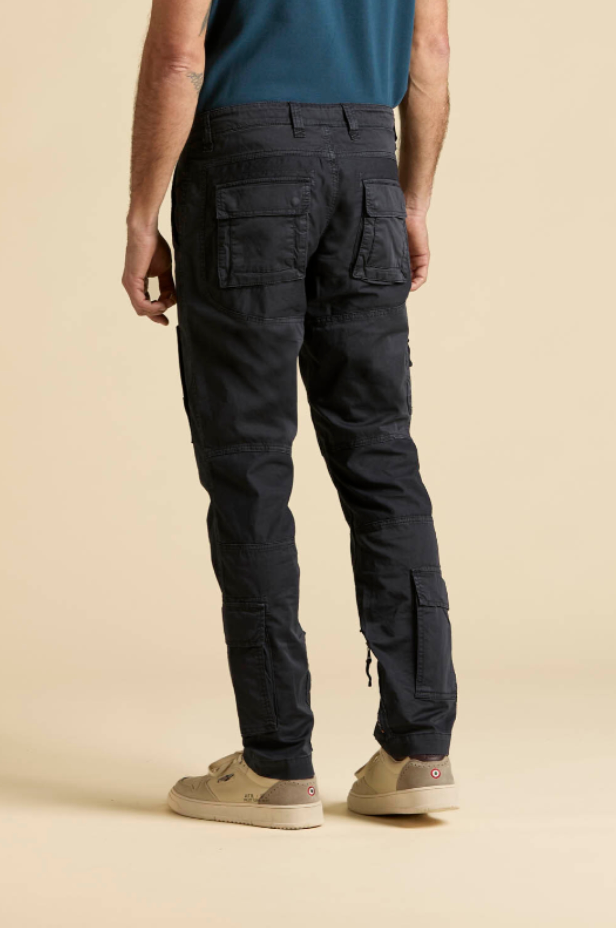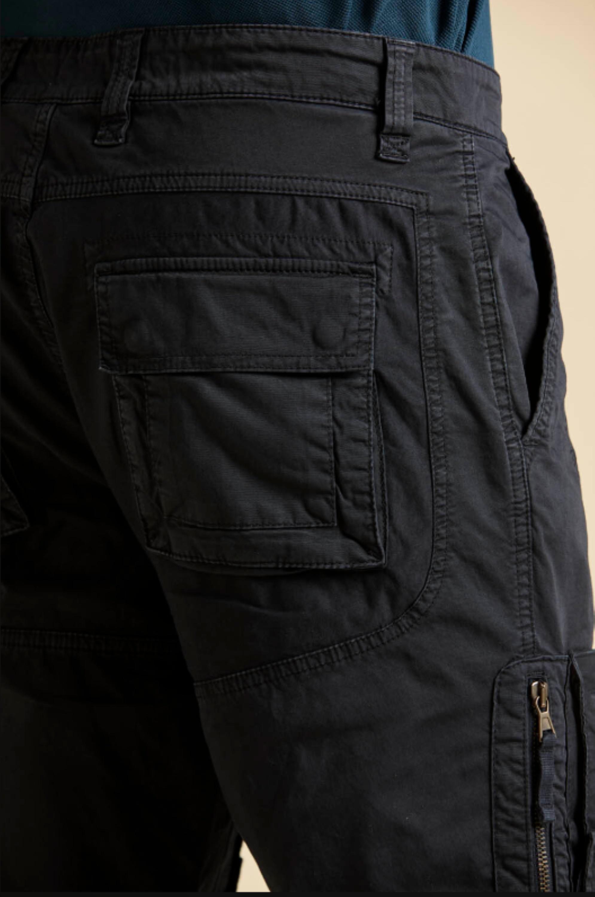 ⇒ Dwie wpuszczane kieszenie boczne oraz dwie z tyłu z patkami zapinane na zatrzaski. Dodatkowe kieszenie są na wysokości łydek.