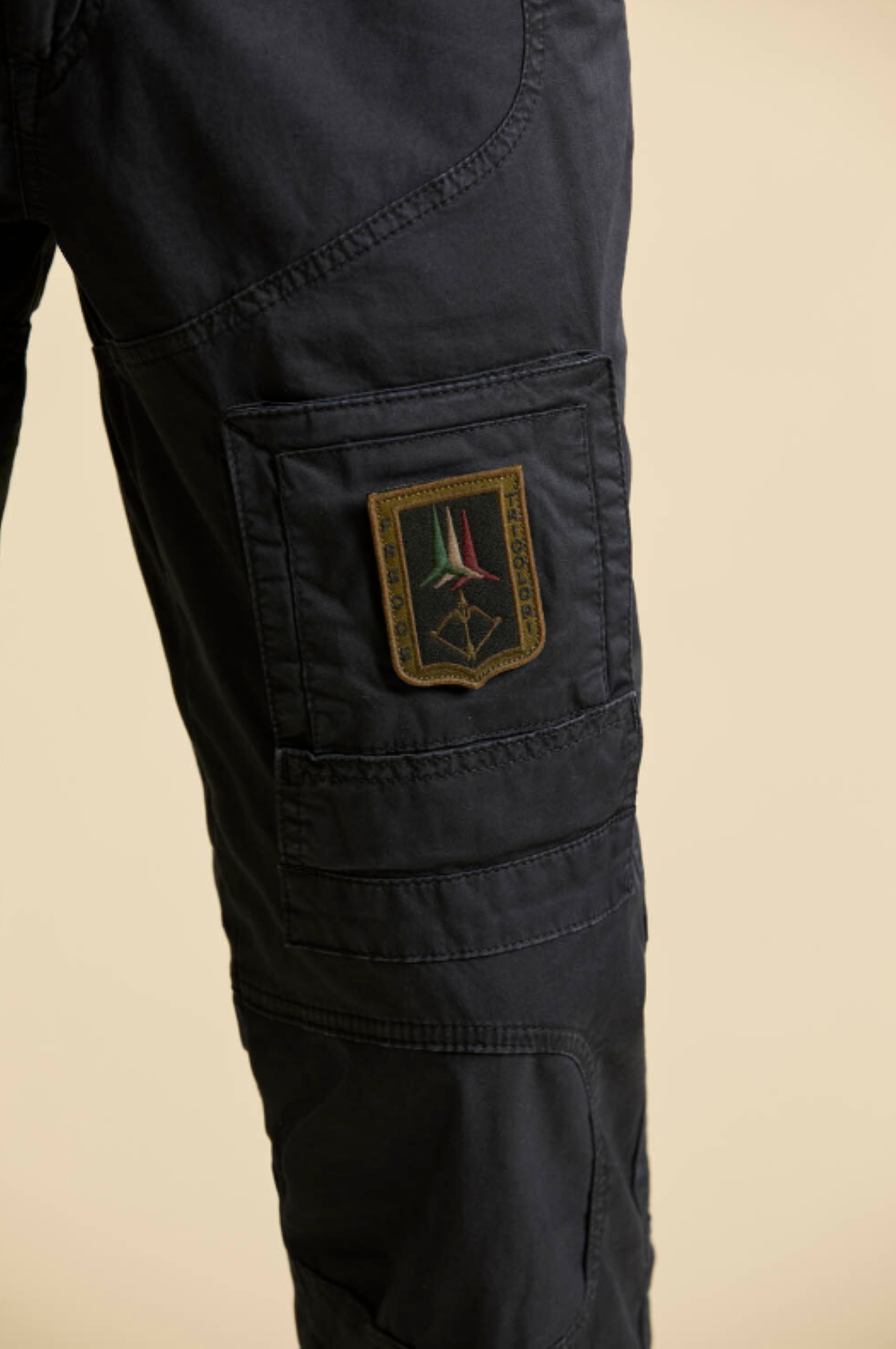 ⇒ Spodnie z przodu na nogawkach mają dwie kieszenie odwrócone do góry nogami - jest to element charakterystyczny spodni Anti-G, a na nich są naszywki na rzepy "Frecce Tricolori" i "Leader".