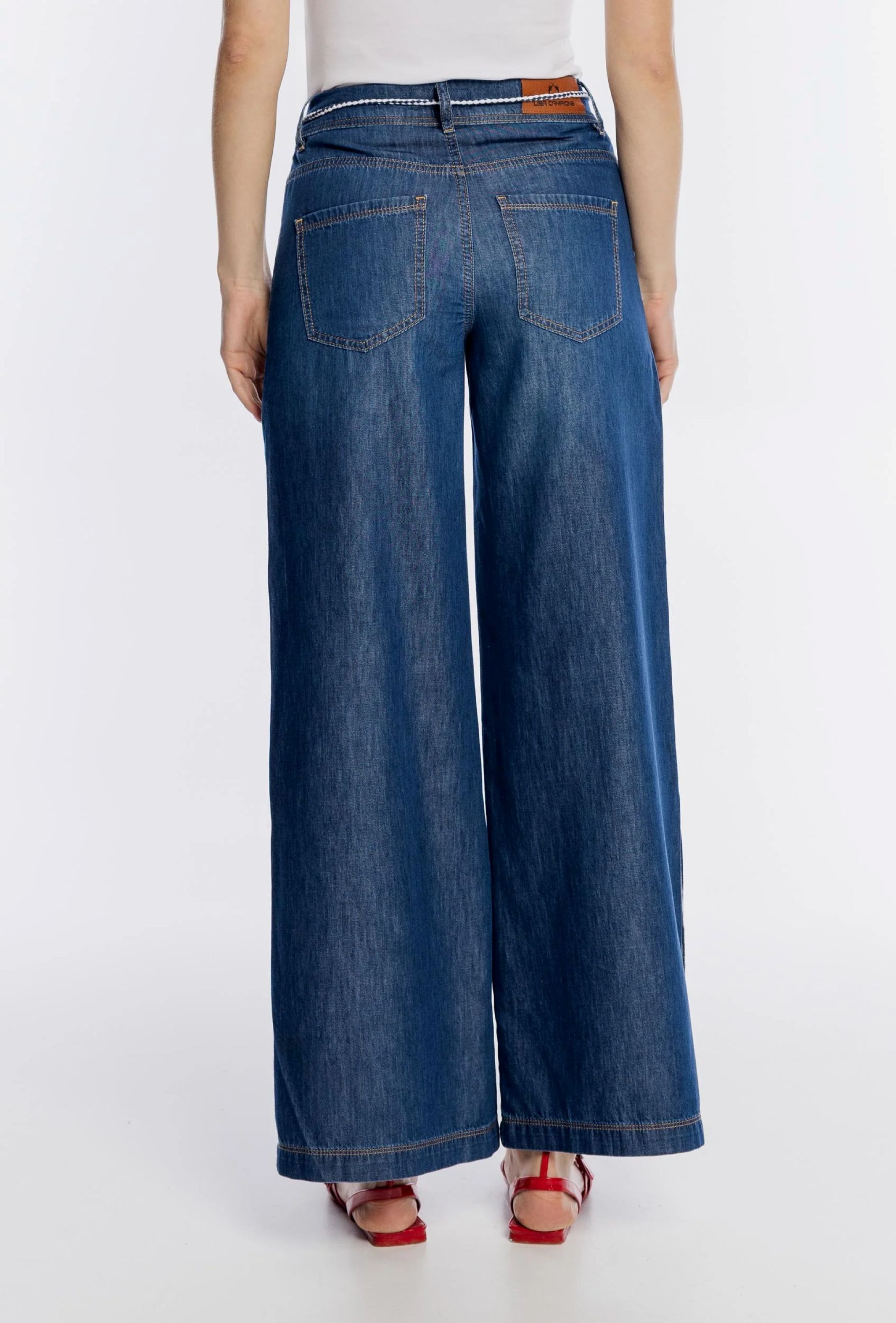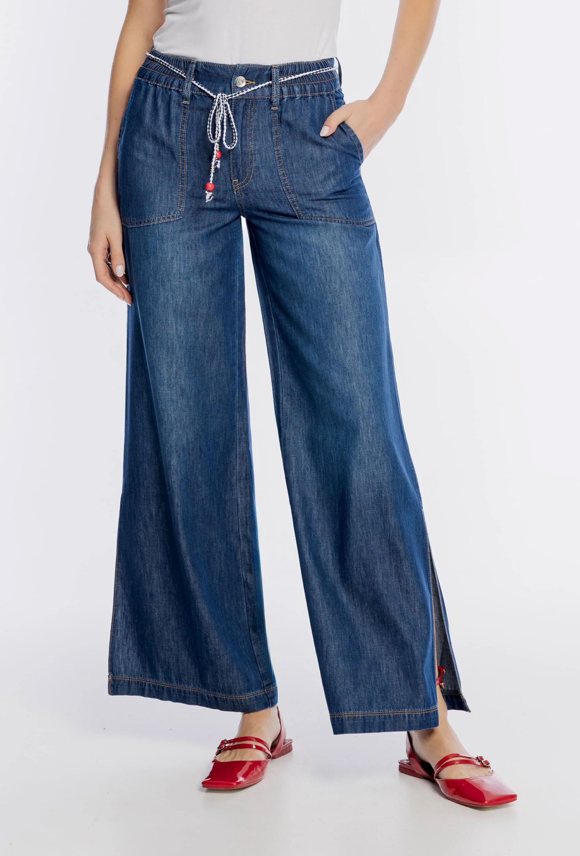 ⇒ Te spodnie charakteryzują się modnym fasonem z bardzo szerokimi nogawkami, które zapewniają swobodę i nowoczesny wygląd.
