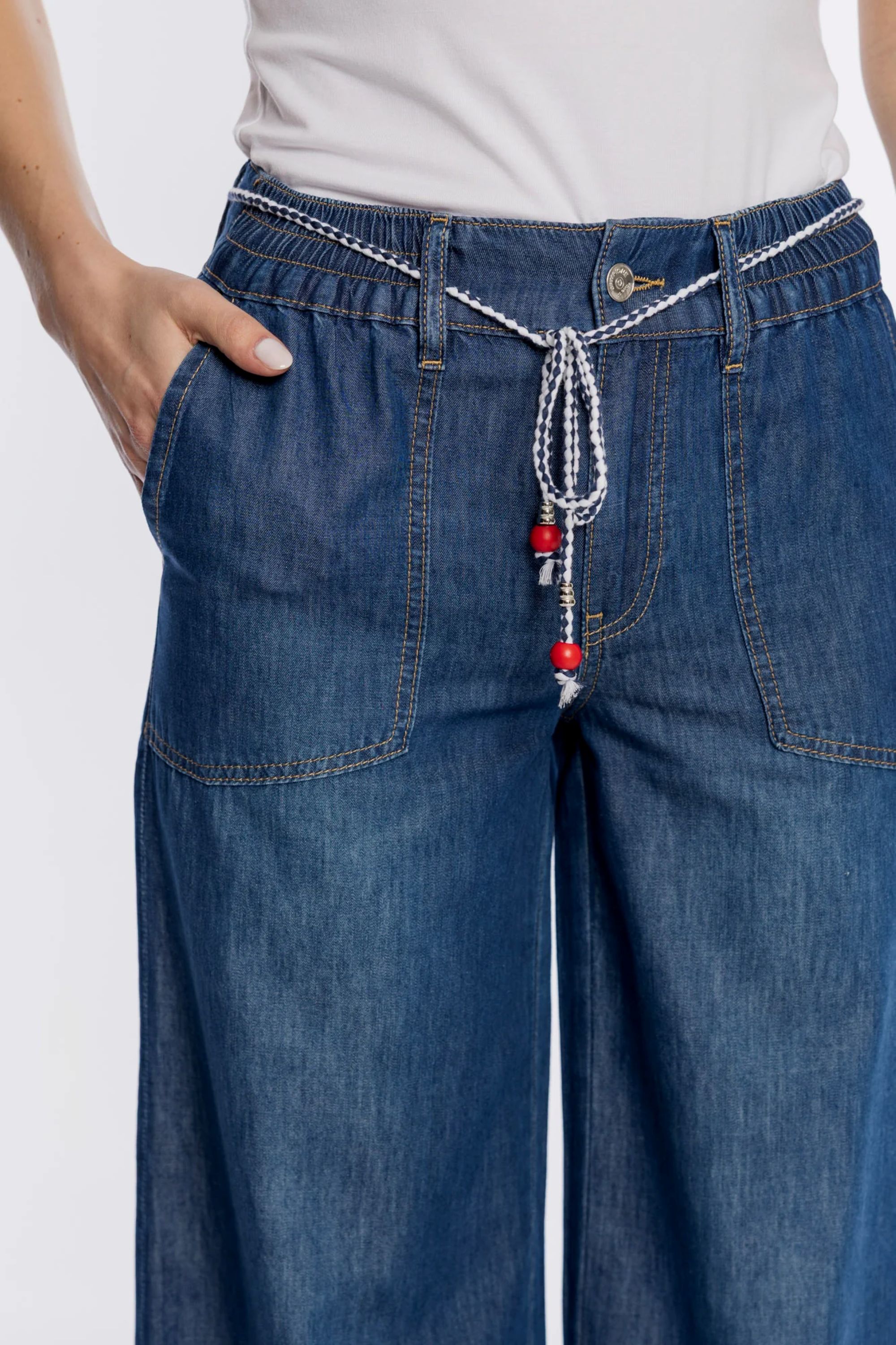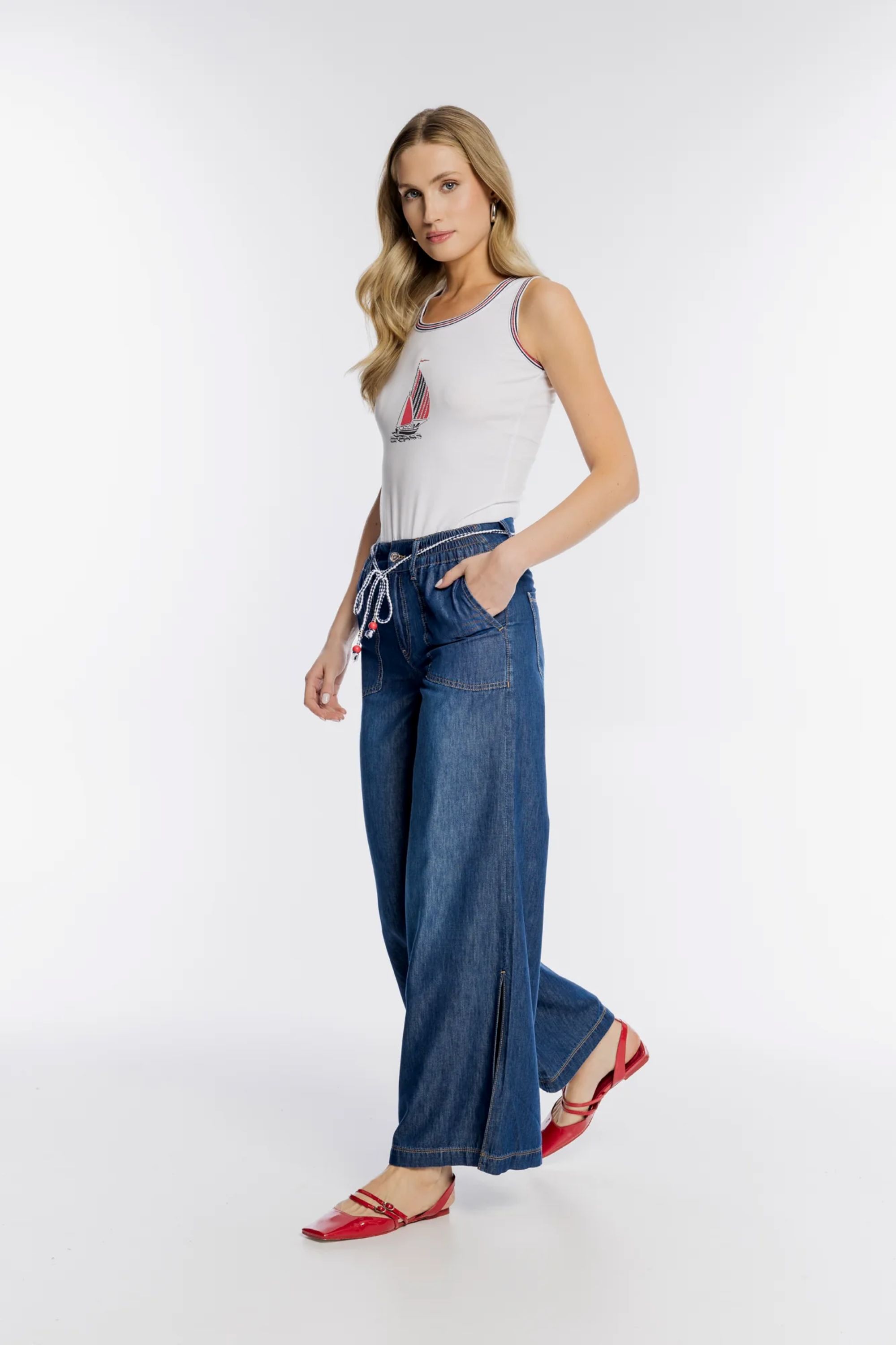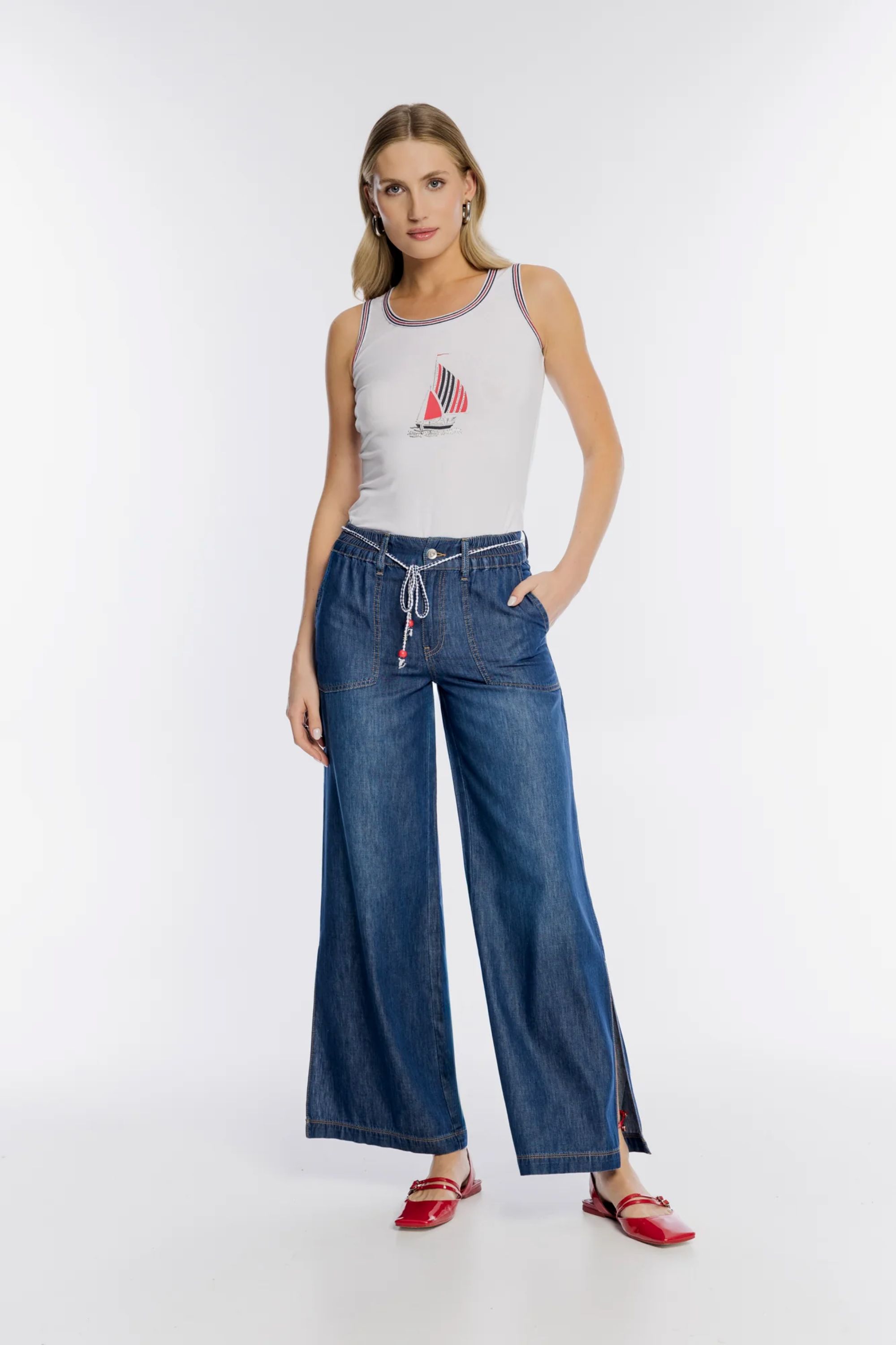 ⇒ Elastyczna talia z ozdobnym biało-granatowym sznurkiem, wykończonym czerwonymi koralikami, co podkreśla ich jachtingowy charakter.