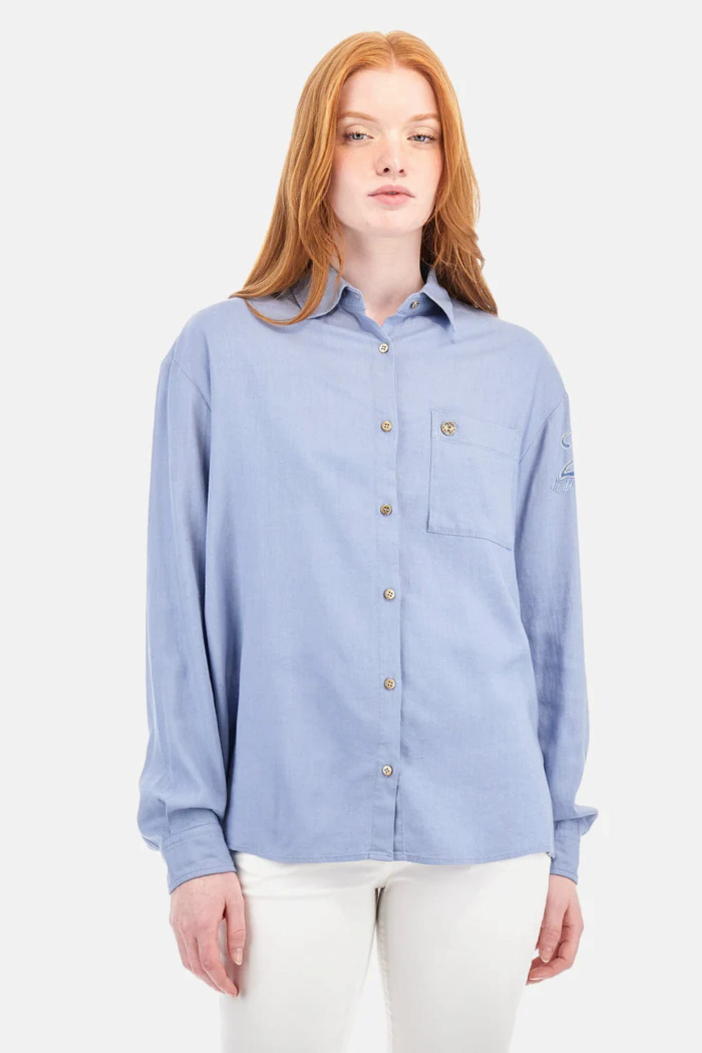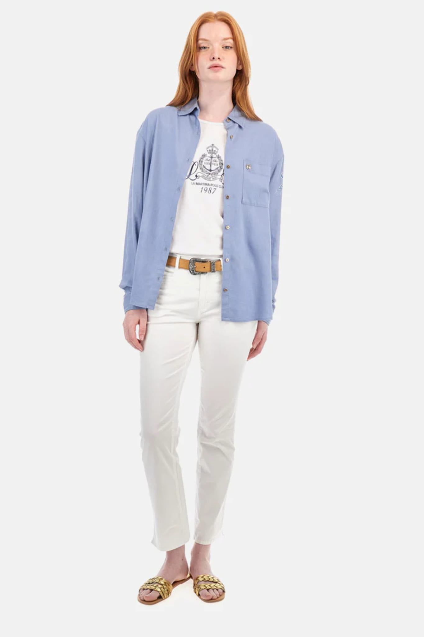 Damska koszula z długim rękawem i kołnierzykiem marki La Martina, w kolorze niebieskim.