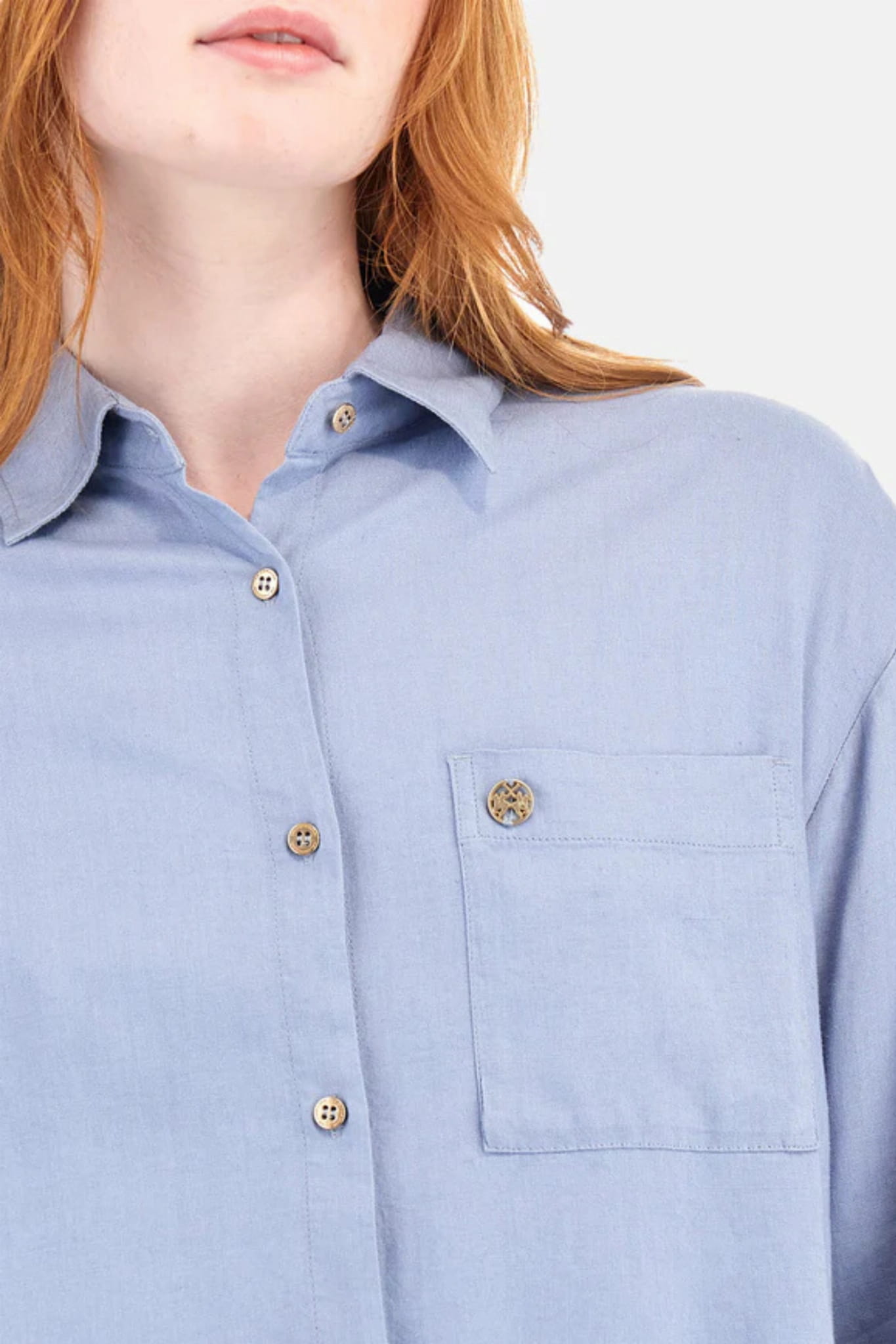 ⇒ Koszula jest zapinana na małe logowane złote guziki, podobnie mankiety.