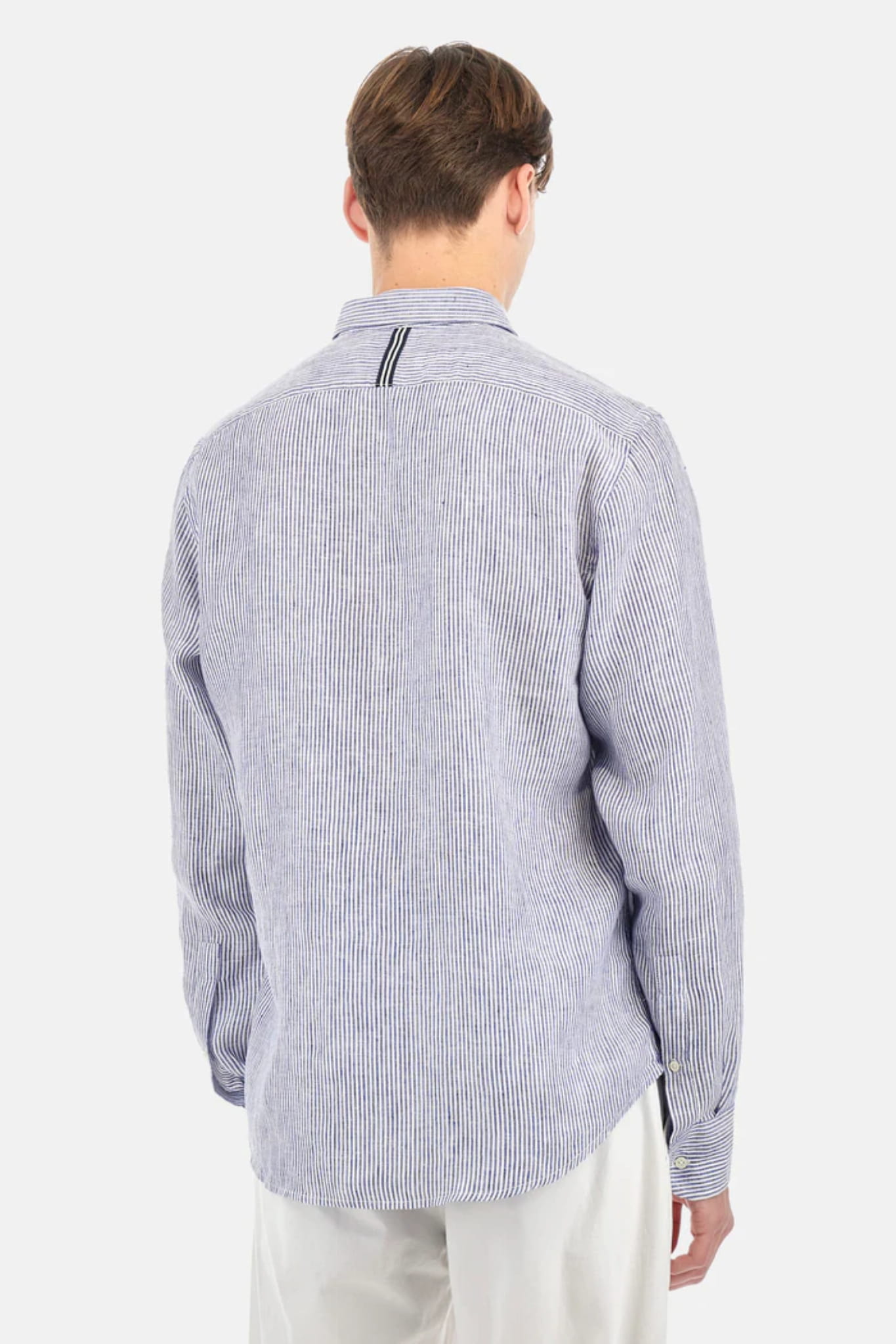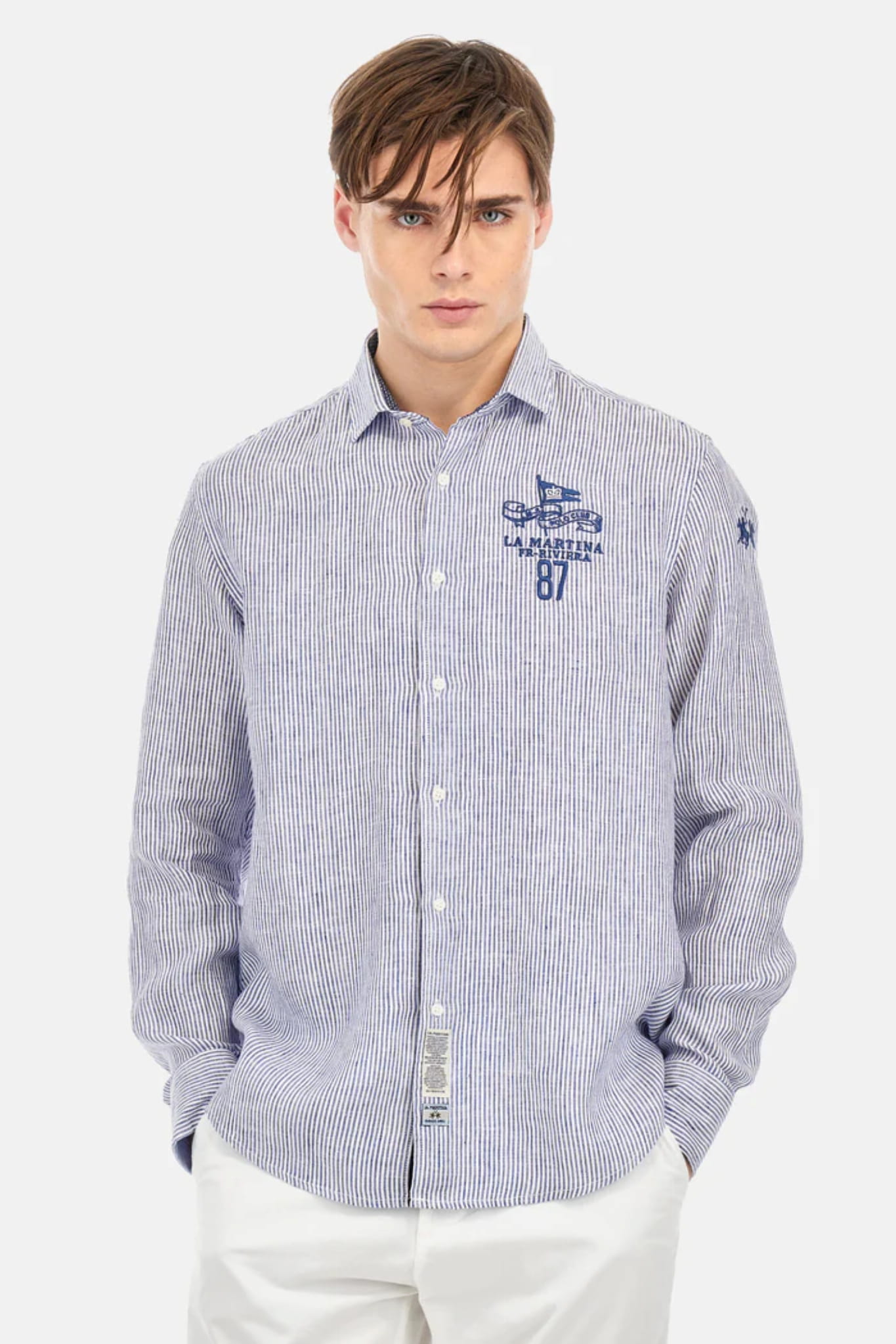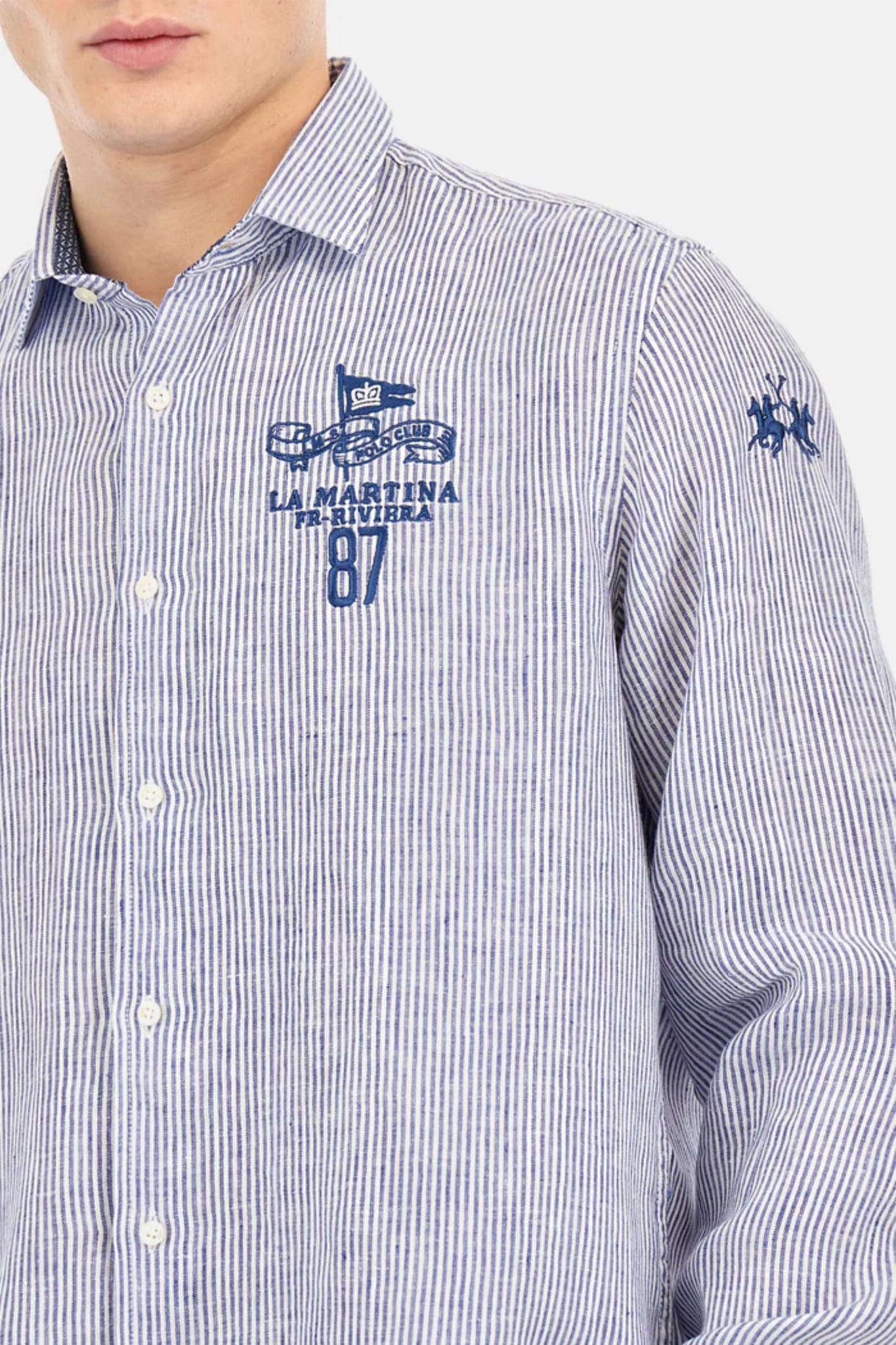 Męska koszula z długim rękawem i kołnierzykiem marki La Martina, w biało-niebieskie paski.
