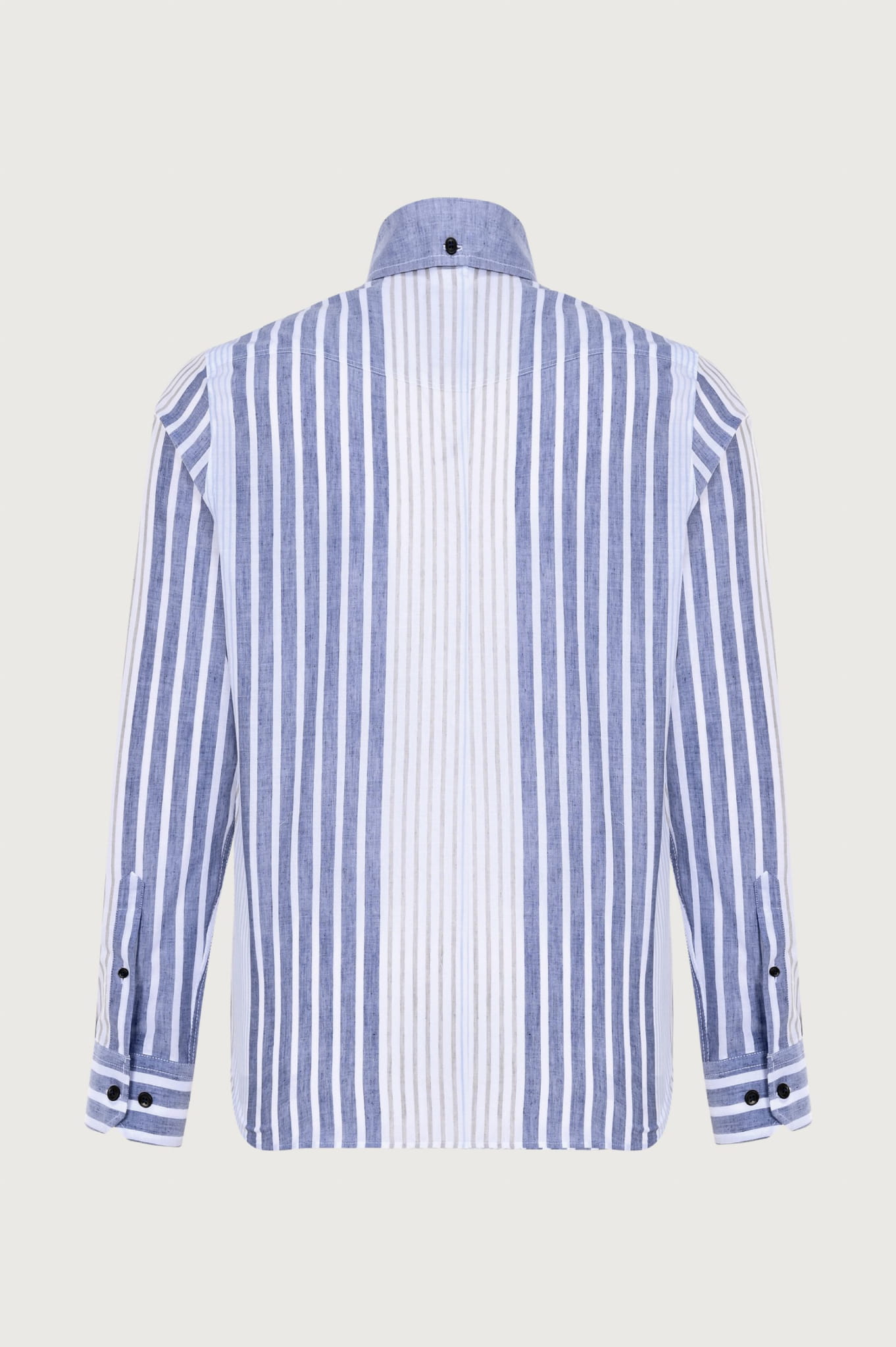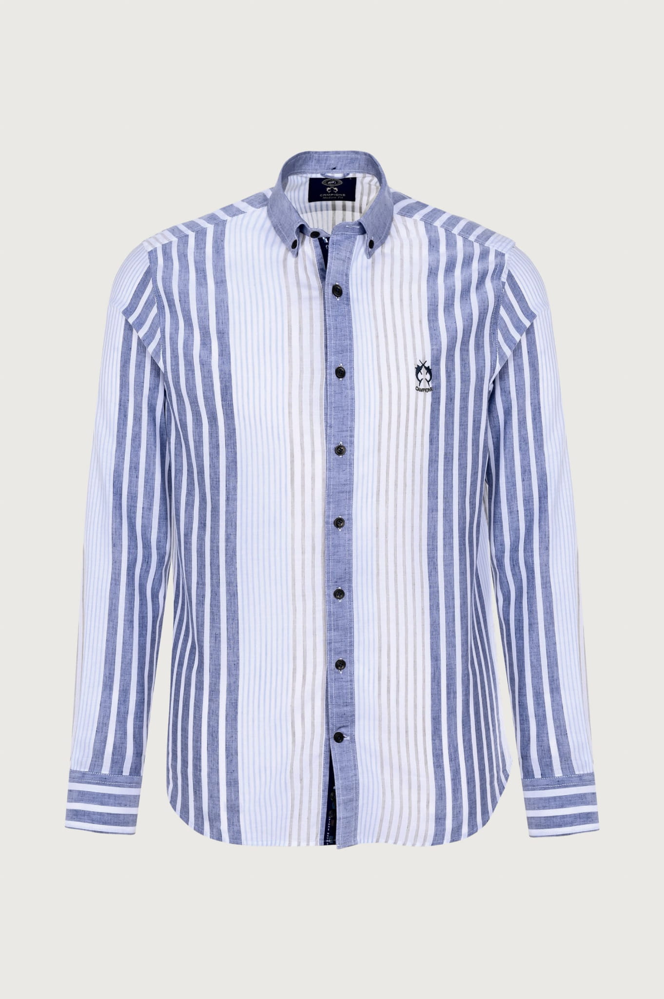 Męska koszula na długi rękaw z kołnierzykiem marki Campione, w biało-niebiesko-beżowe paski.