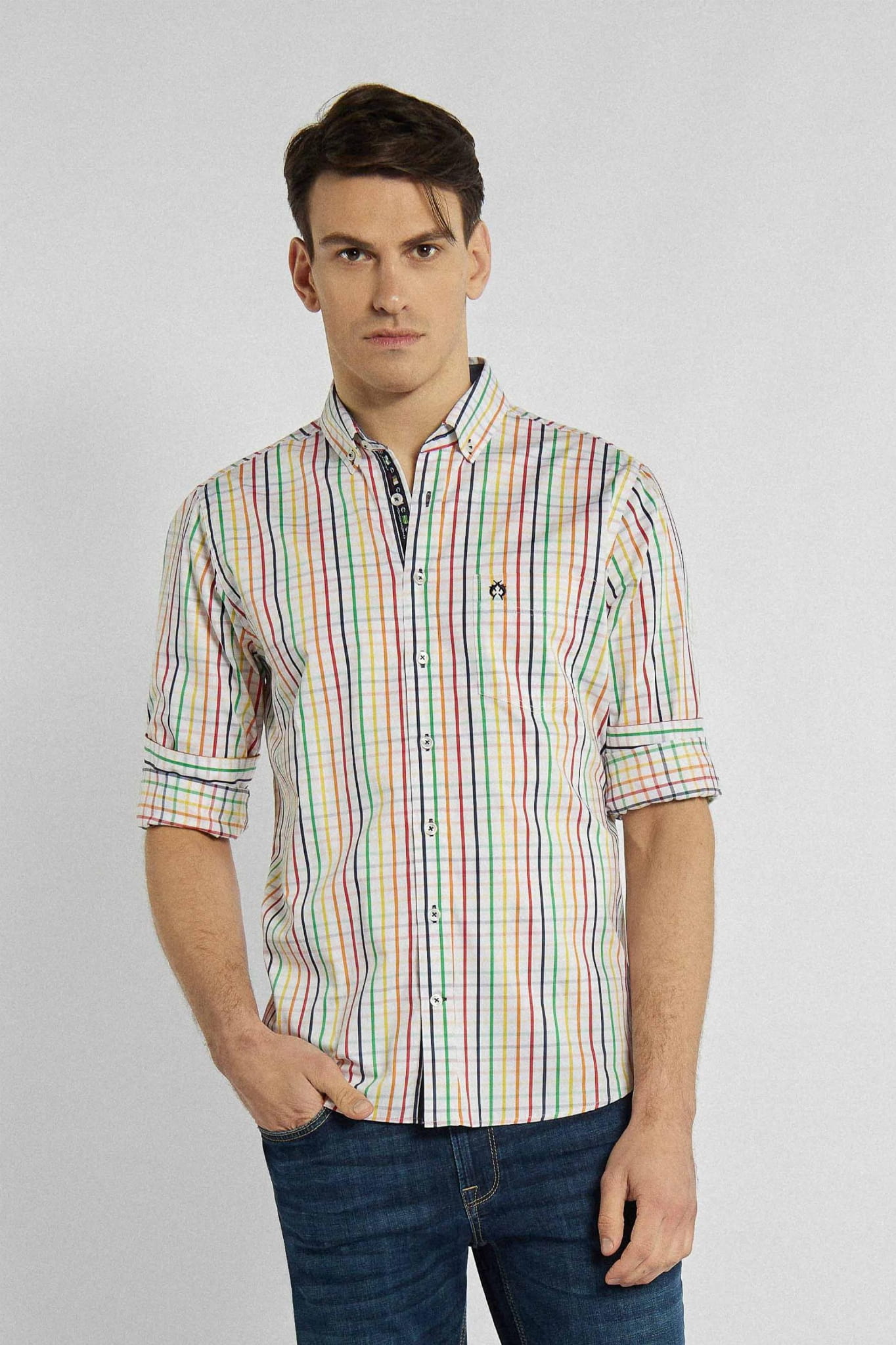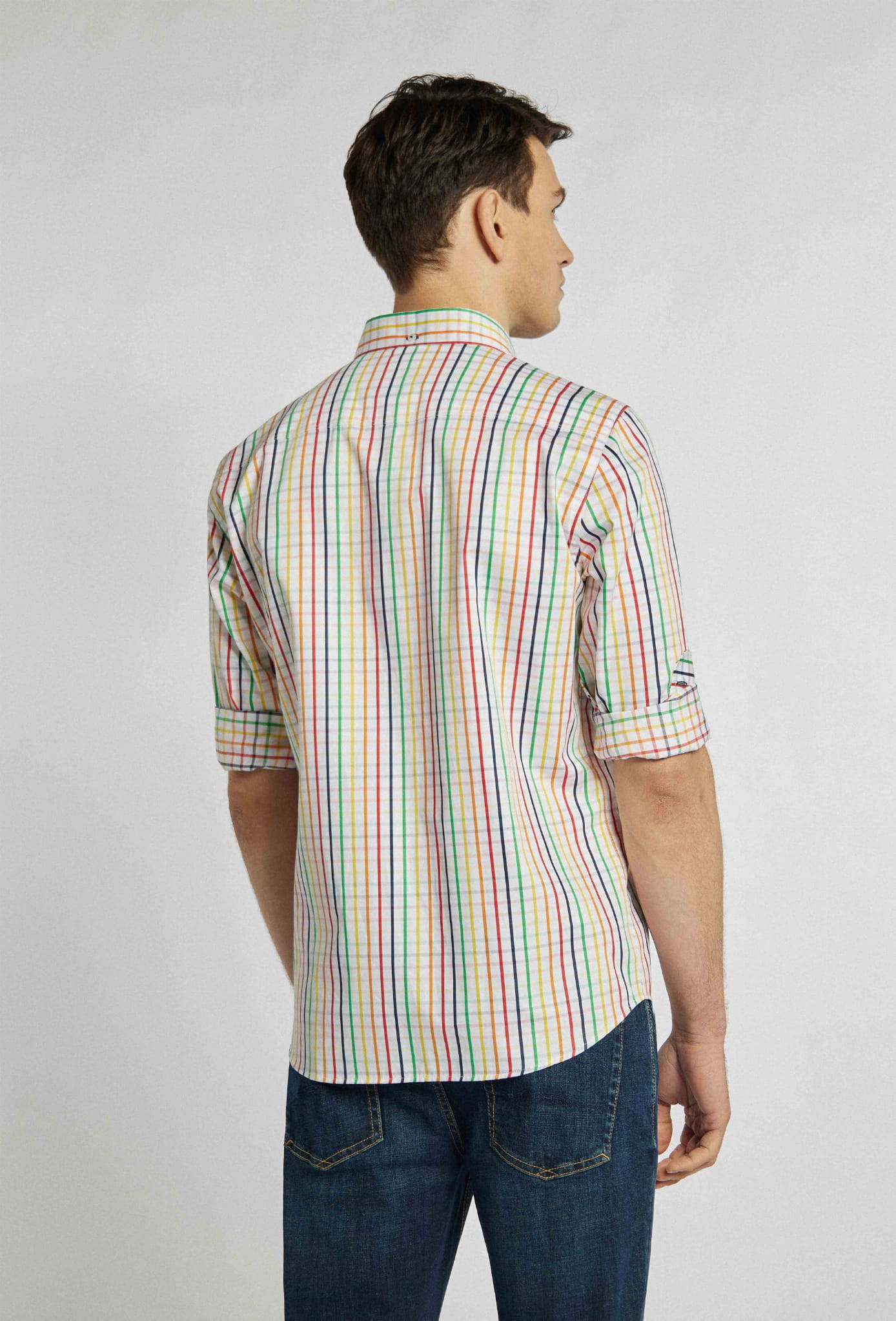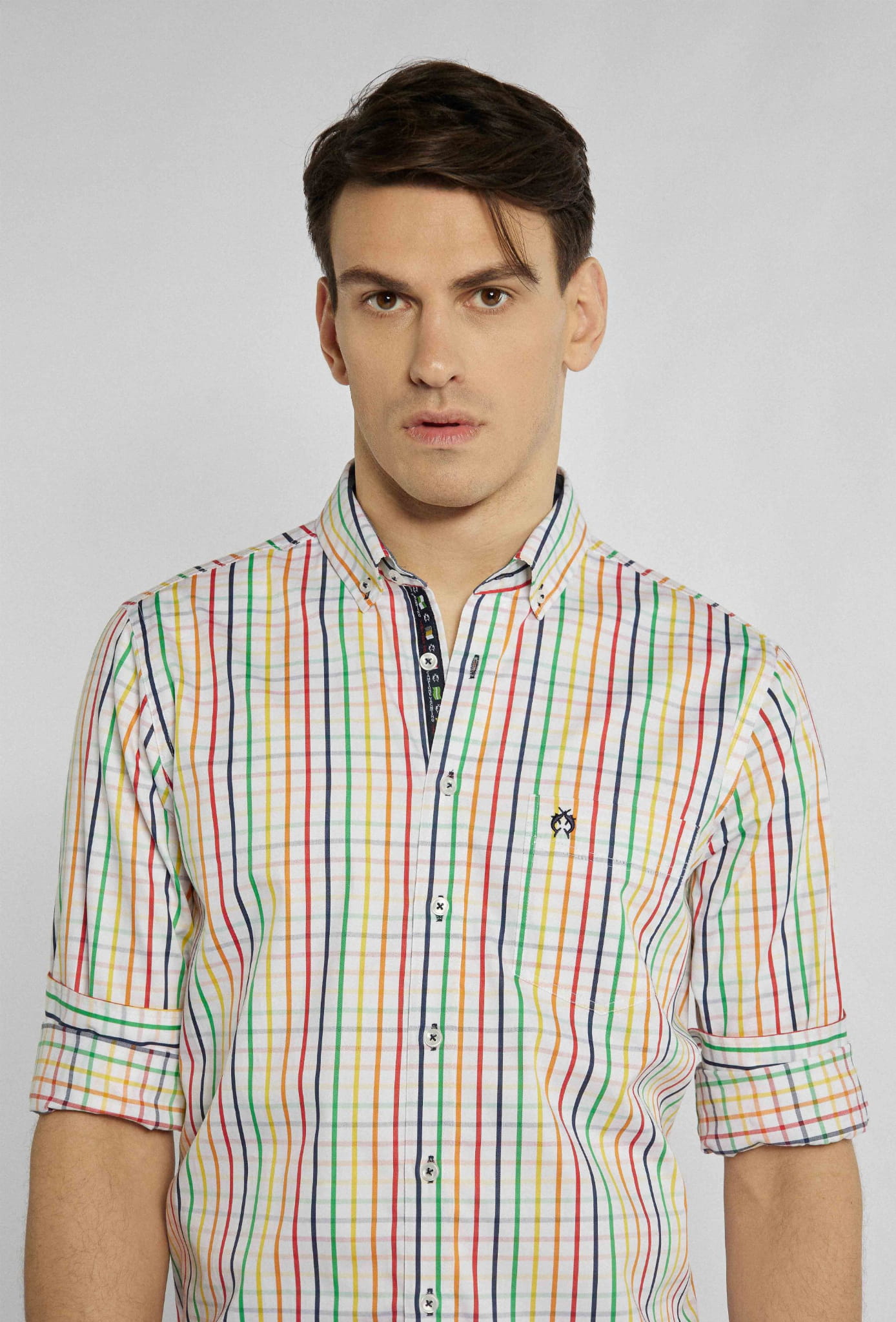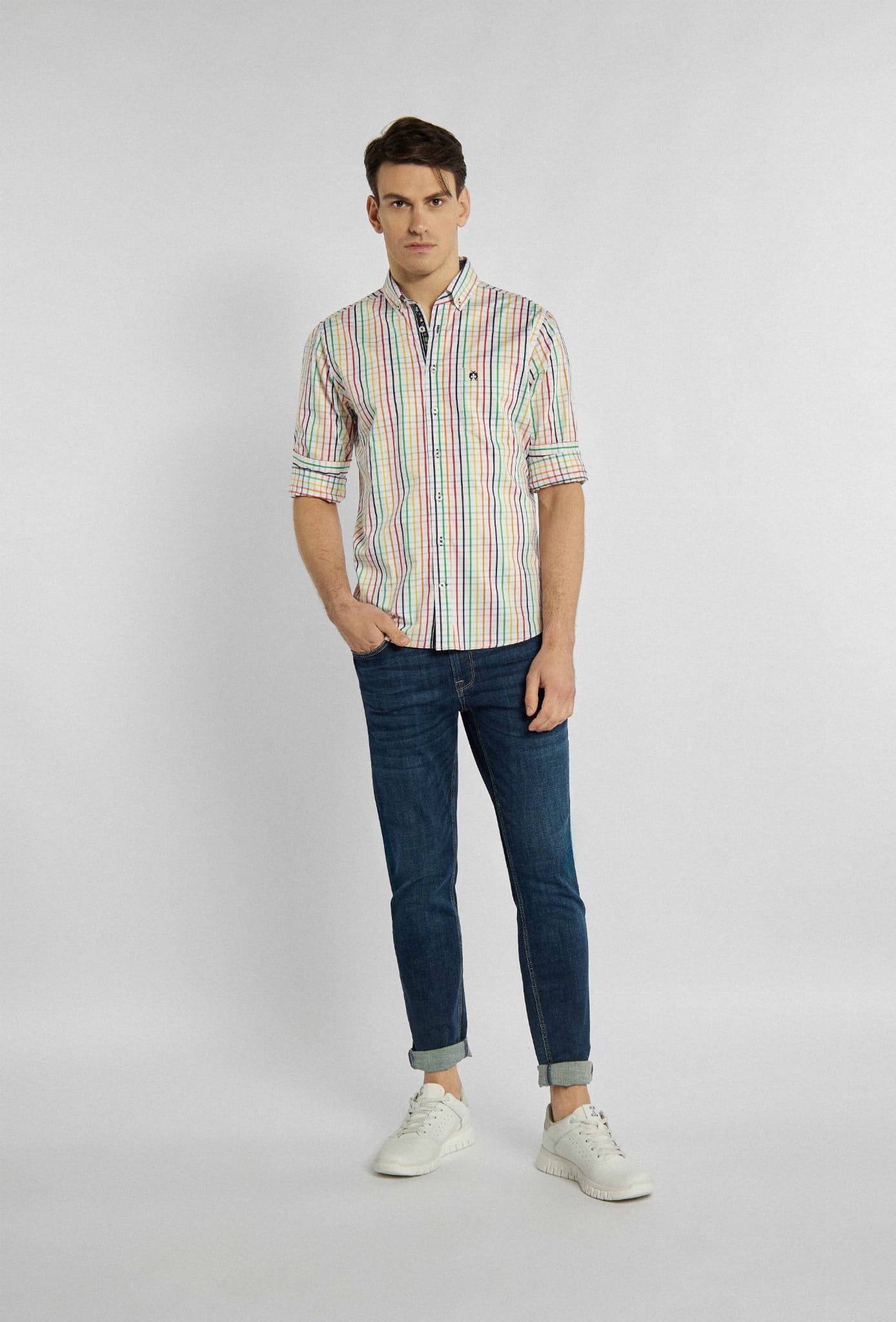 Męska koszula na długi rękaw z kołnierzykiem marki Campione, w kolorze białym w drobną kolorową kratę.