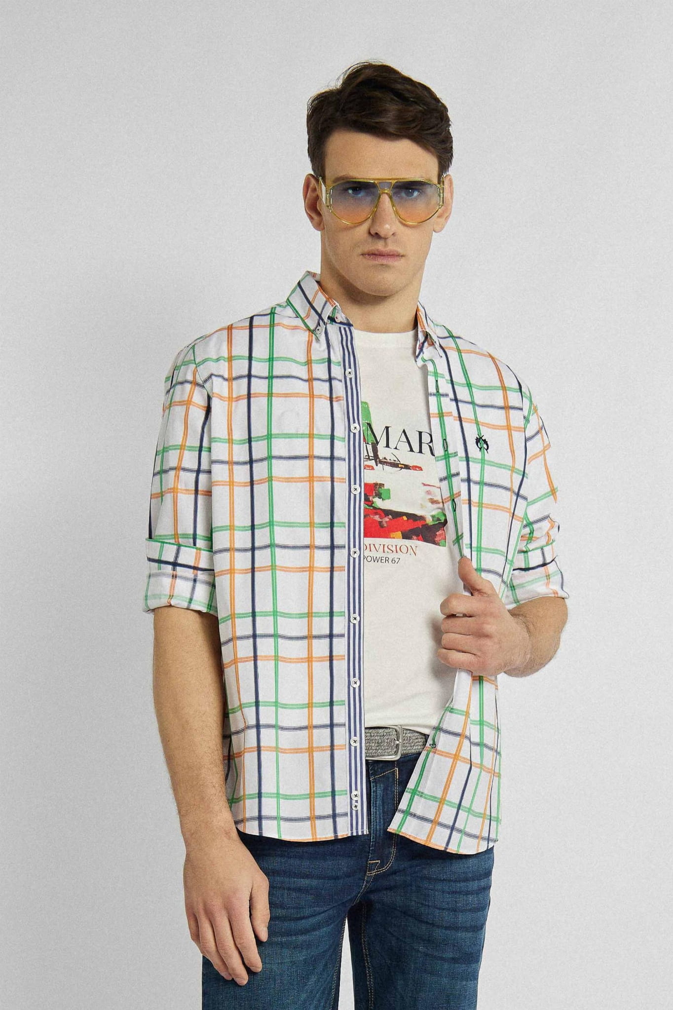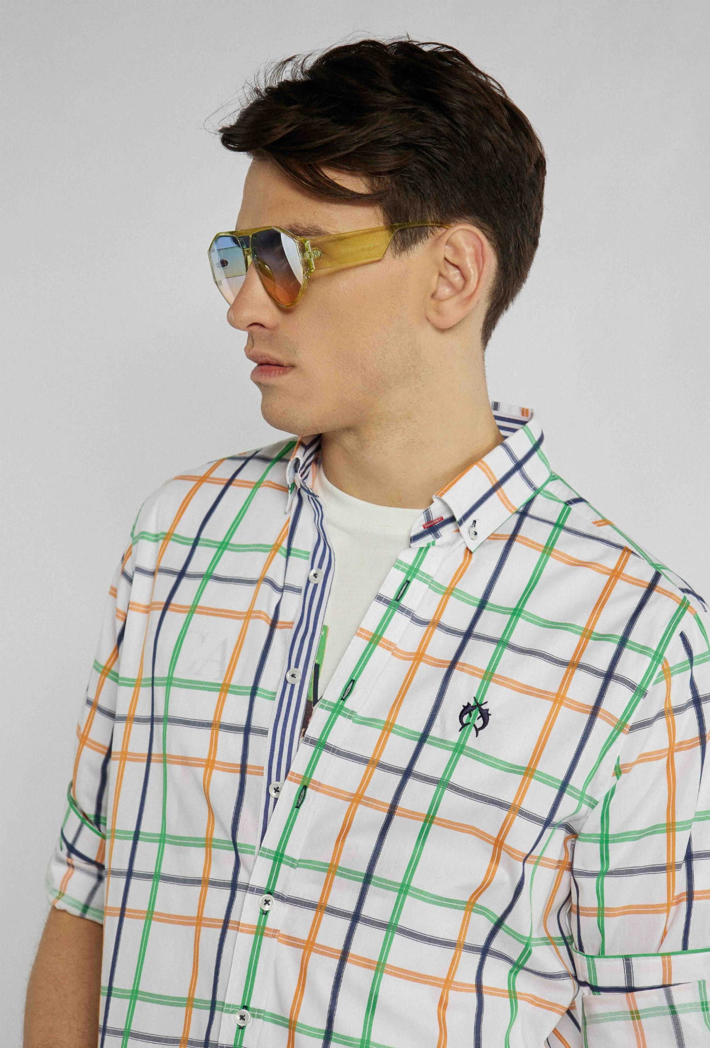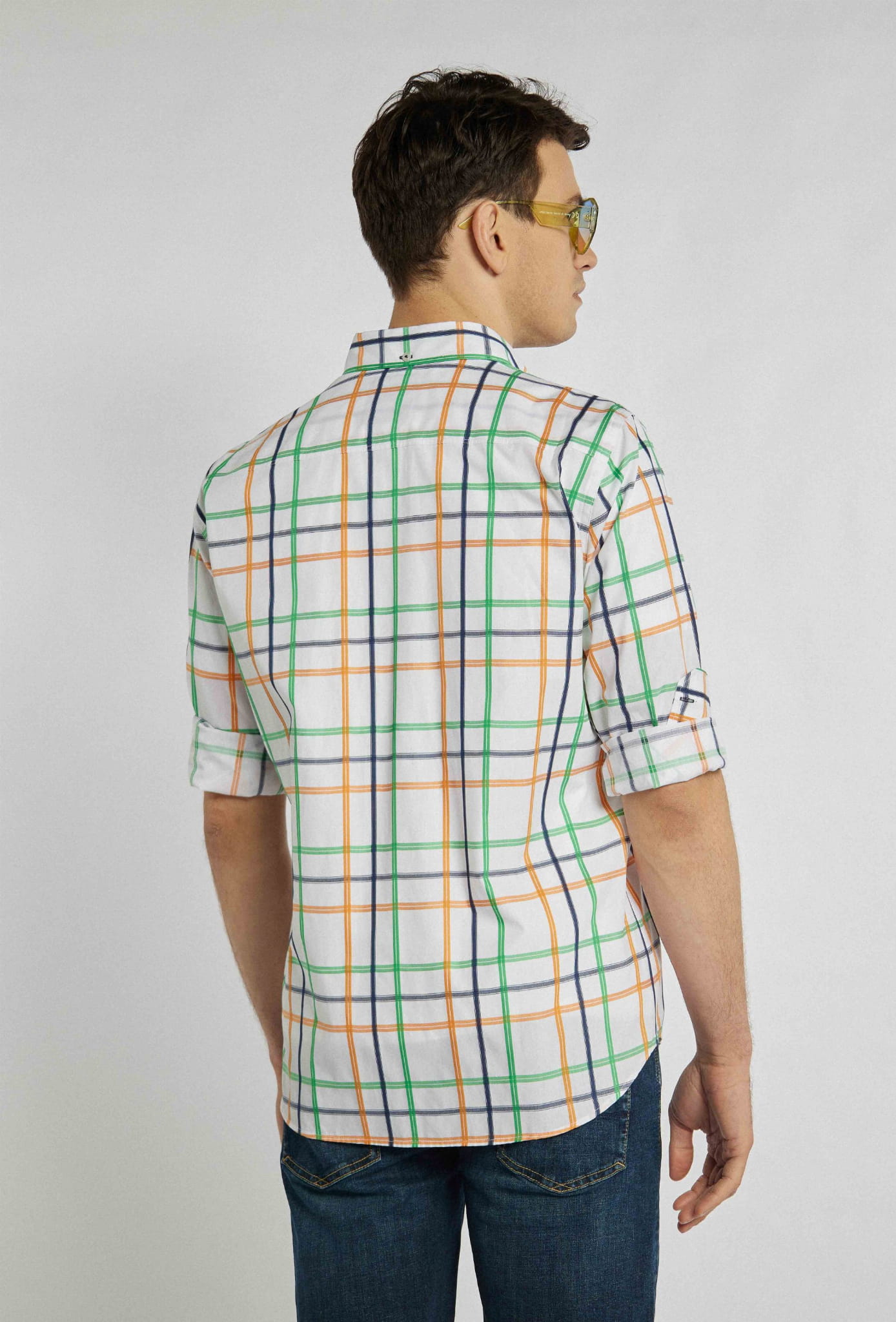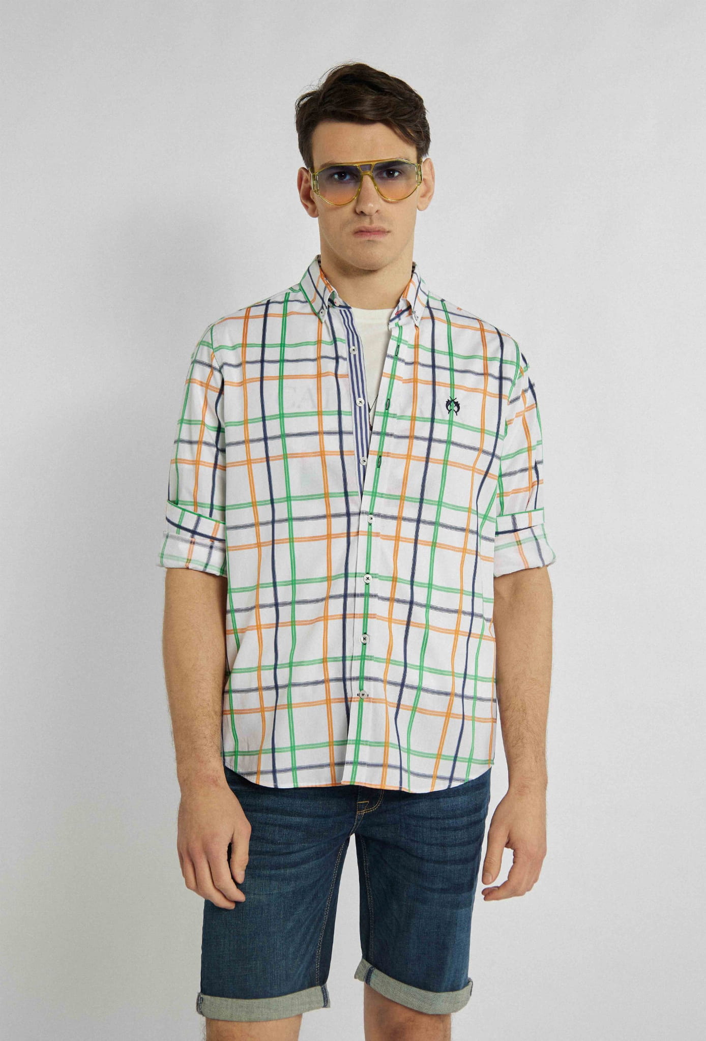 Męska koszula na długi rękaw z kołnierzykiem marki Campione, w kolorze białym w pomarańczowo-zielono-granatową kratę.