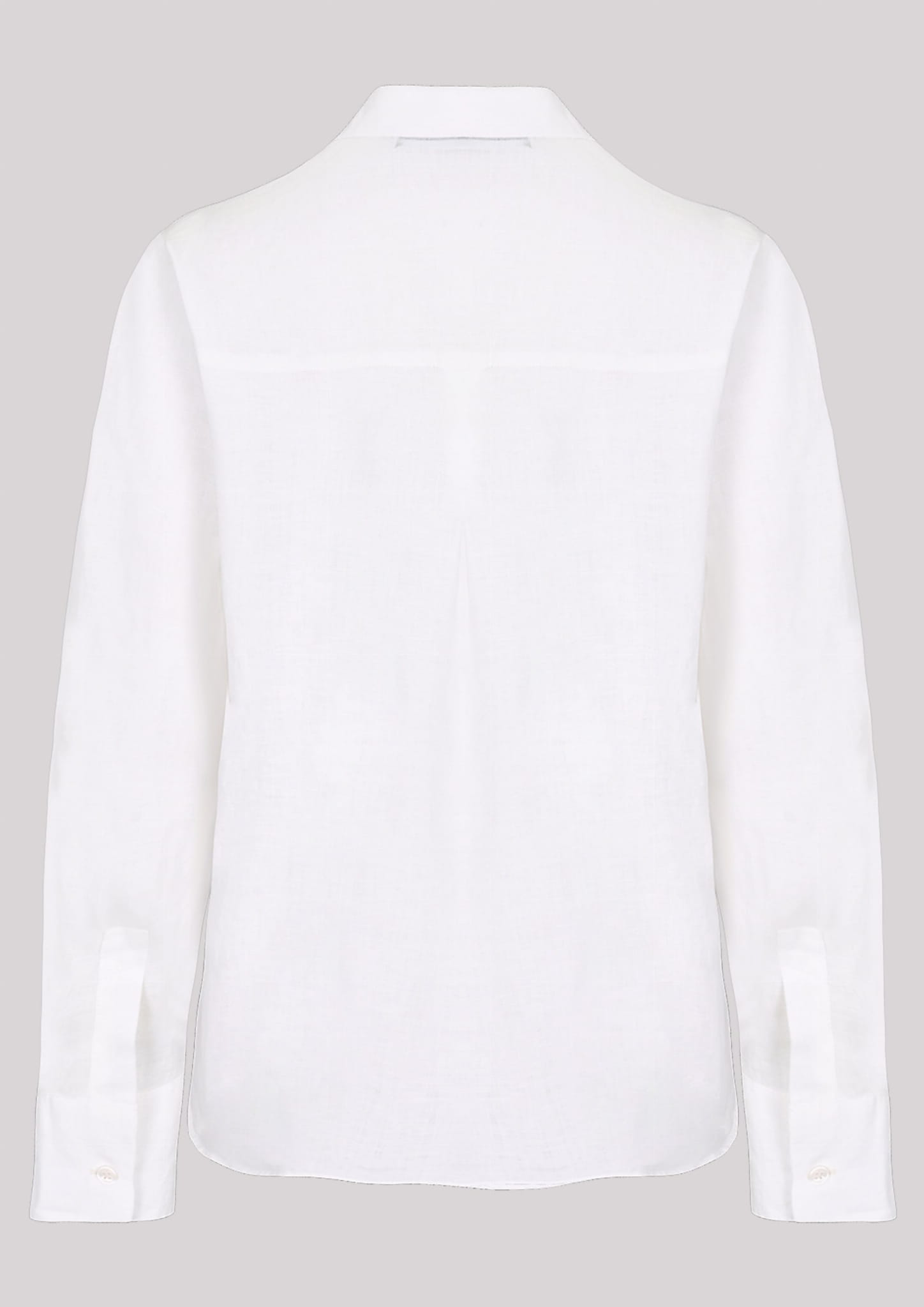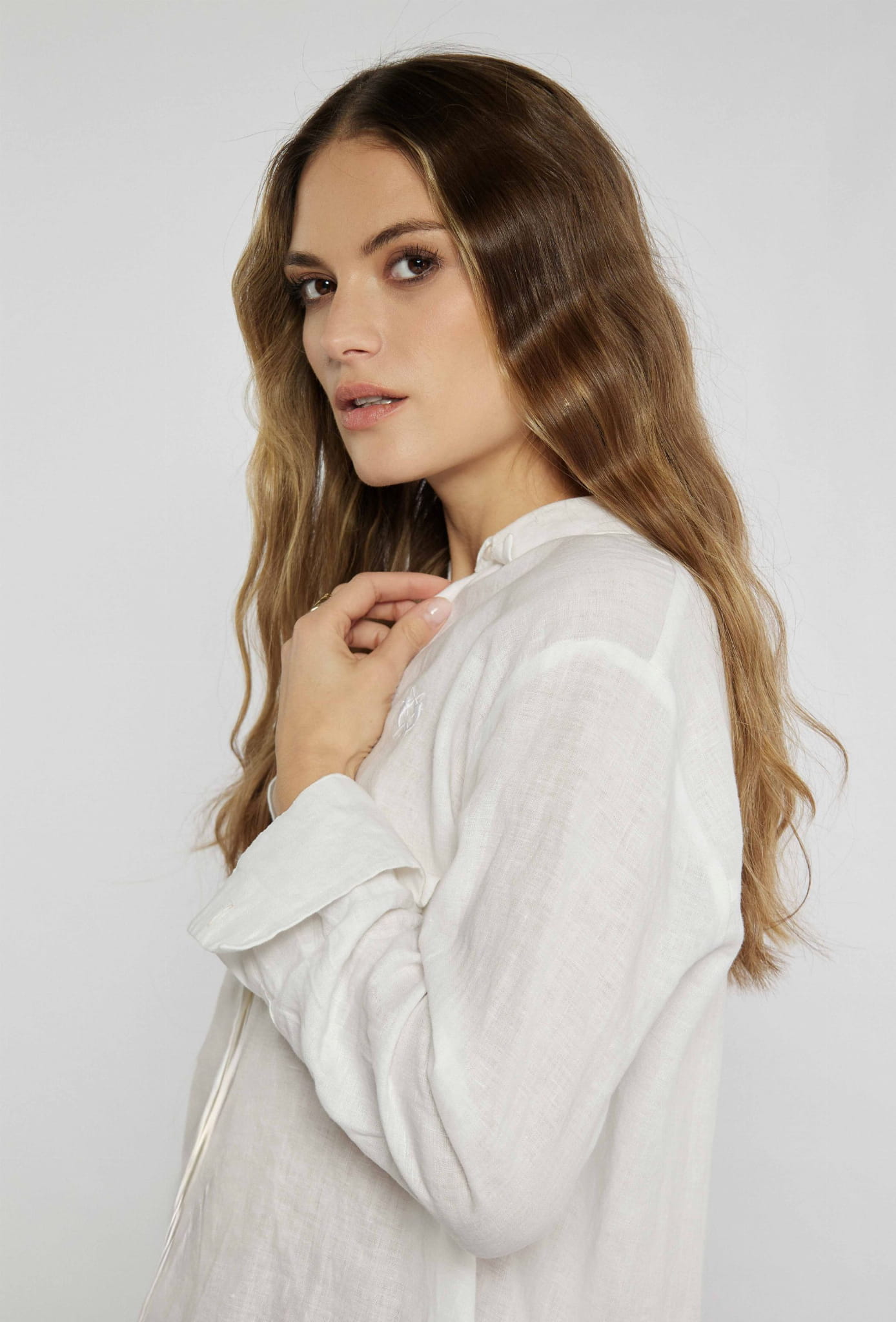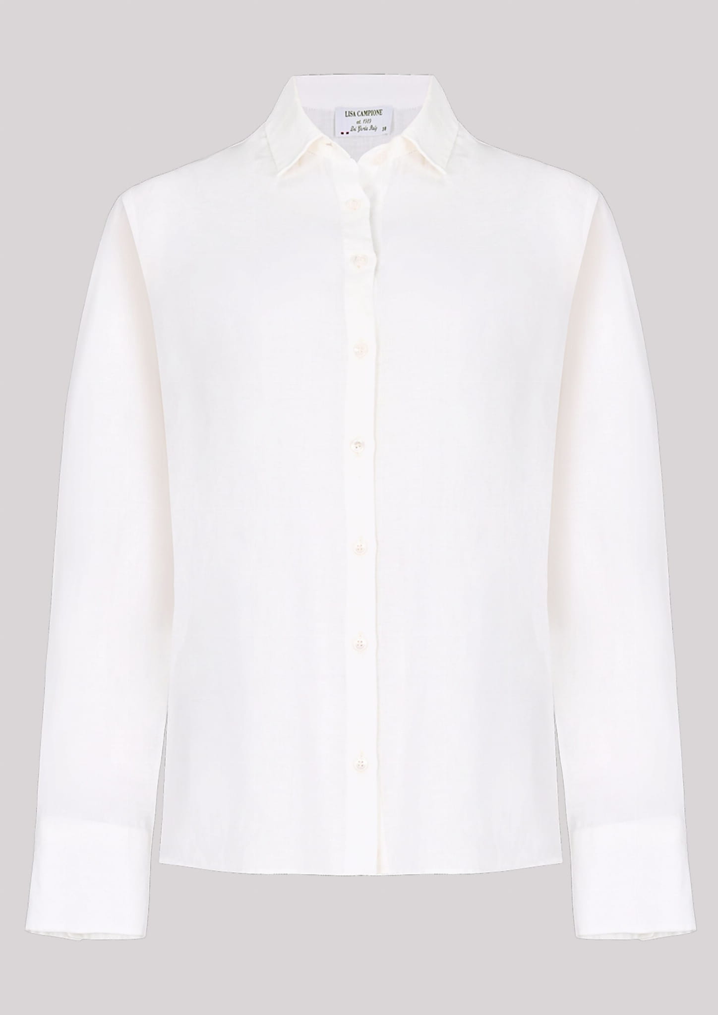 Damska lniana koszula z długim rękawem i kołnierzykiem marki Campione, w kolorze białym.