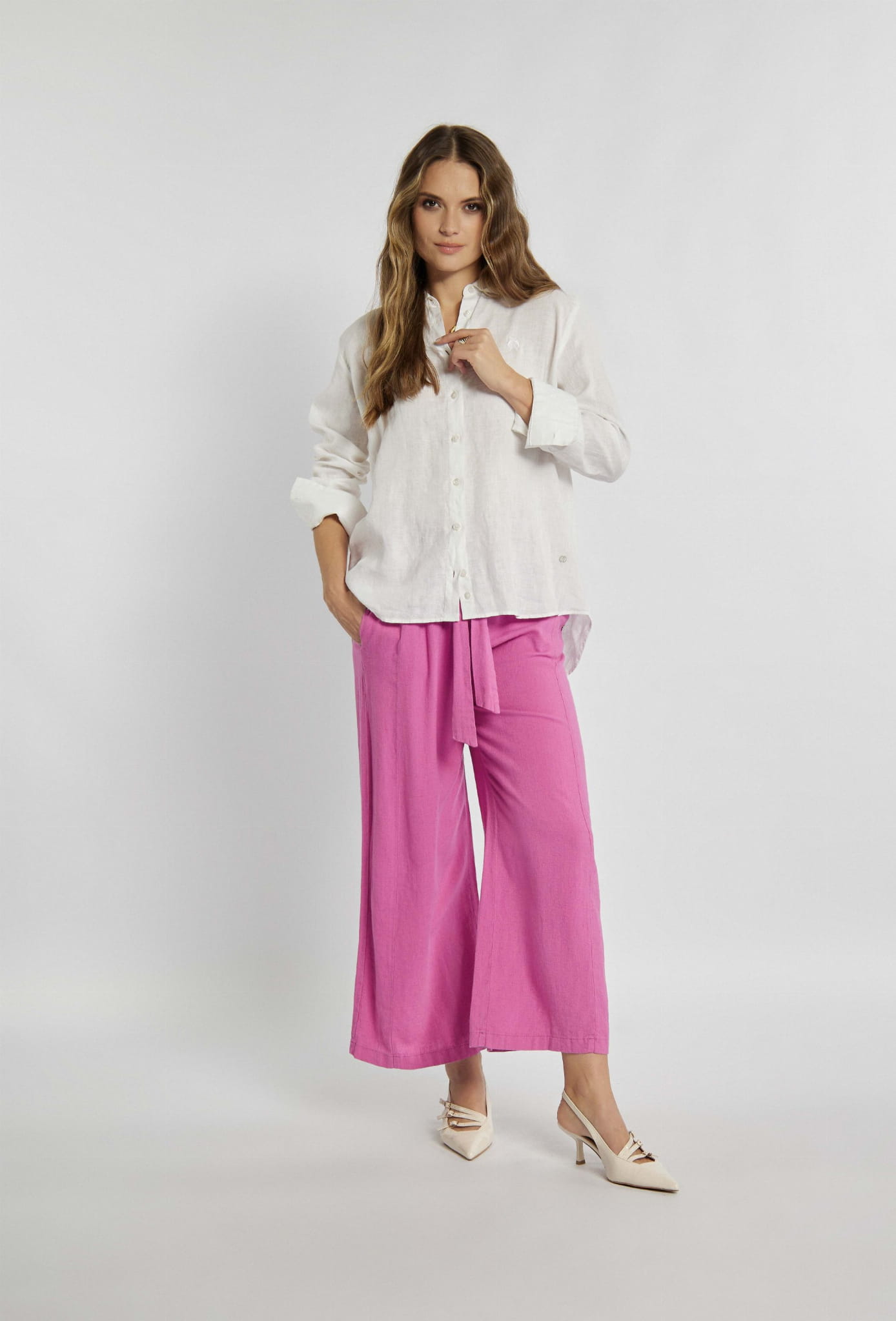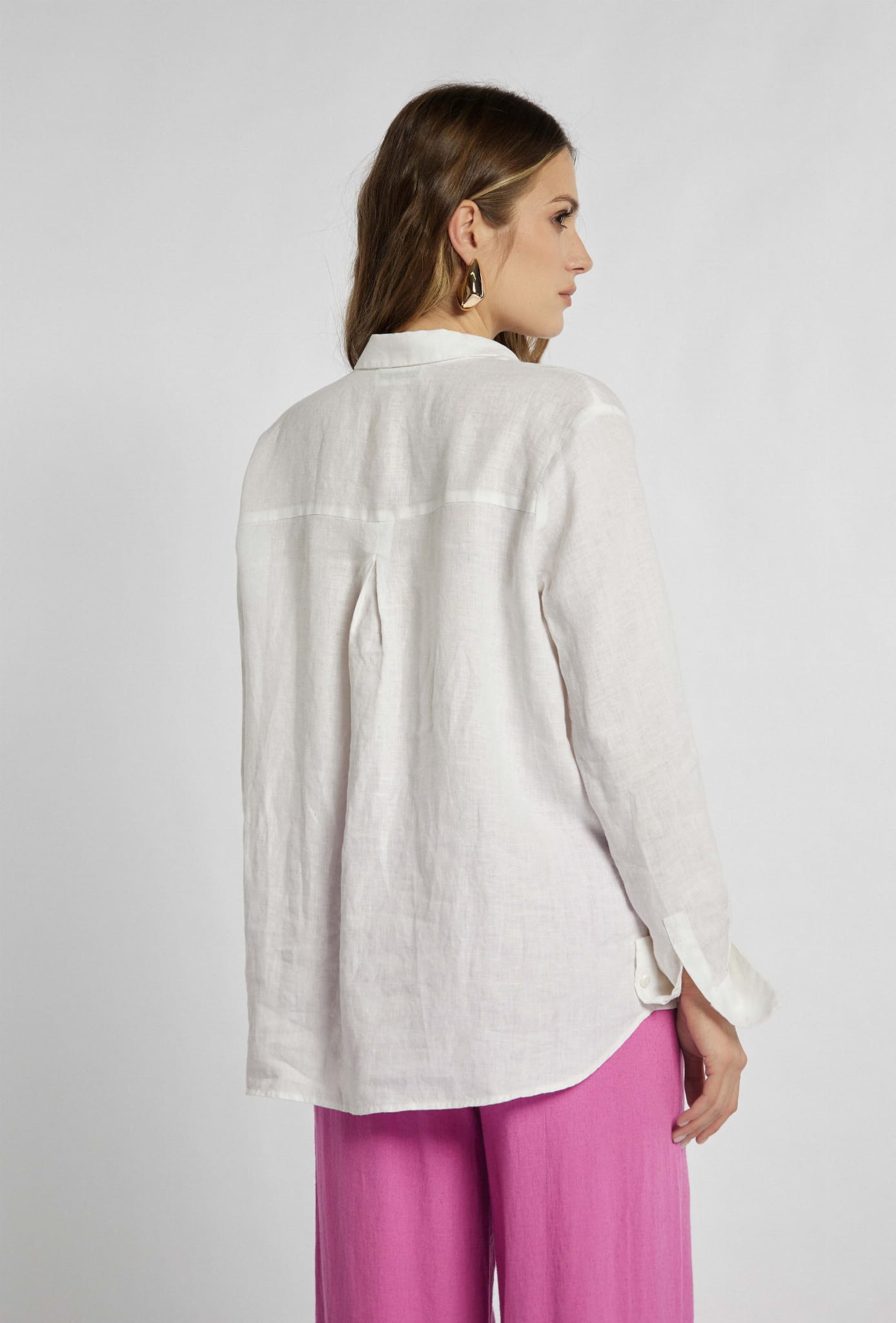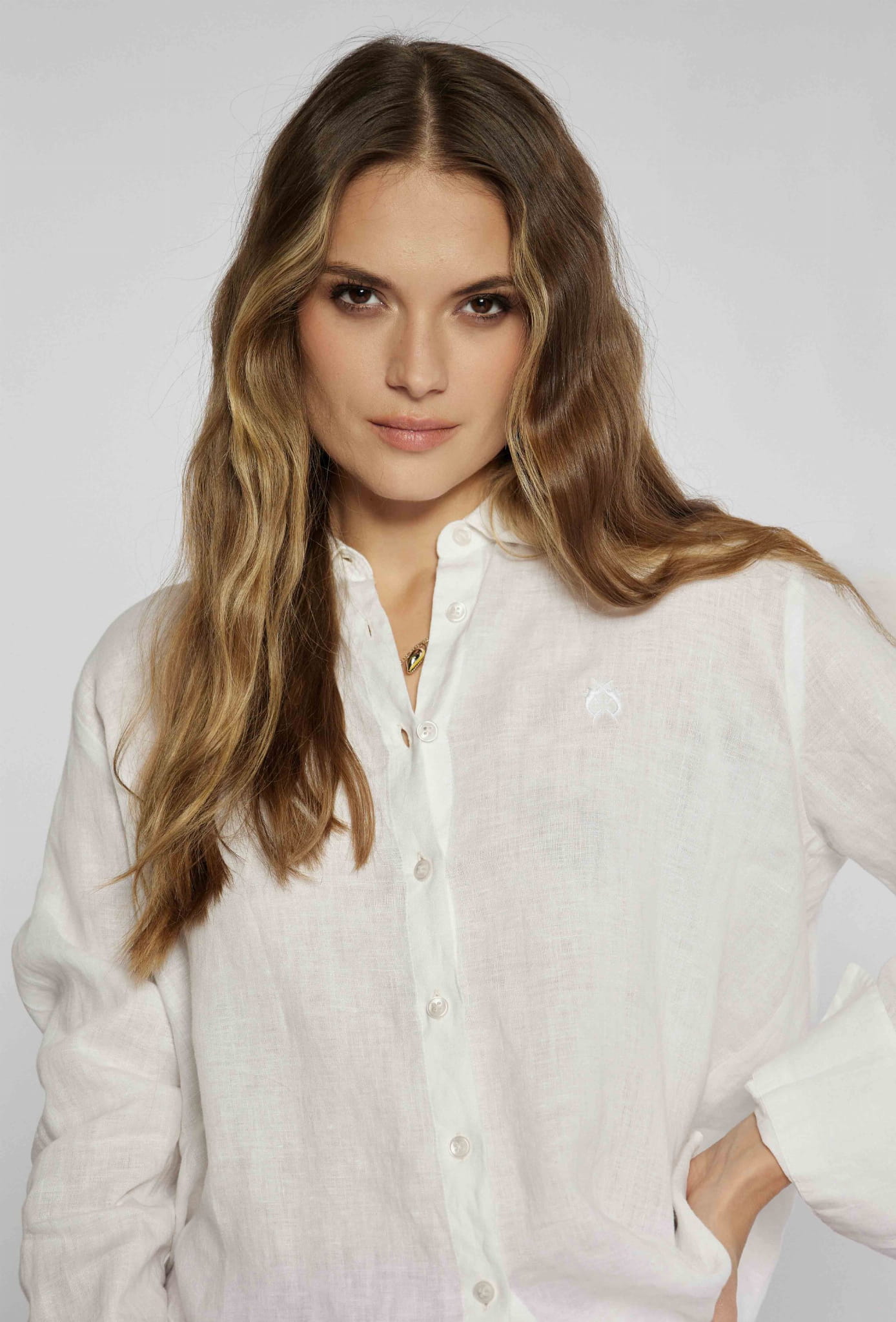 Damska lniana koszula z długim rękawem i kołnierzykiem marki Campione, w kolorze białym.