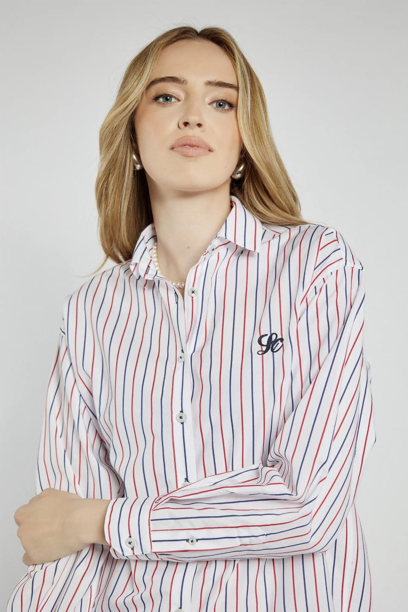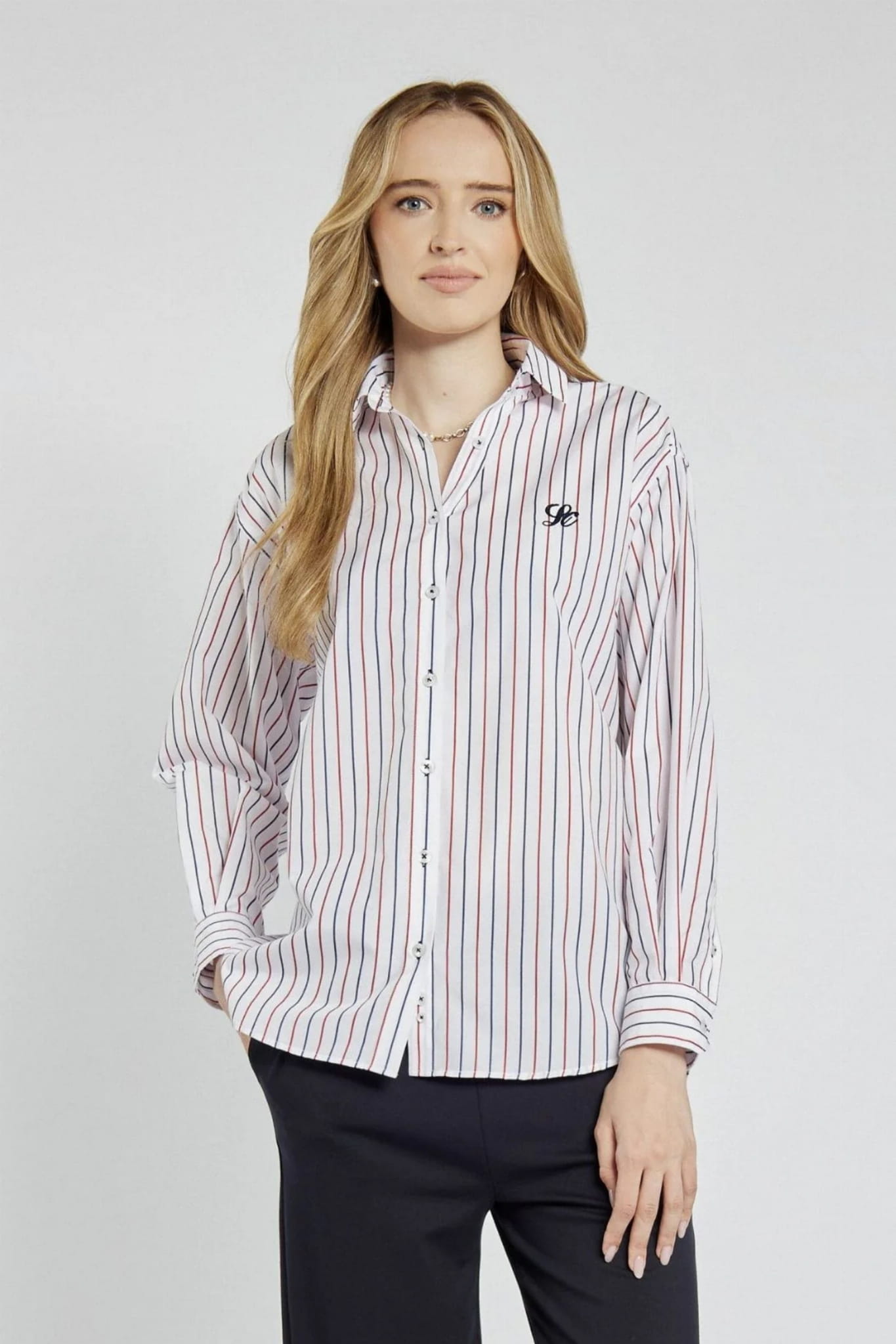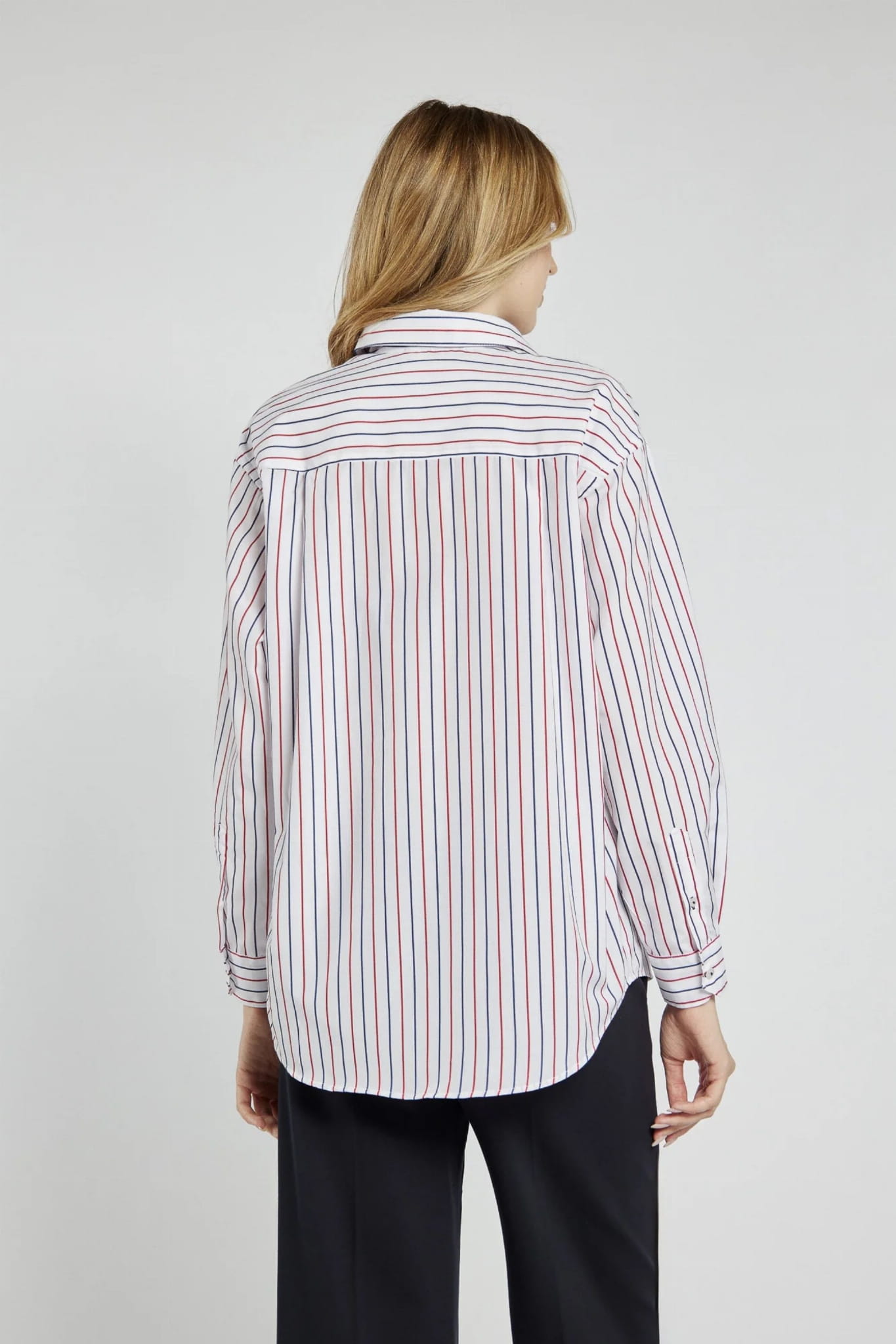 ⇒ Cała koszula pokryta jest czerwono-granatowymi paskami.