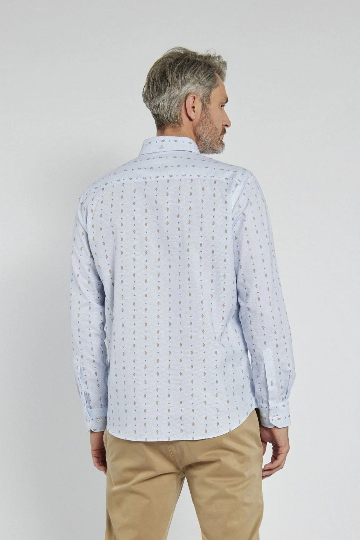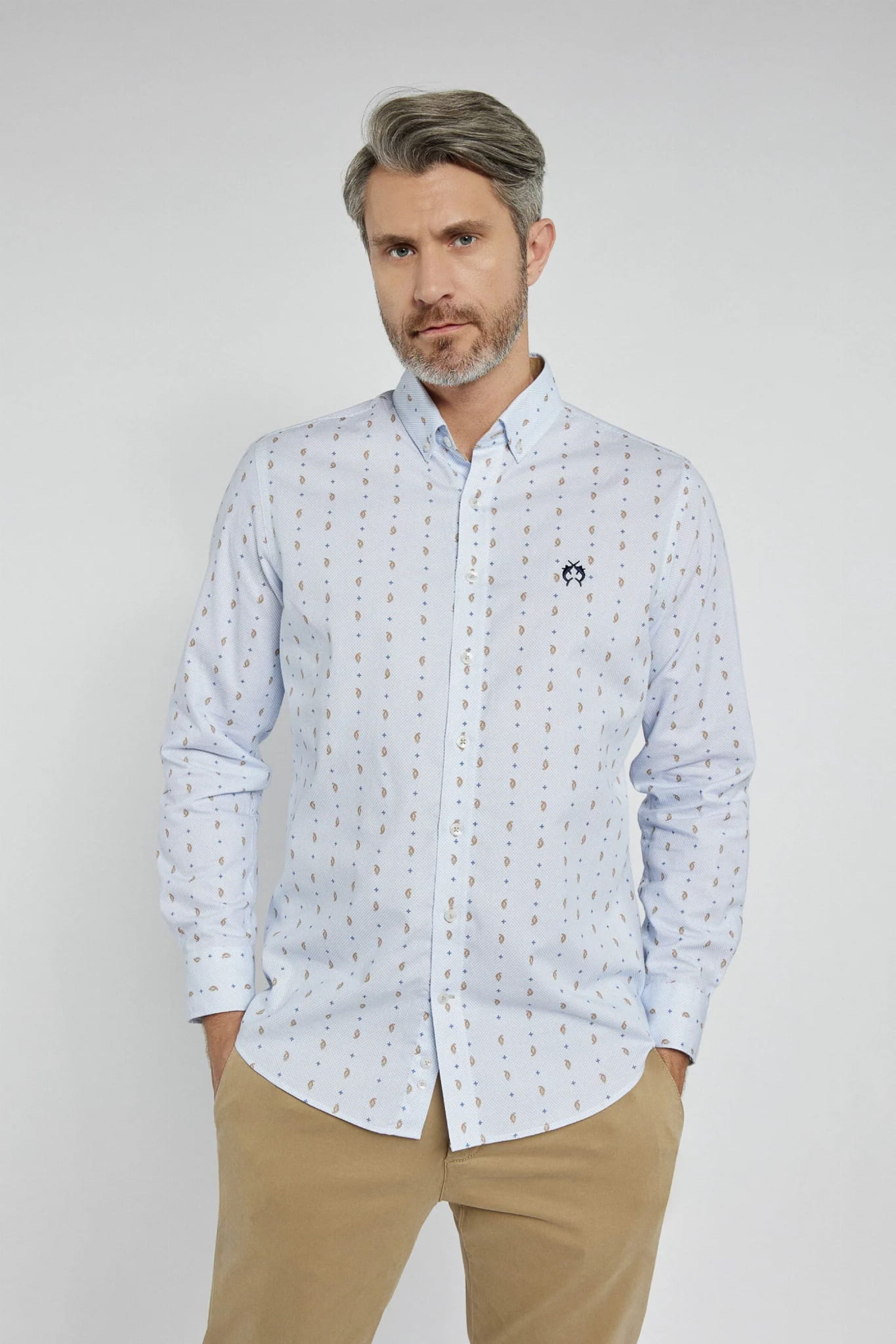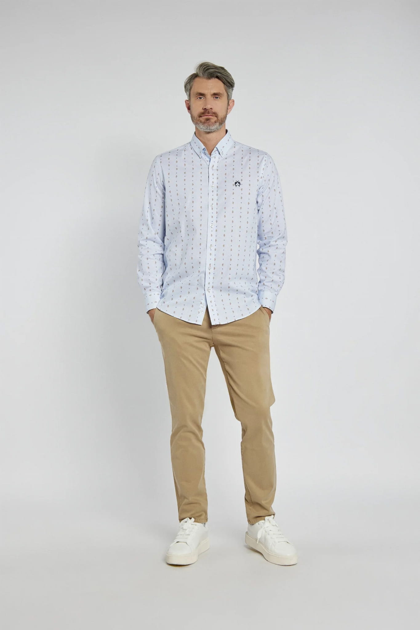 Męska koszula na długi rękaw z kołnierzykiem marki Campione, w kolorze biało-niebieskim z brązowymi elementami.