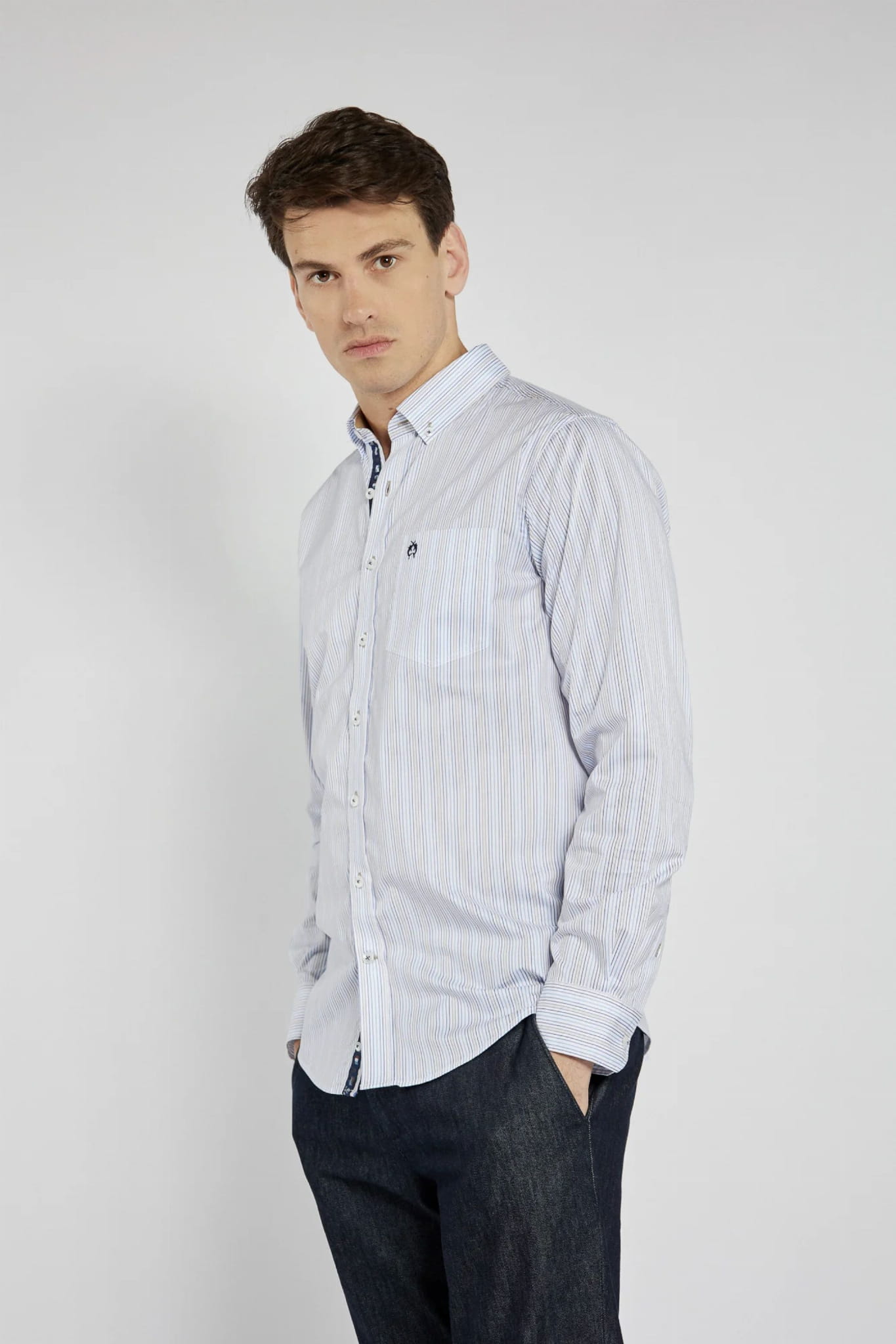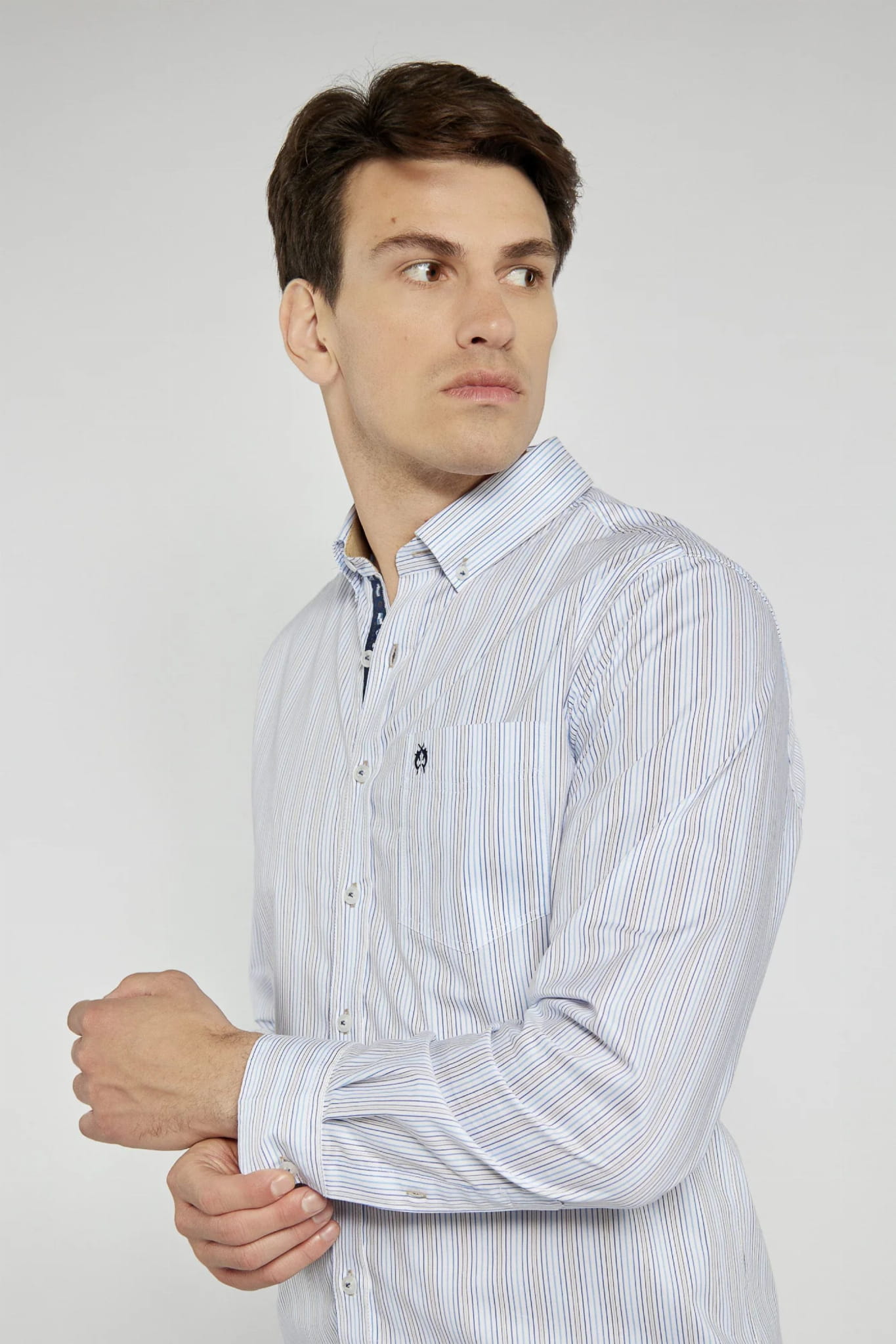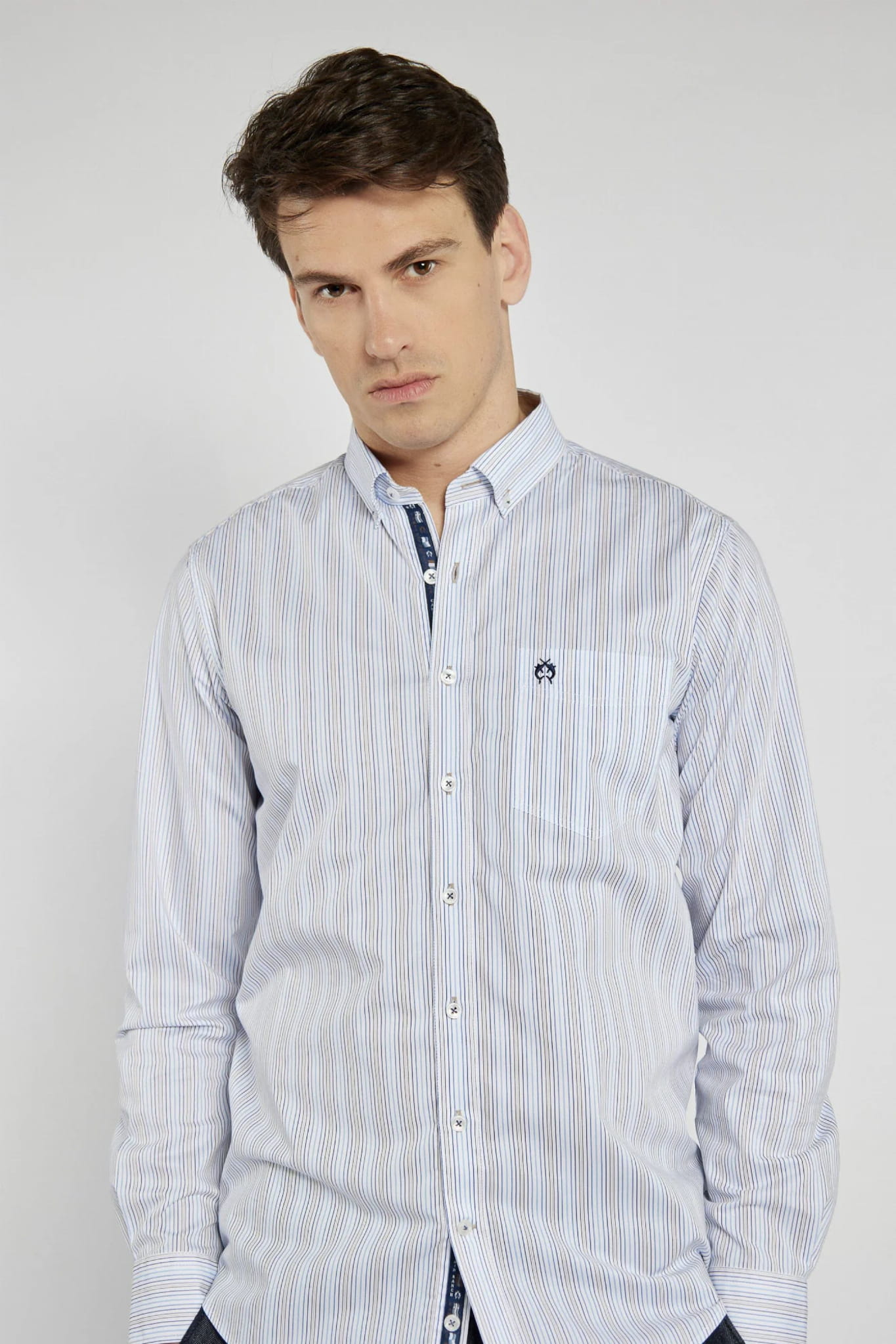 Męska koszula na długi rękaw z kołnierzykiem marki Campione, w kolorze białym w subtelne niebiesko-brązowe paski.