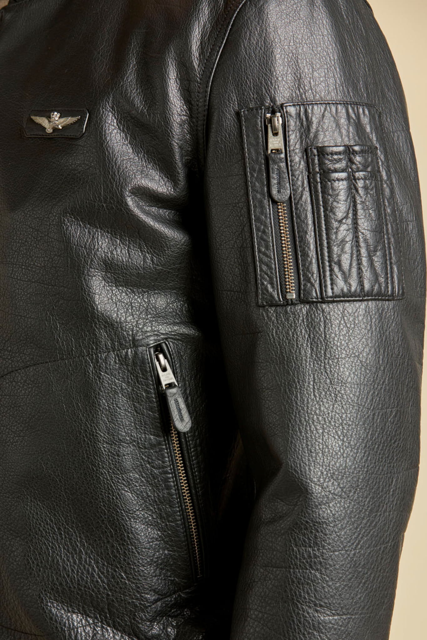 ⇒ Z przodu na wysokości klatki piersiowej znajduje się małe logo marki Aeronautica Militare w formie kultowego orzełka z wieżyczką.