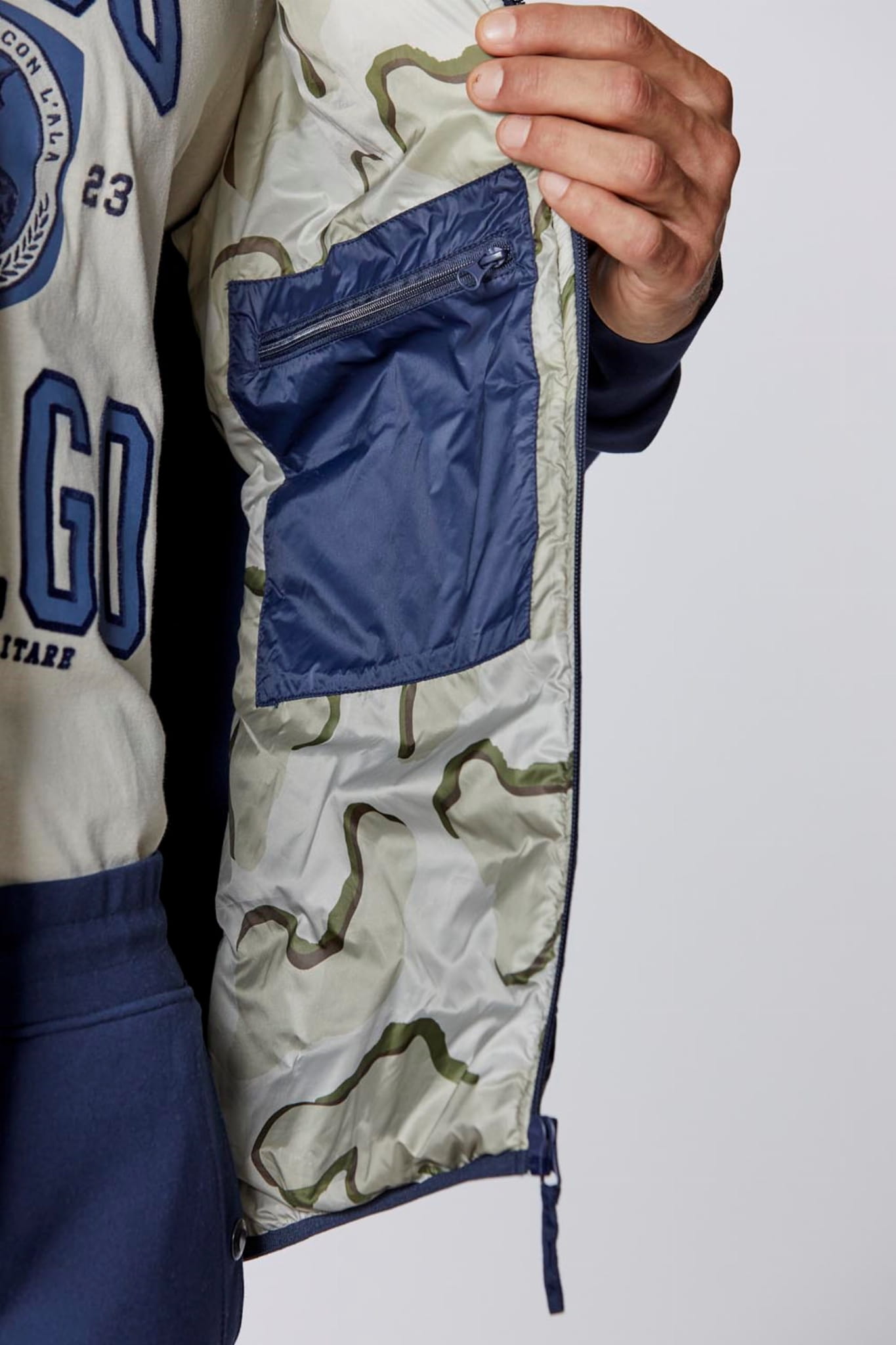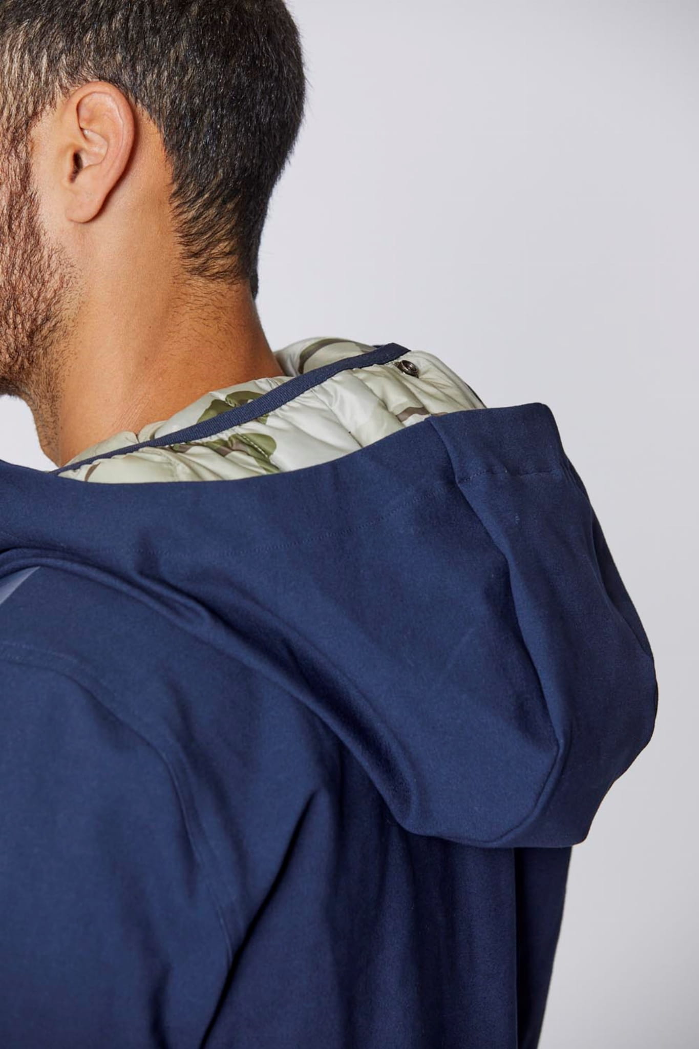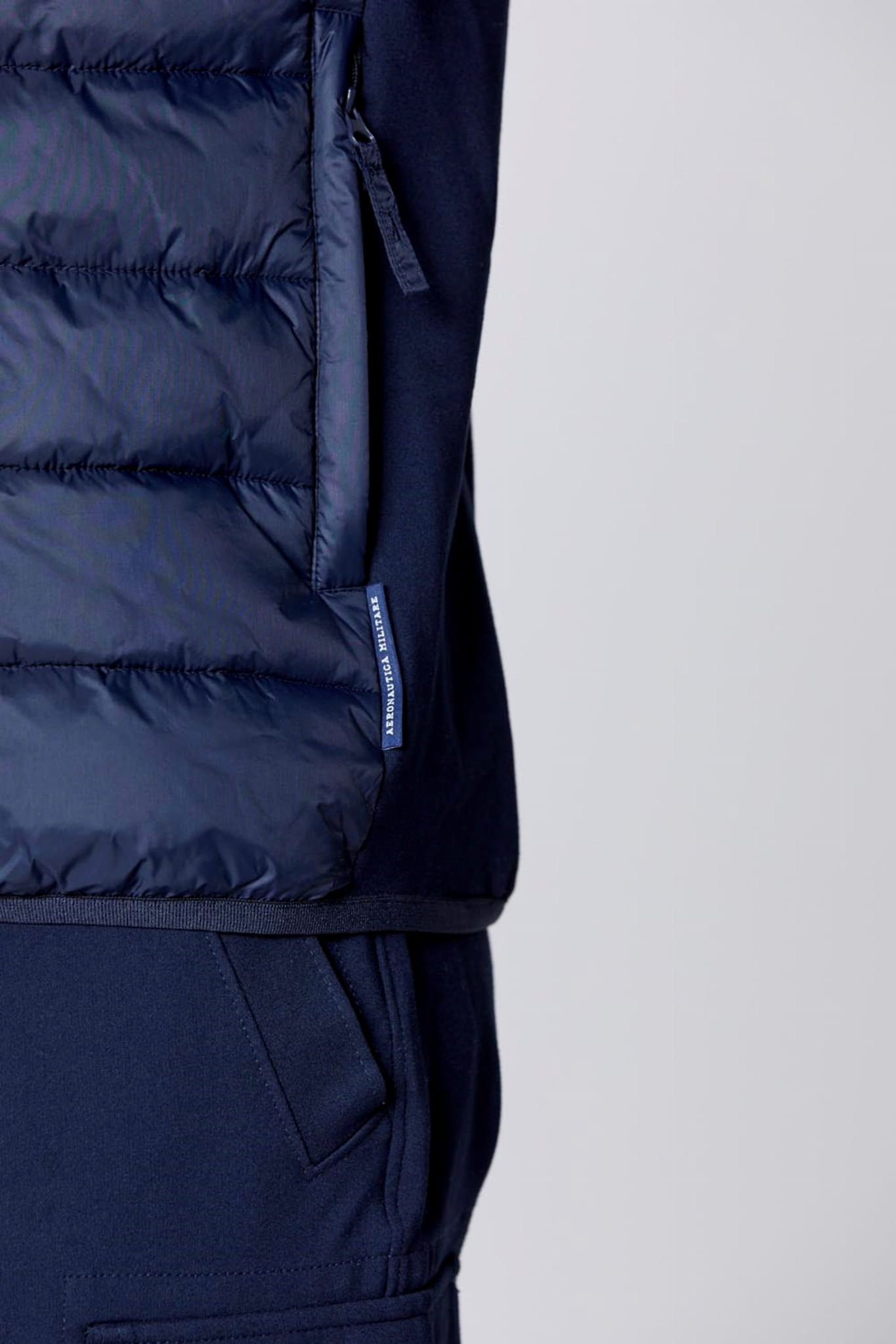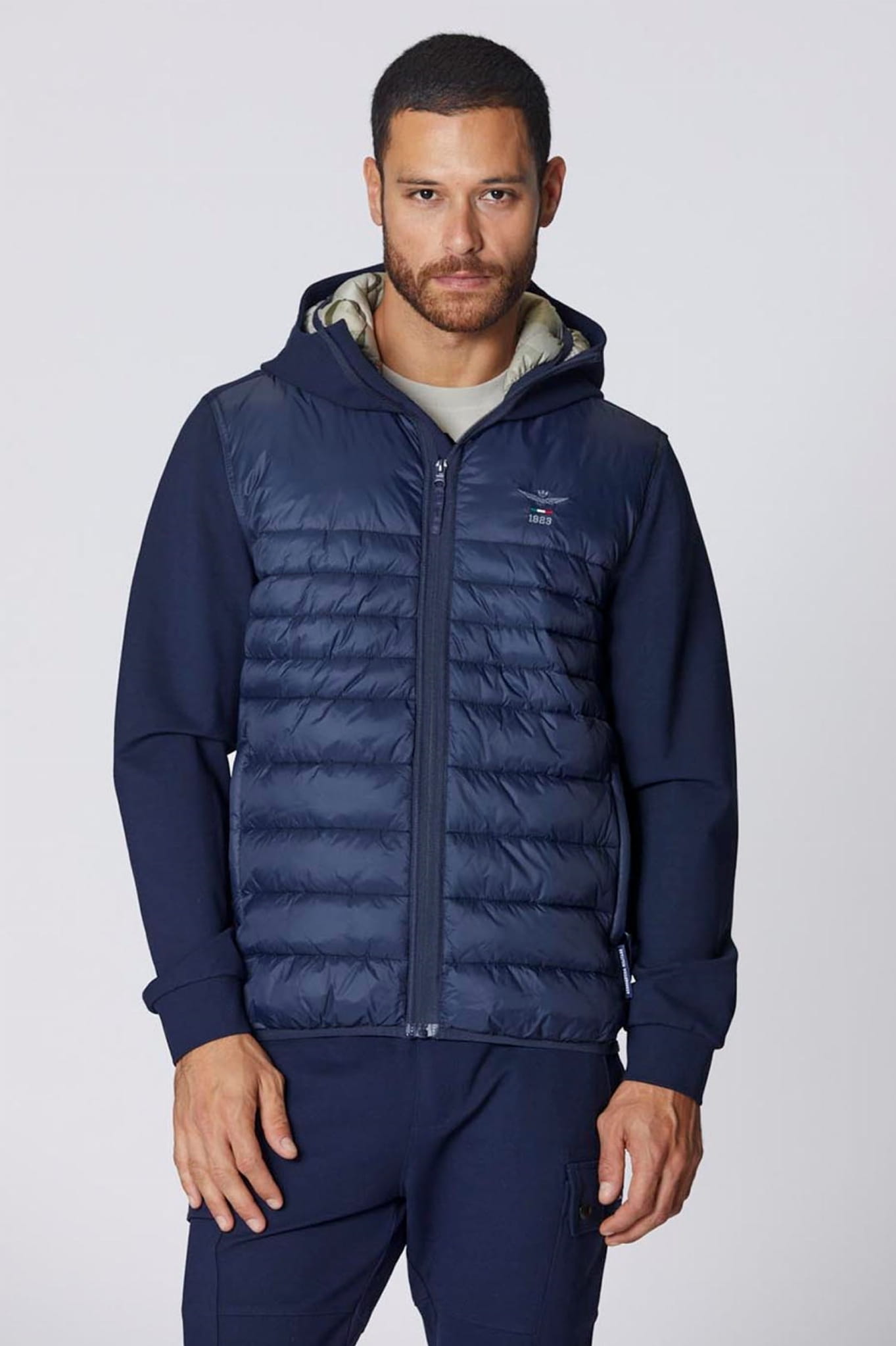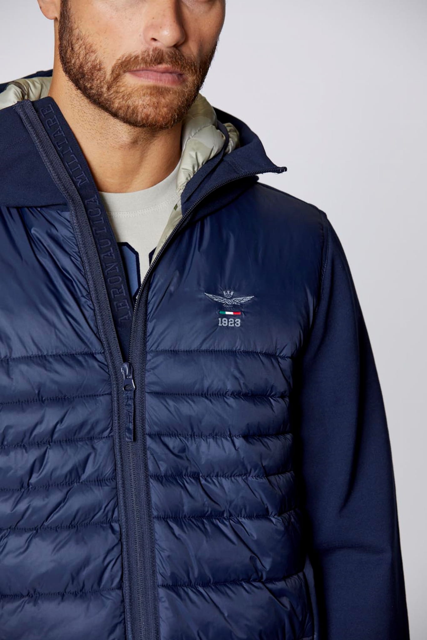 Męska sportowa kurtka hybrydowa z kapturem marki Aeronautica Militare, w kolorze granatowym.