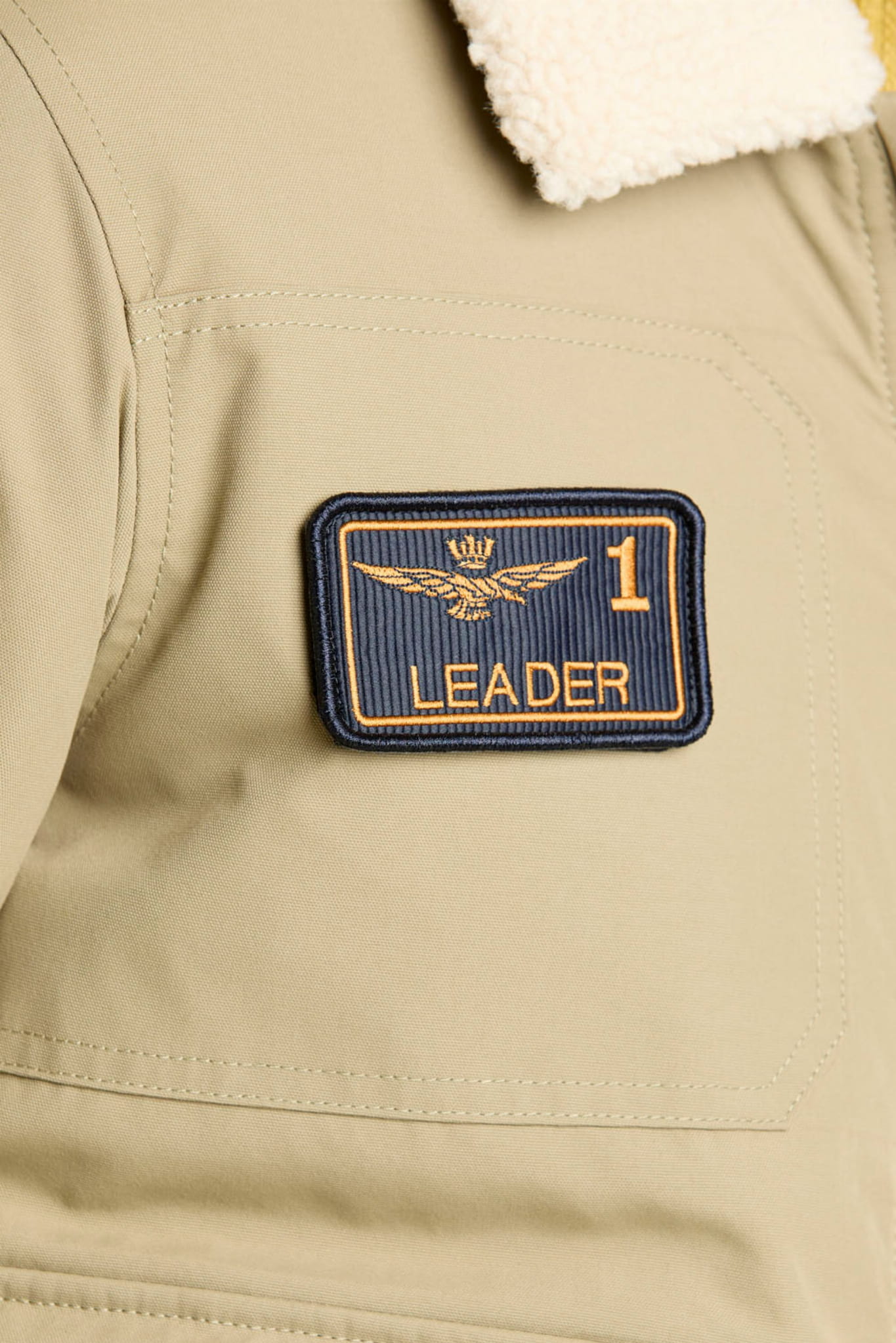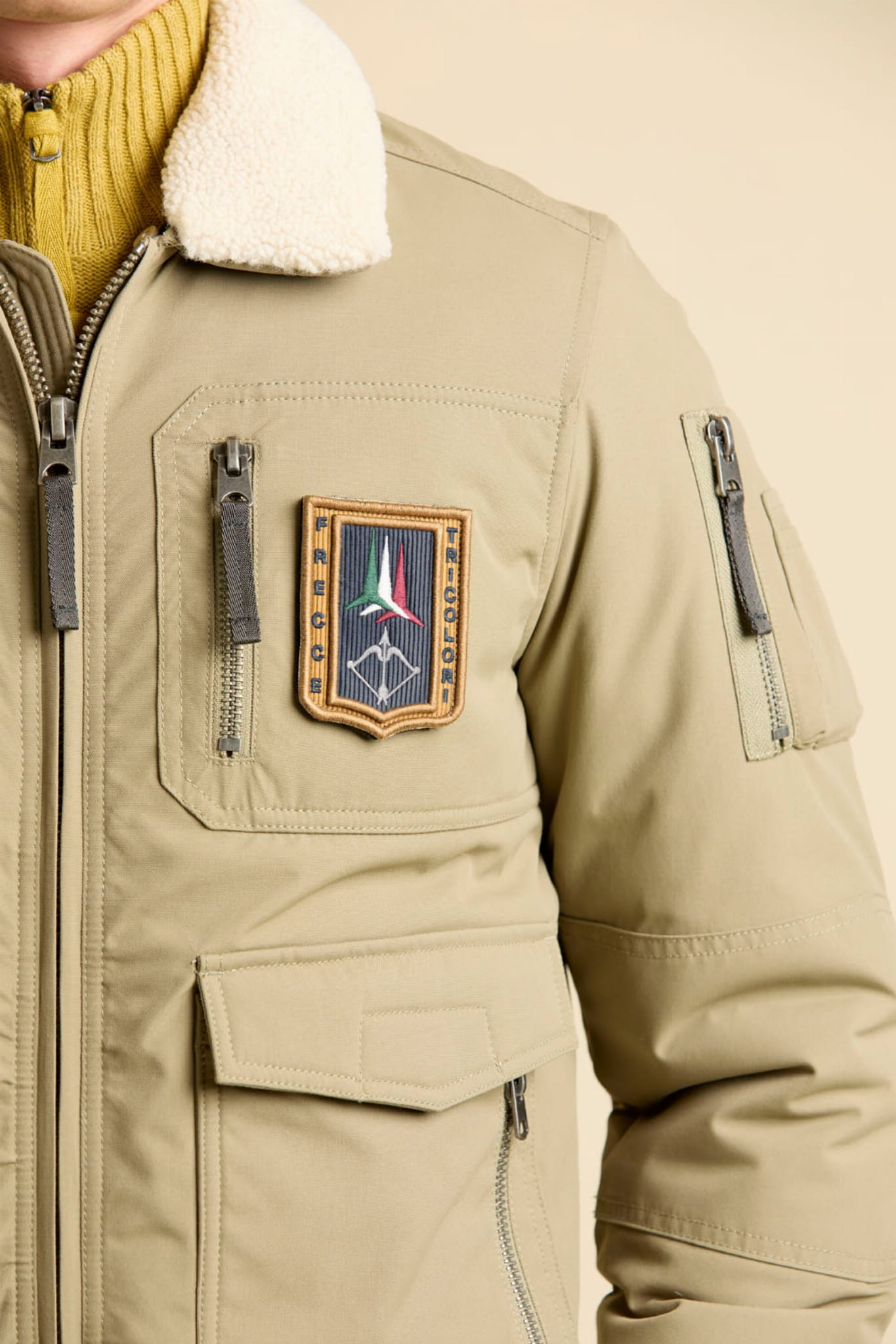 Męska jesienno-zimowa kurtka pilotka z futrzanym kołnierzykiem marki Aeronautica Militare, w kolorze beżowym.