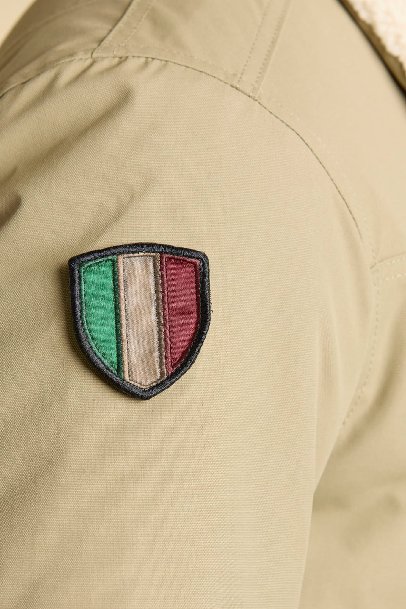 ⇒ Na jednym rękawie jest mała kieszonka zapinana na suwak, a na drugim aplikacja w formie włoskiej flagi.