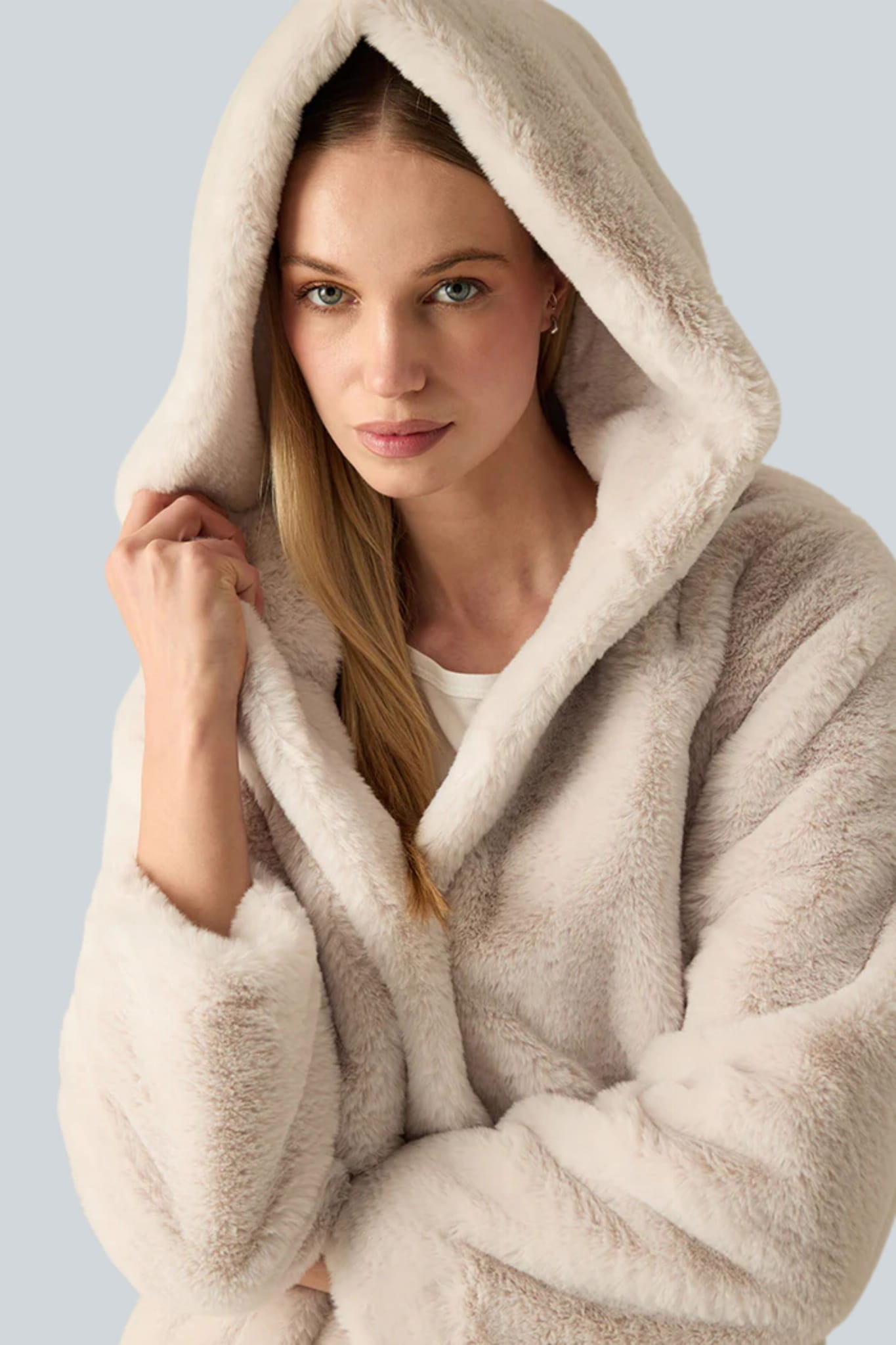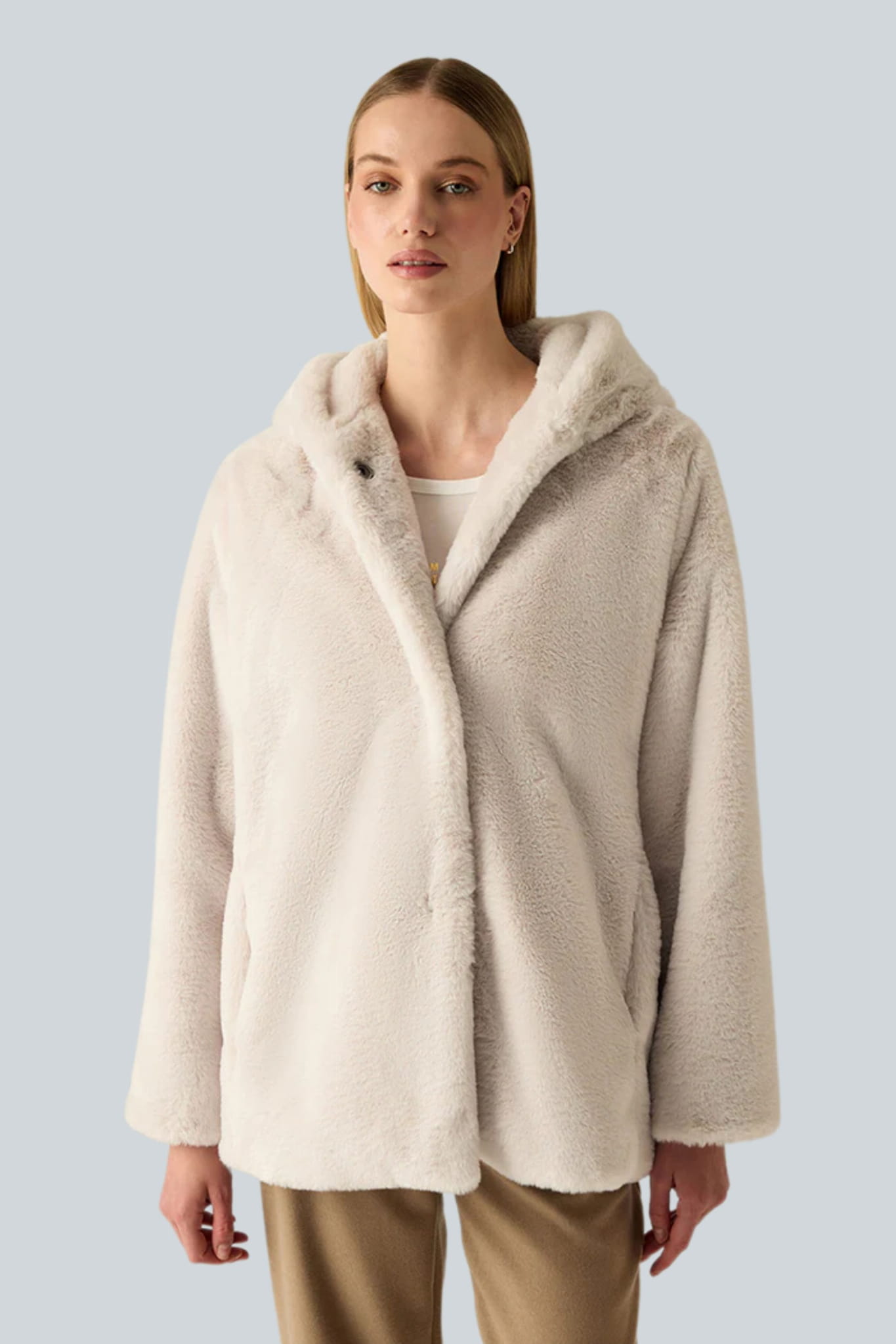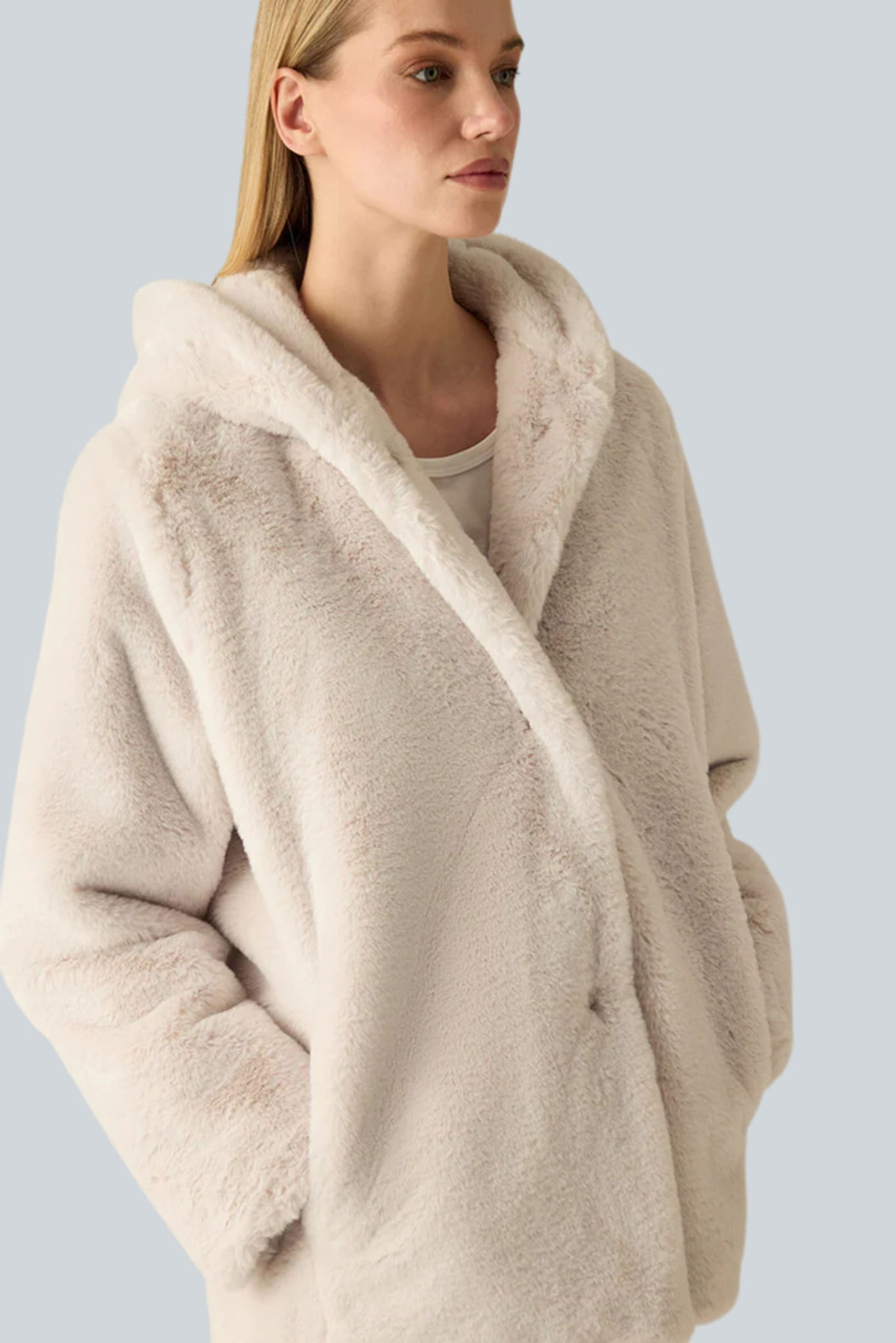 Damski płaszcz z kapturem ze sztucznego futerka marki Campione, w kolorze kremowym.