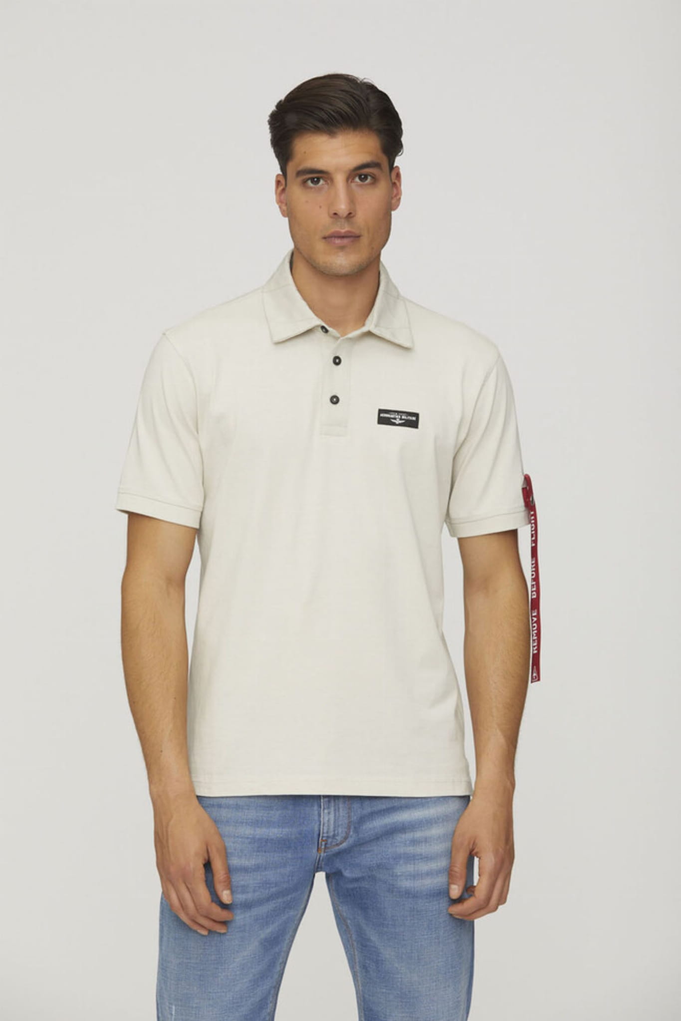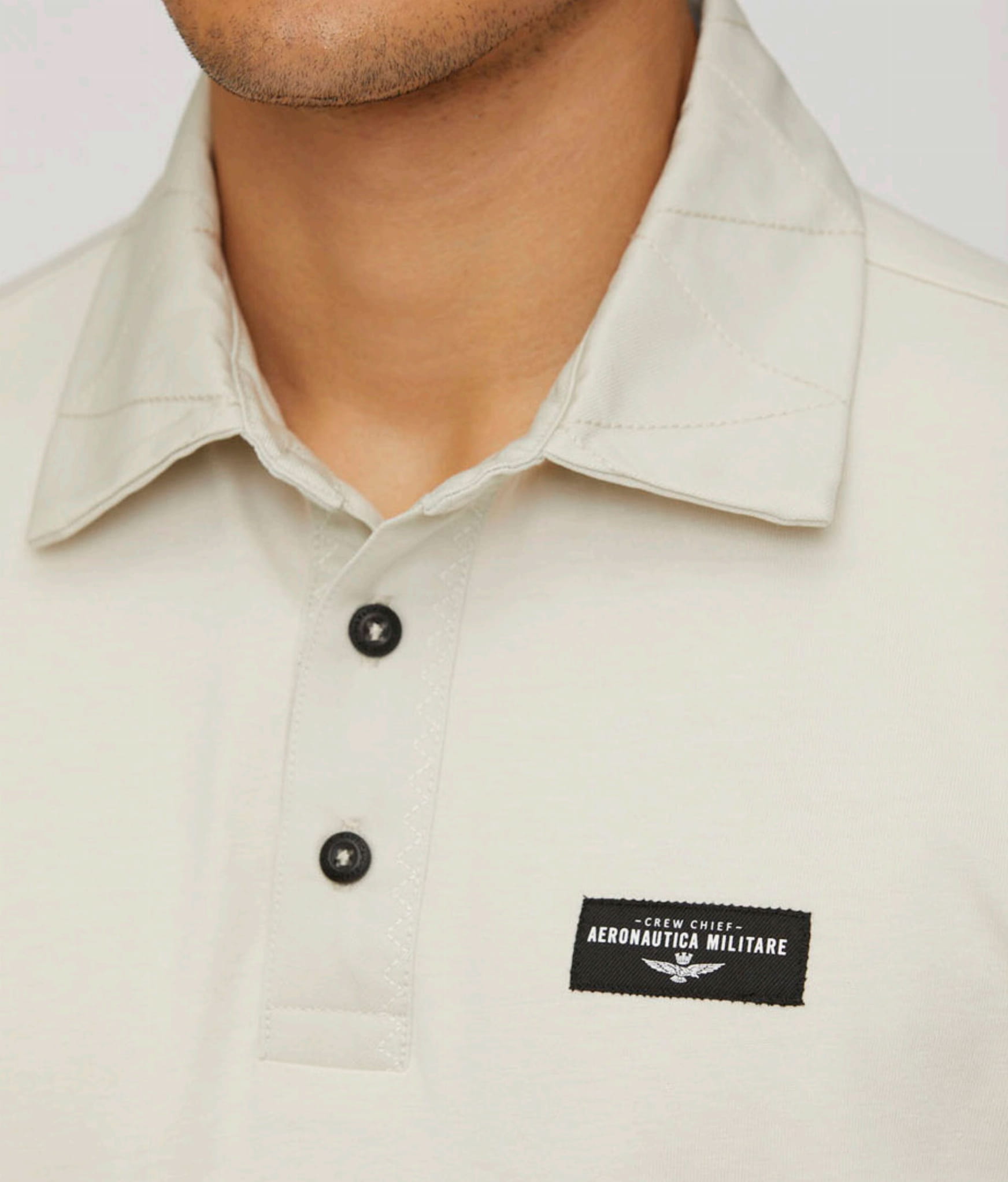Męska koszulka polo z krótkim rękawem i kołnierzykiem marki Aeronautica Militare, w kolorze beżowym.