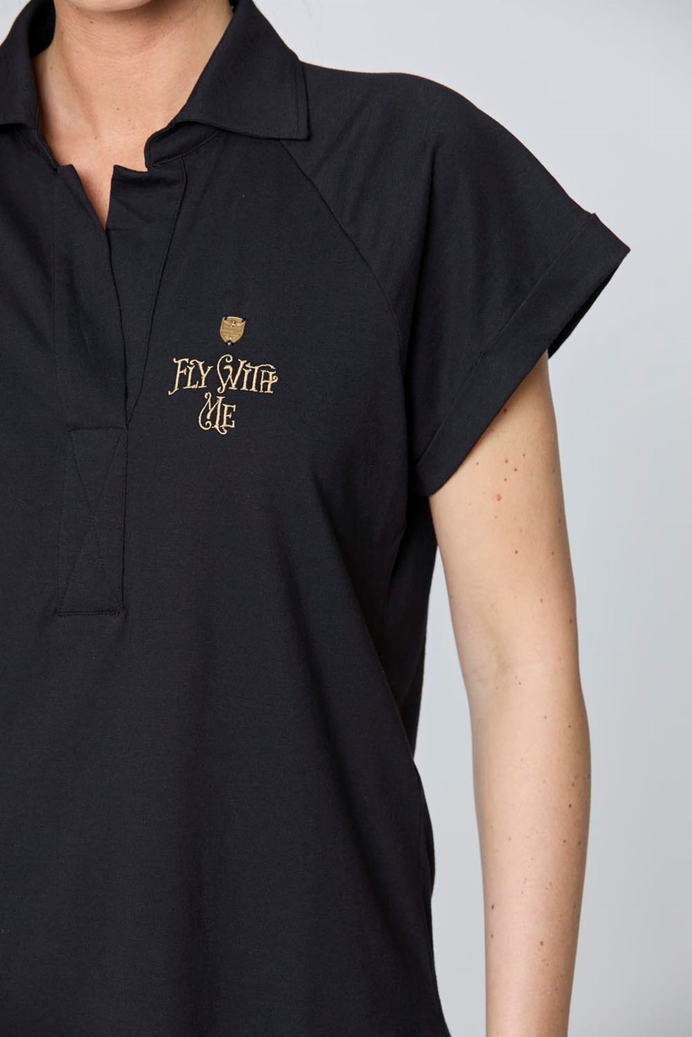 ⇒ Złoty haft "Fly with me" oraz małe metalowe logo marki z przodu na wysokości klatki piersiowej.