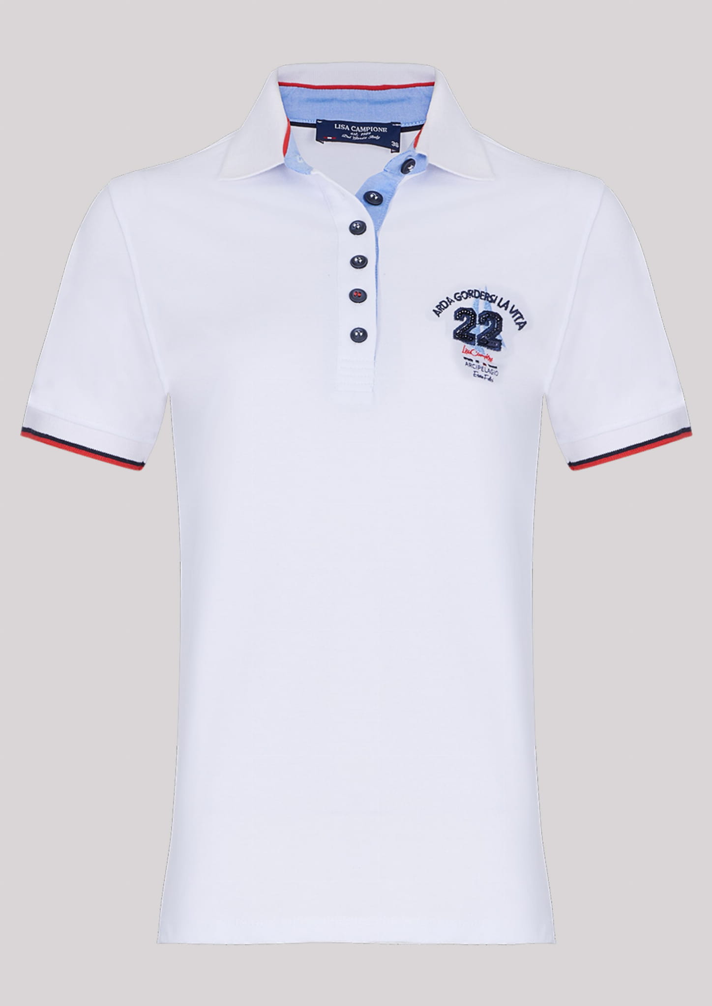 ⇒ Na wysokości klatki piersiowej znajduje się efektowna subtelna aplikacja nawiązująca do marki Campione.