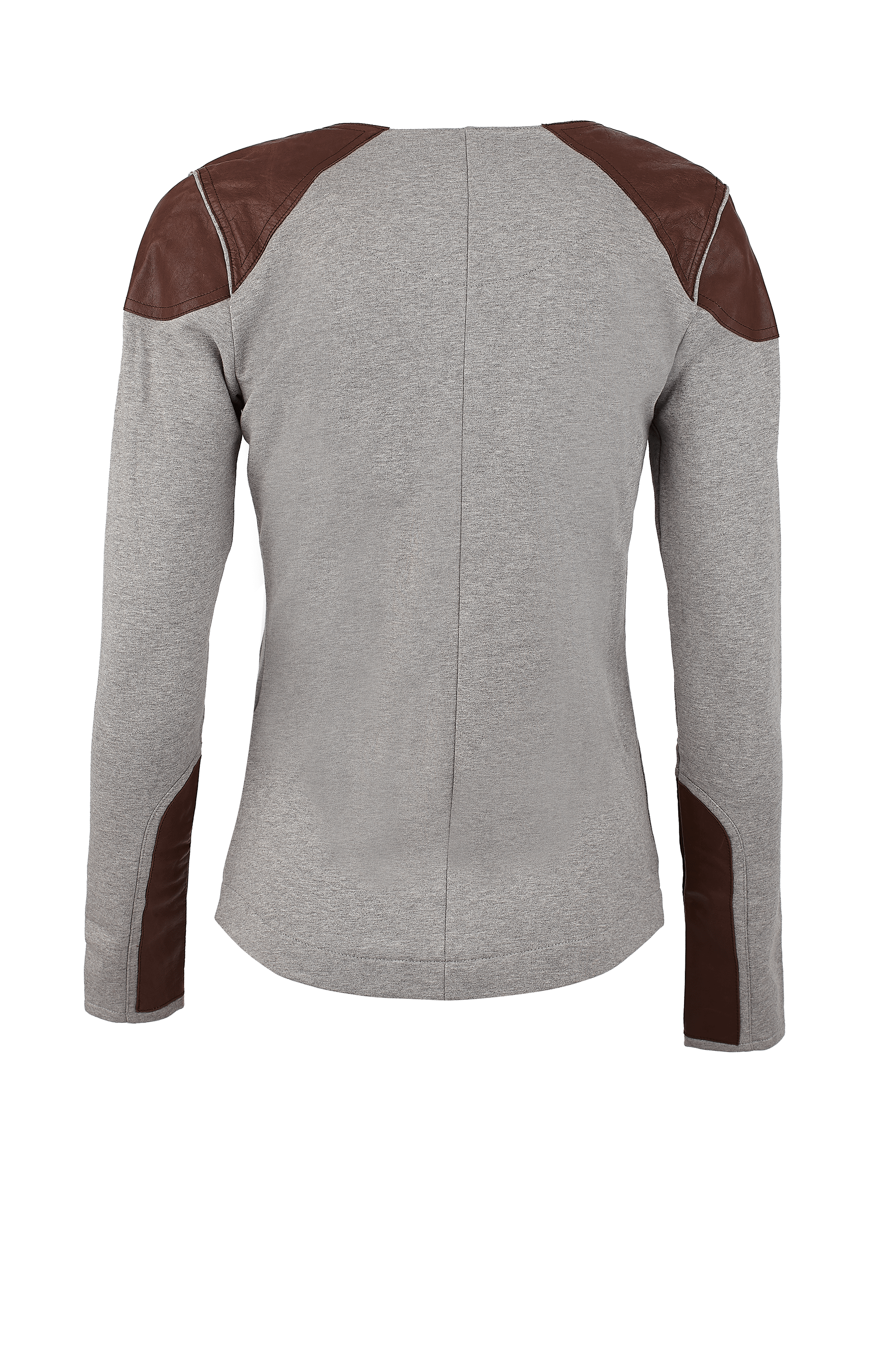 ⇒ Kontrastowe skórzane wstawki nadają bluzie elegancki i niepowtarzalny charakter.