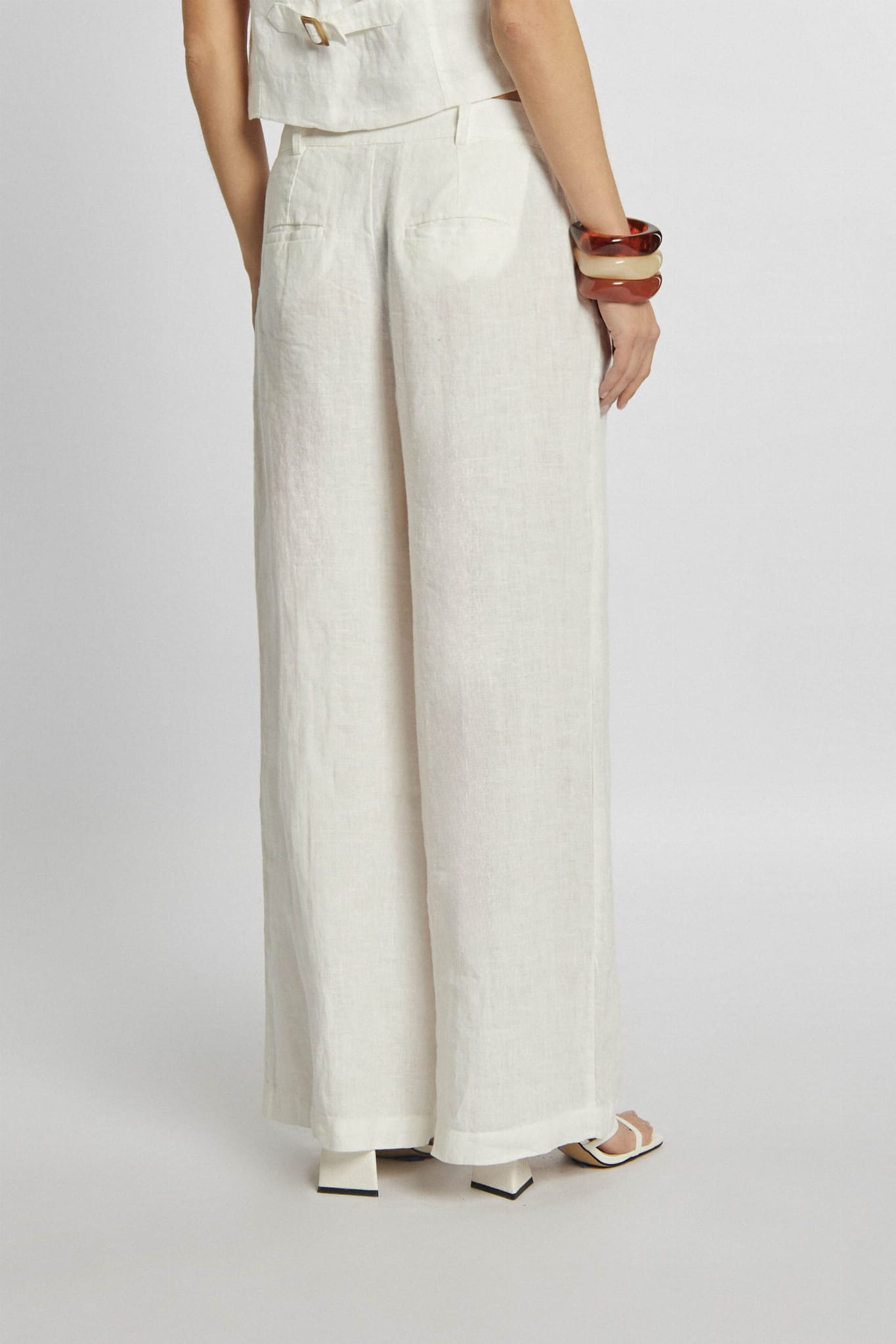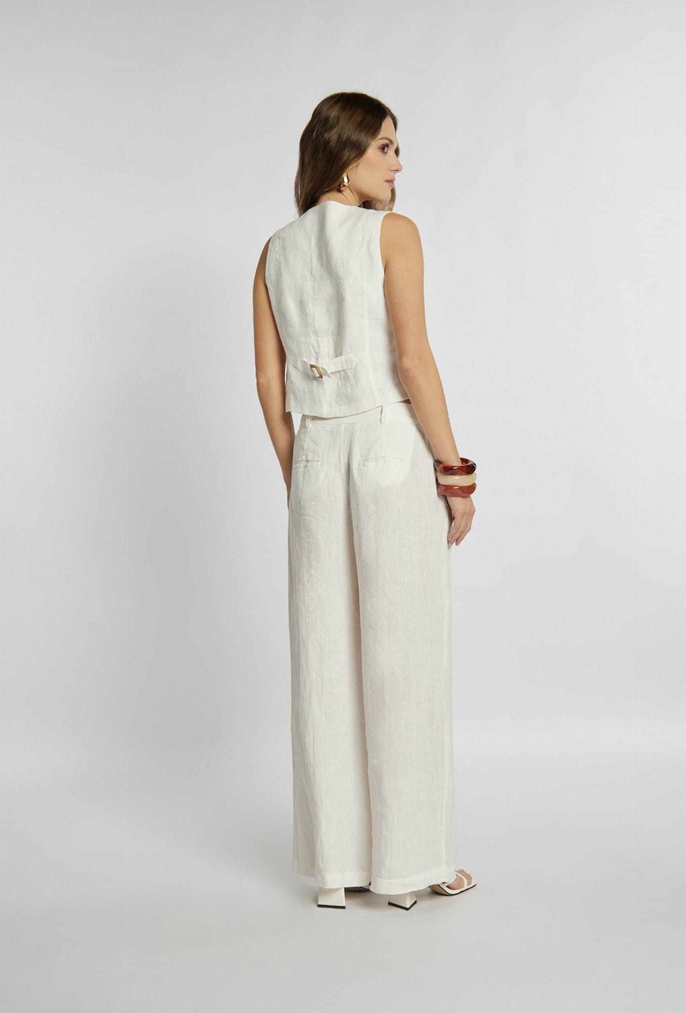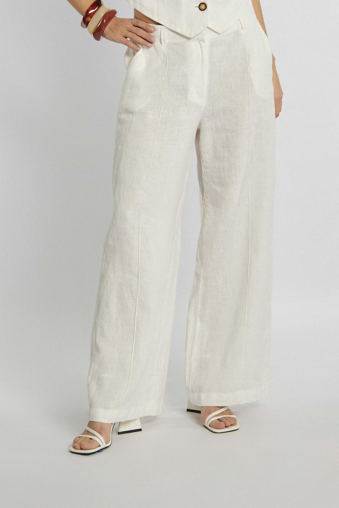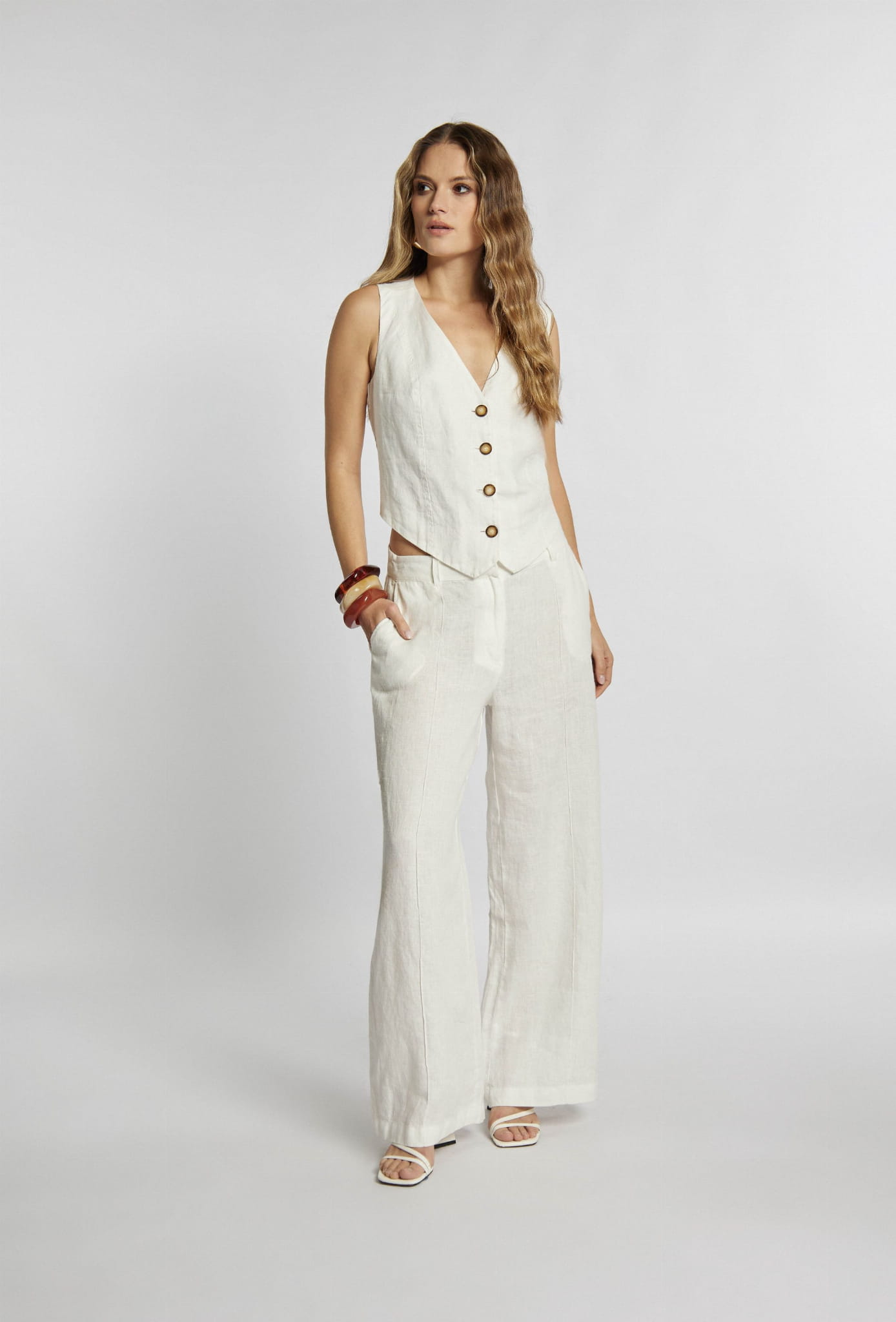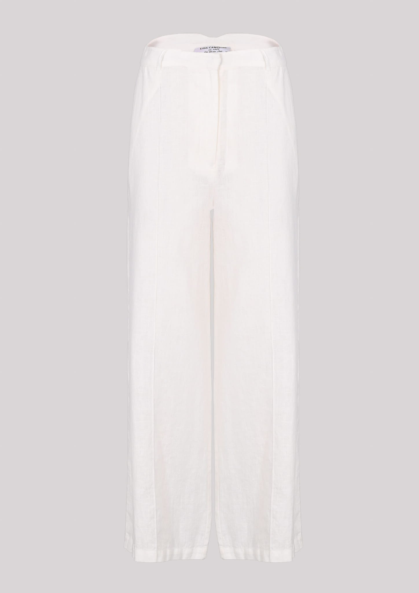 Damskie długie lniane spodnie palazzo z szeroką nogawką marki Campione, w kolorze kremowym.