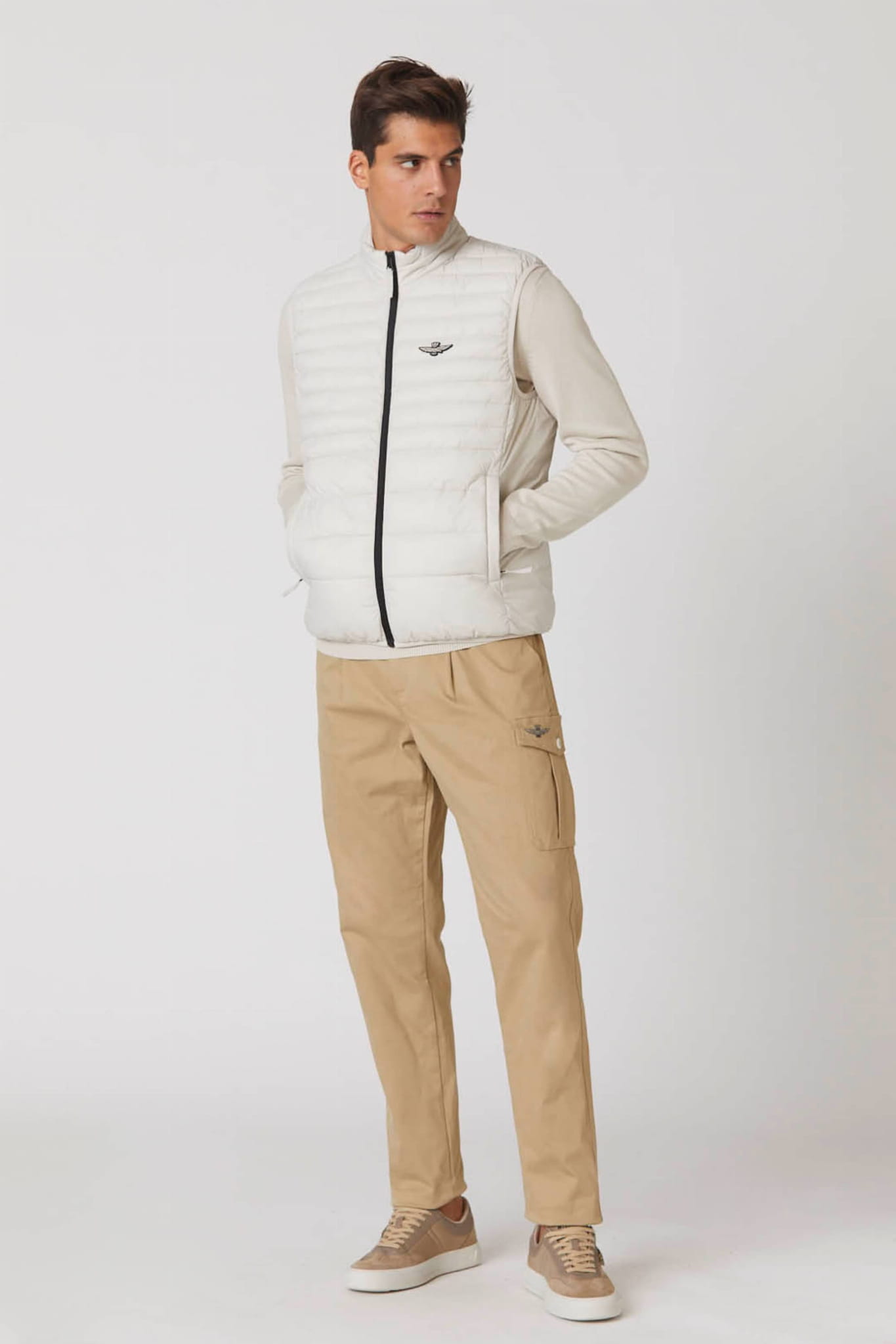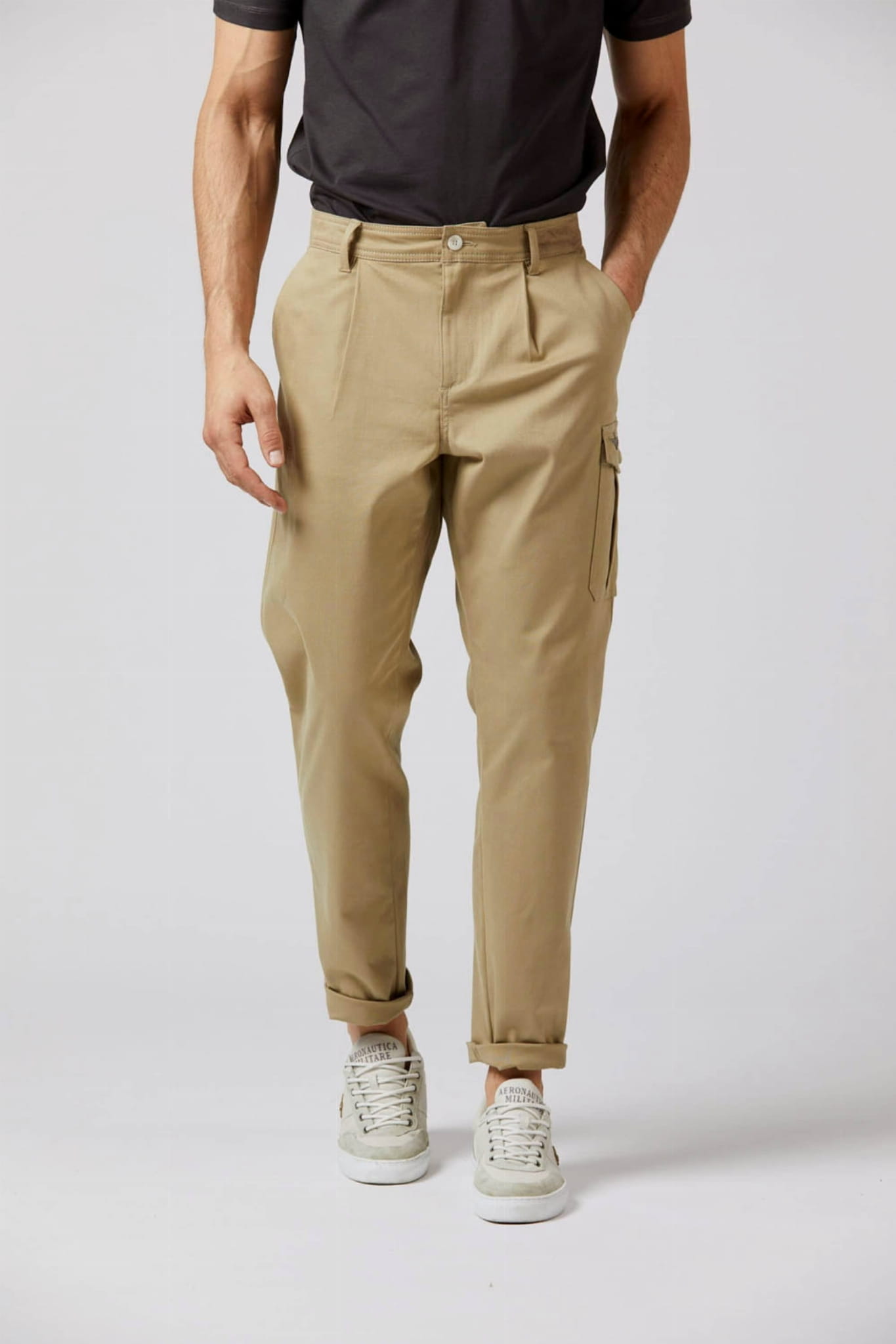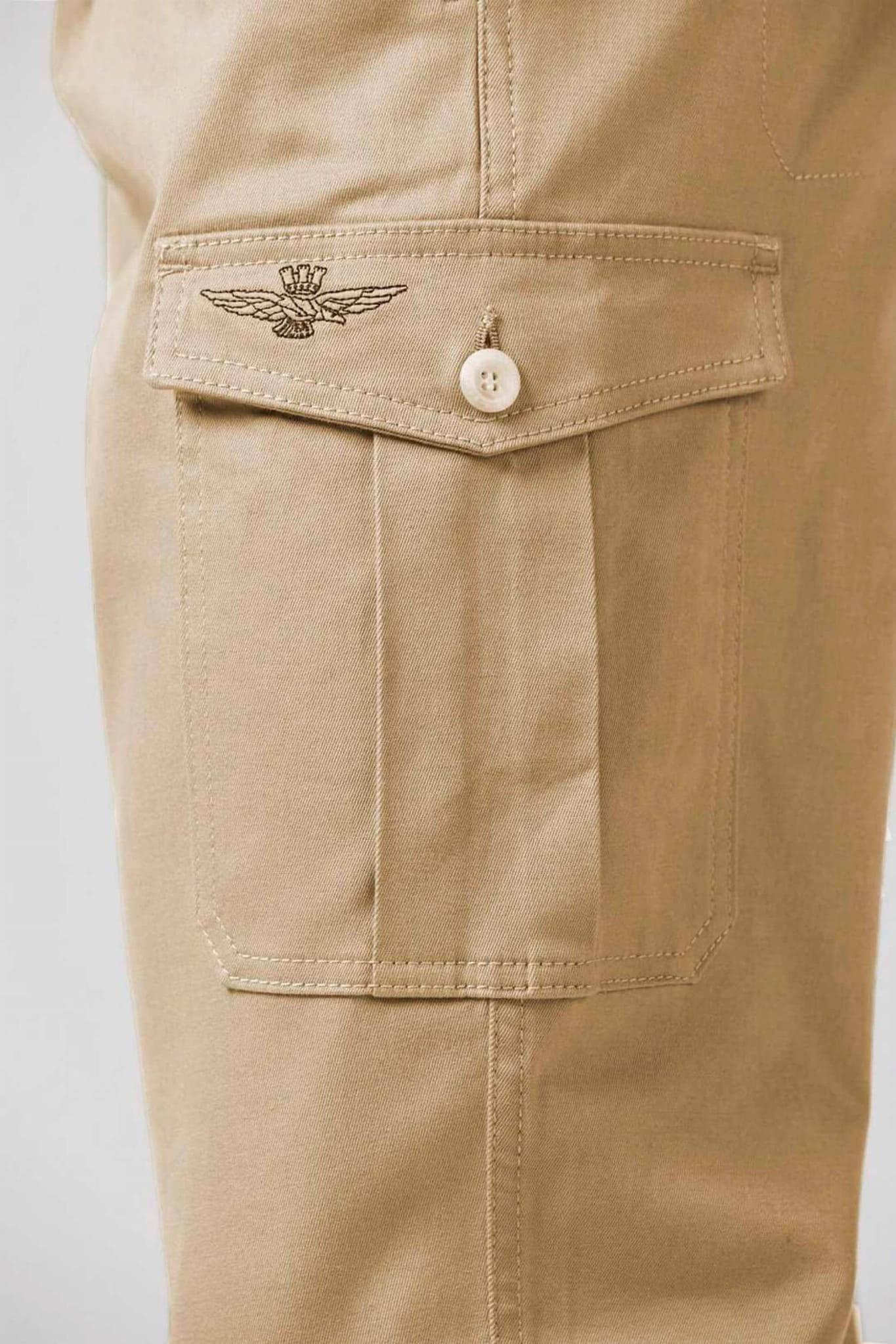 Męskie długie spodnie marki Aeronautica Militare, w kolorze piaskowym.