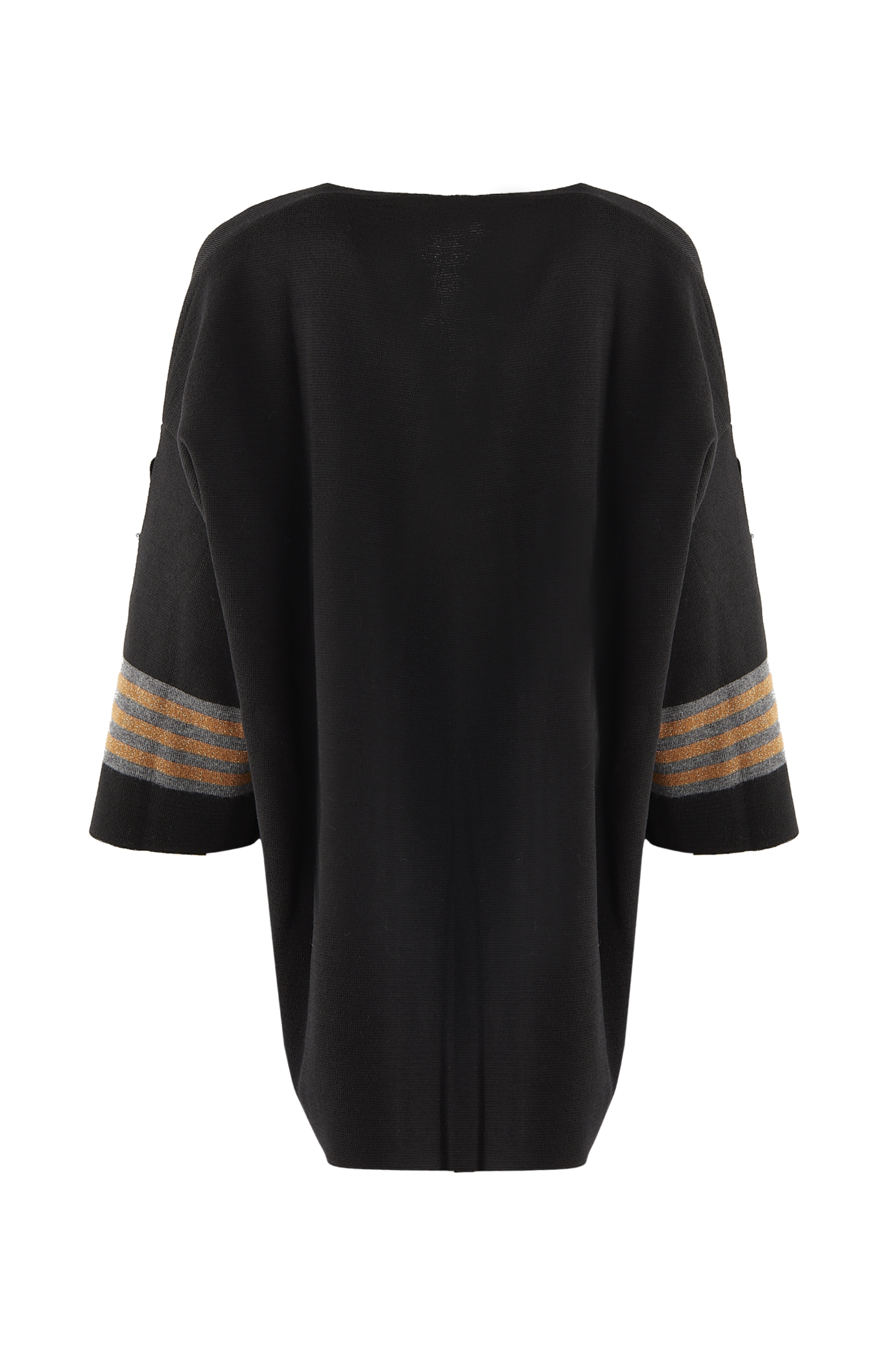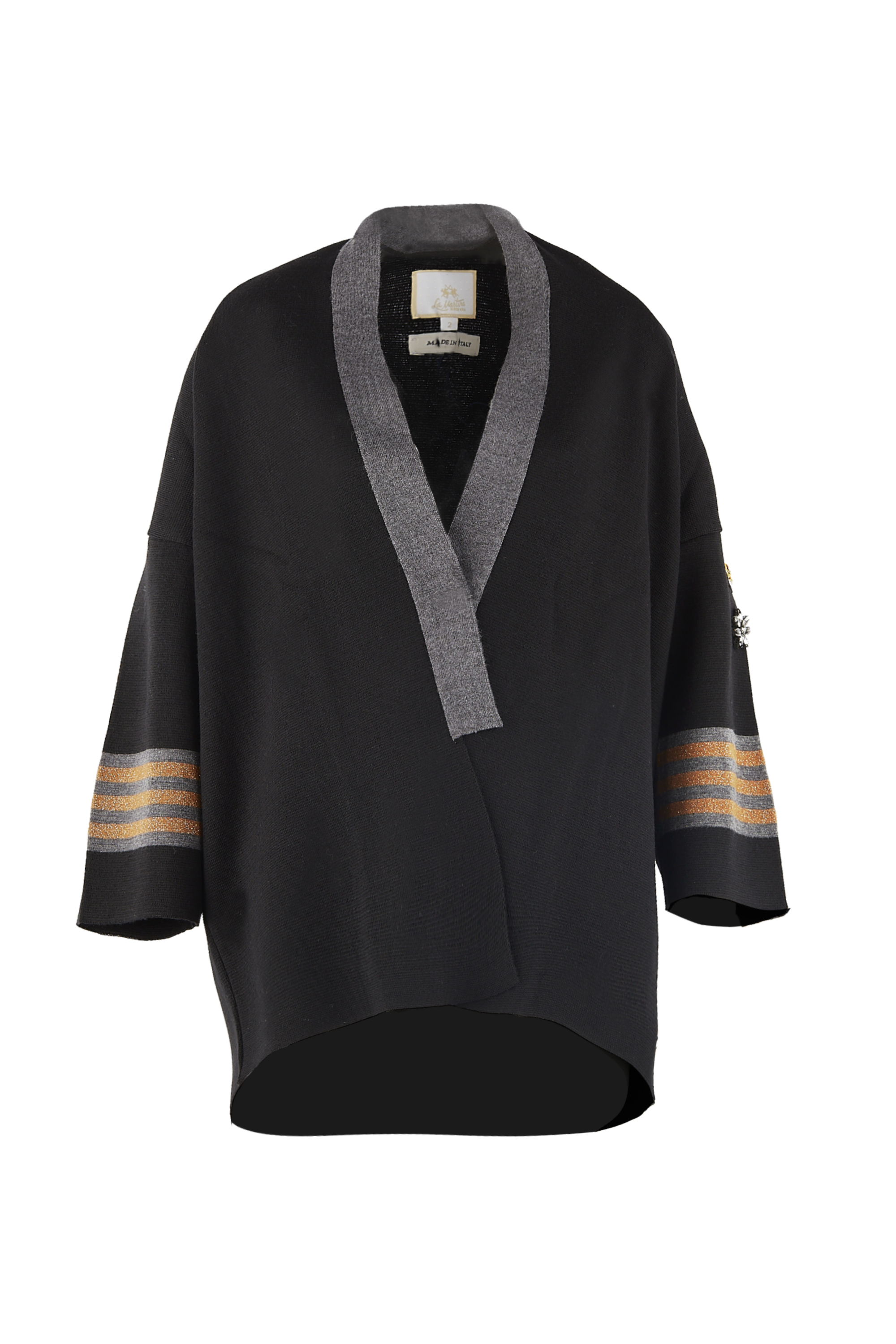 ⇒ Rękawy z szaro-złotymi paskami o długości 3/4. Na jednym z nich znajduje się efektowna aplikacja korony i kwiatka wykonanego z czarnych kryształków.