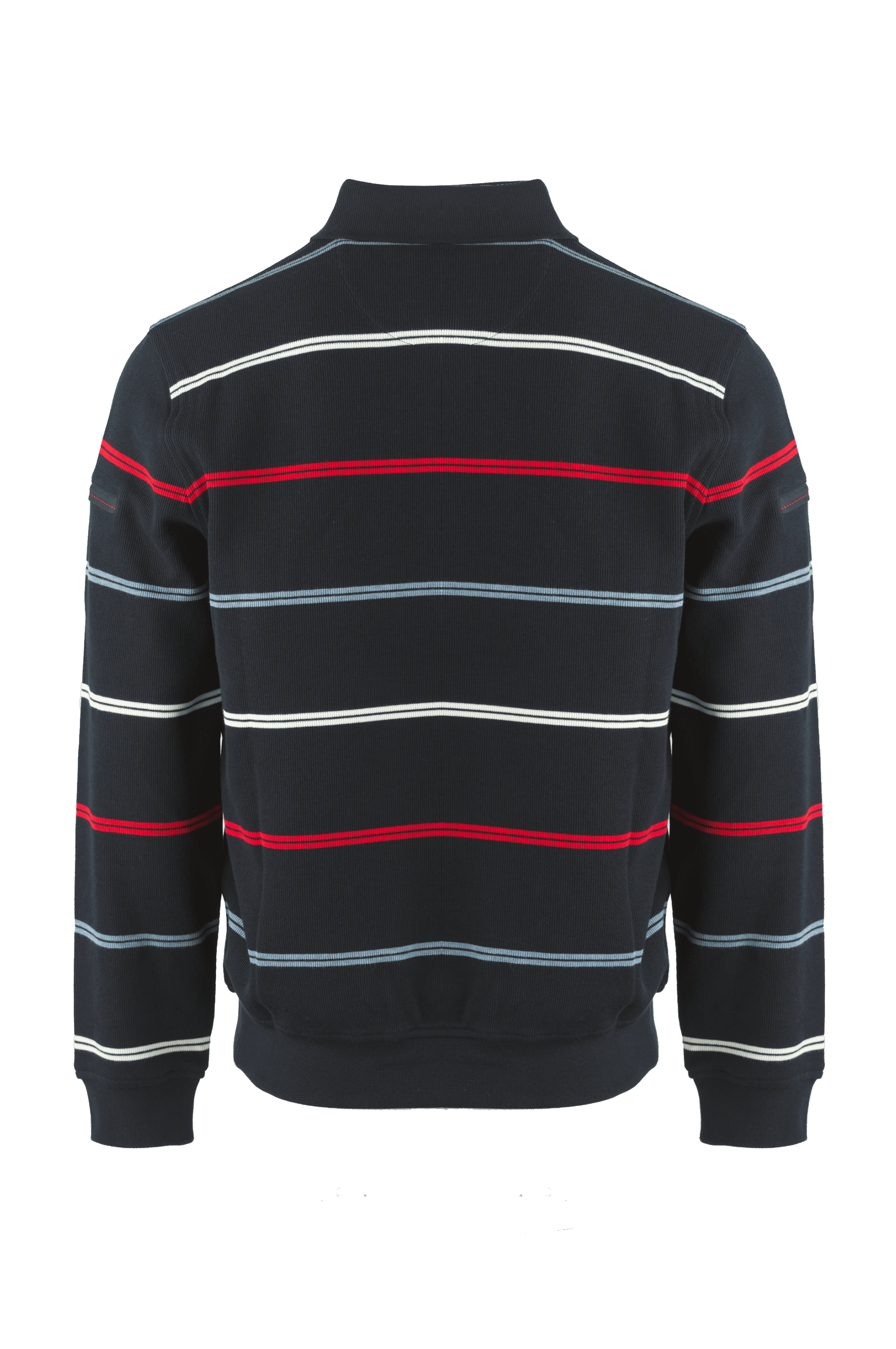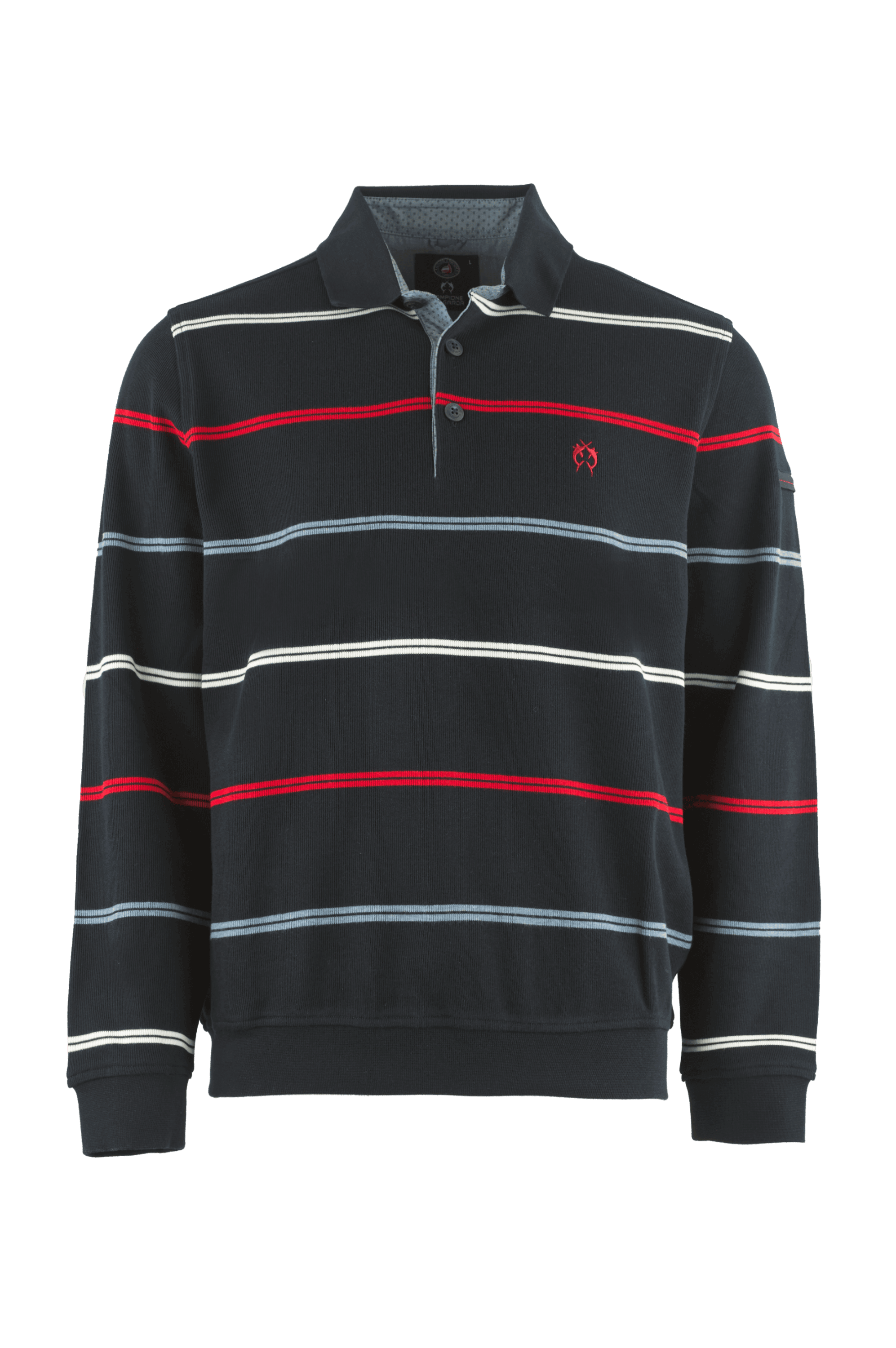 Męska bluza/sweter ze stójką marki Campione, w kolorze granatowym w biało-czerwono-niebieskie paski.