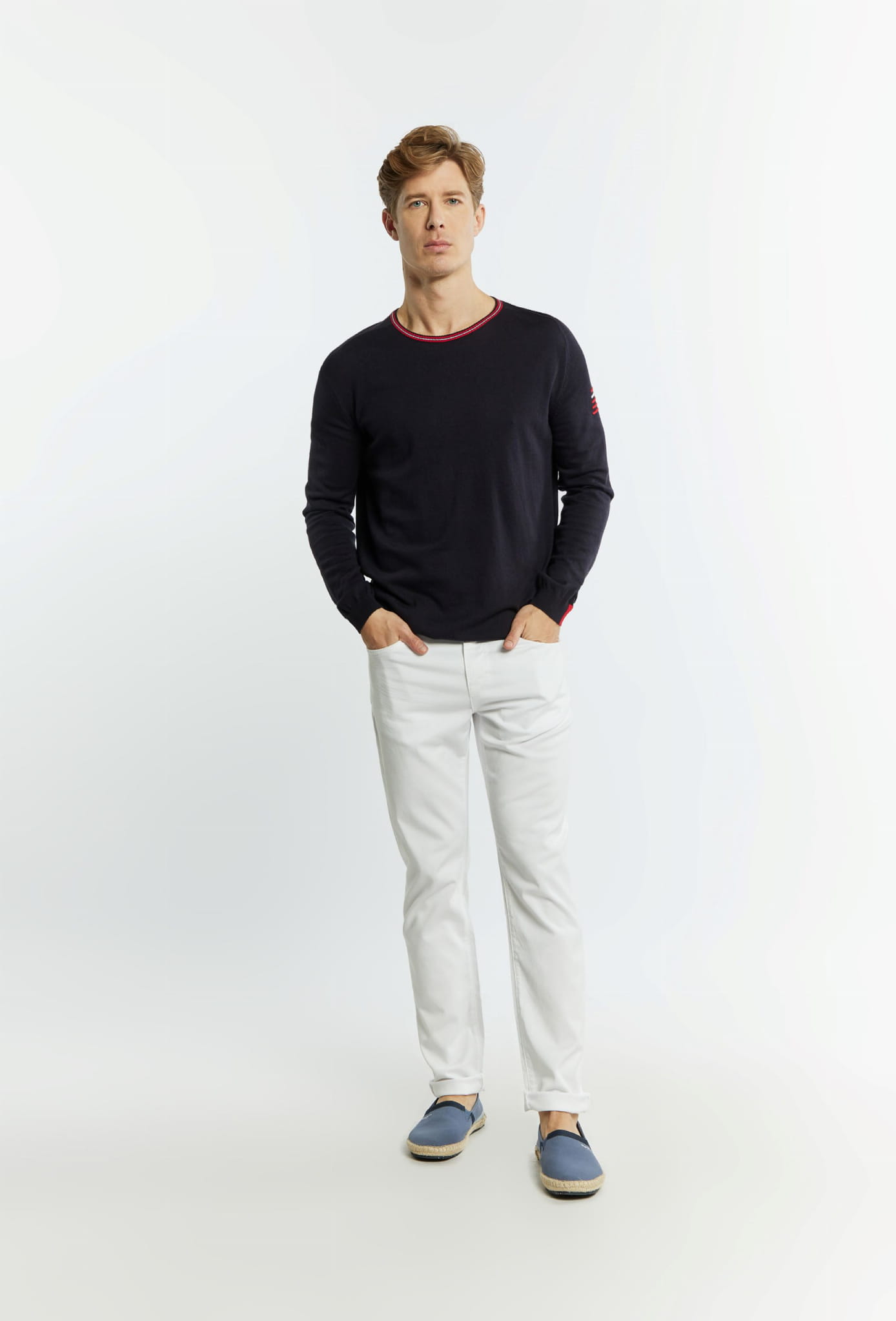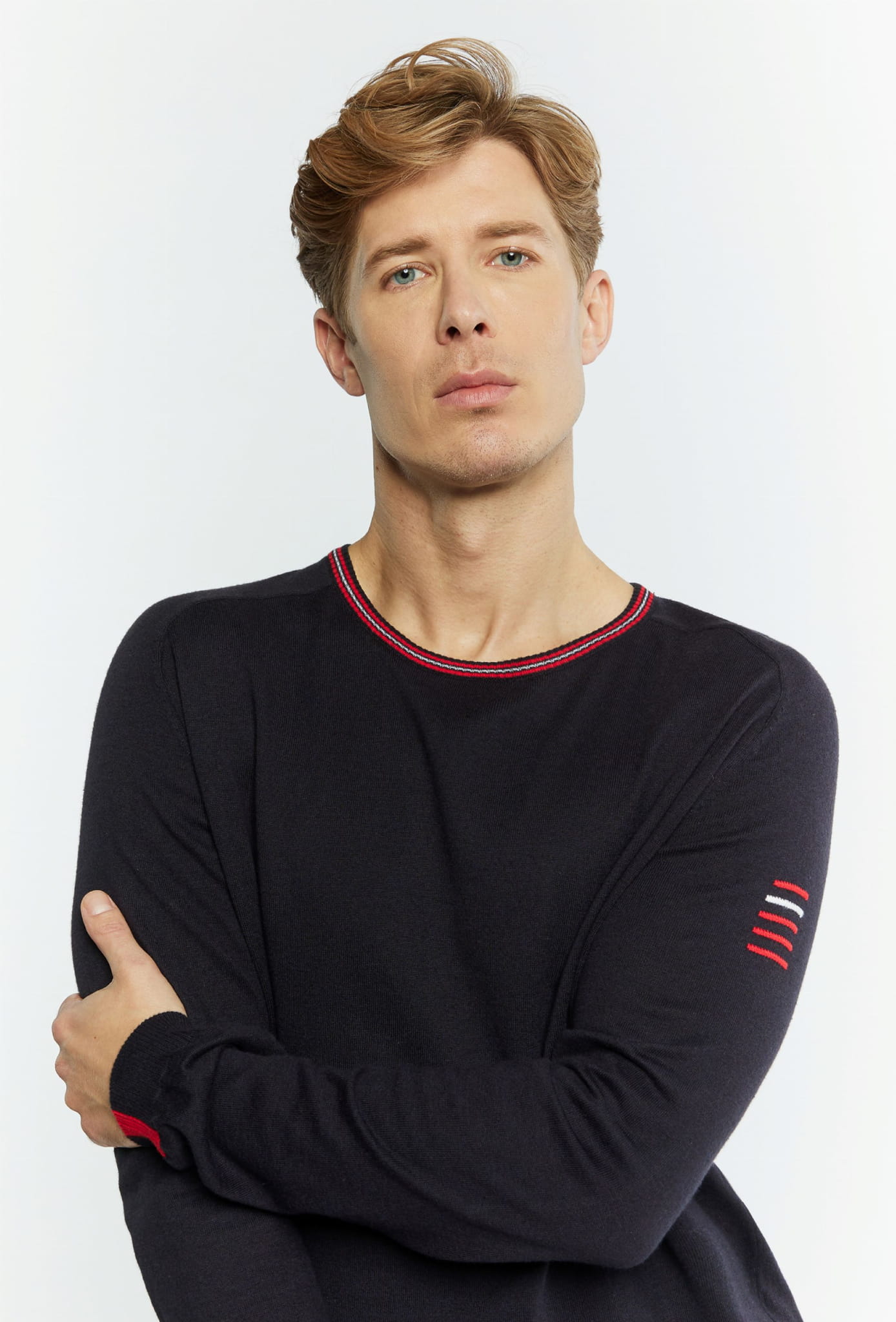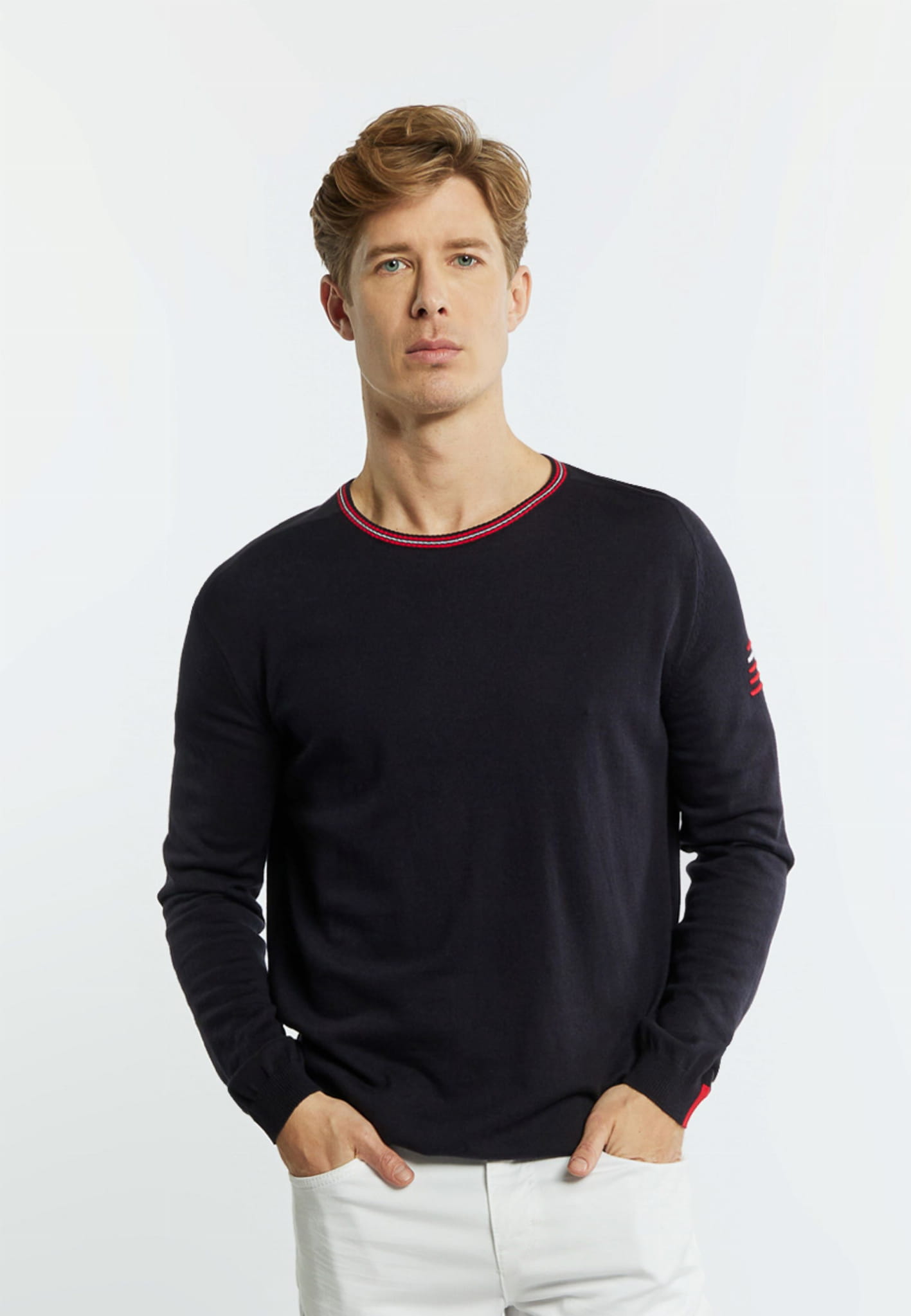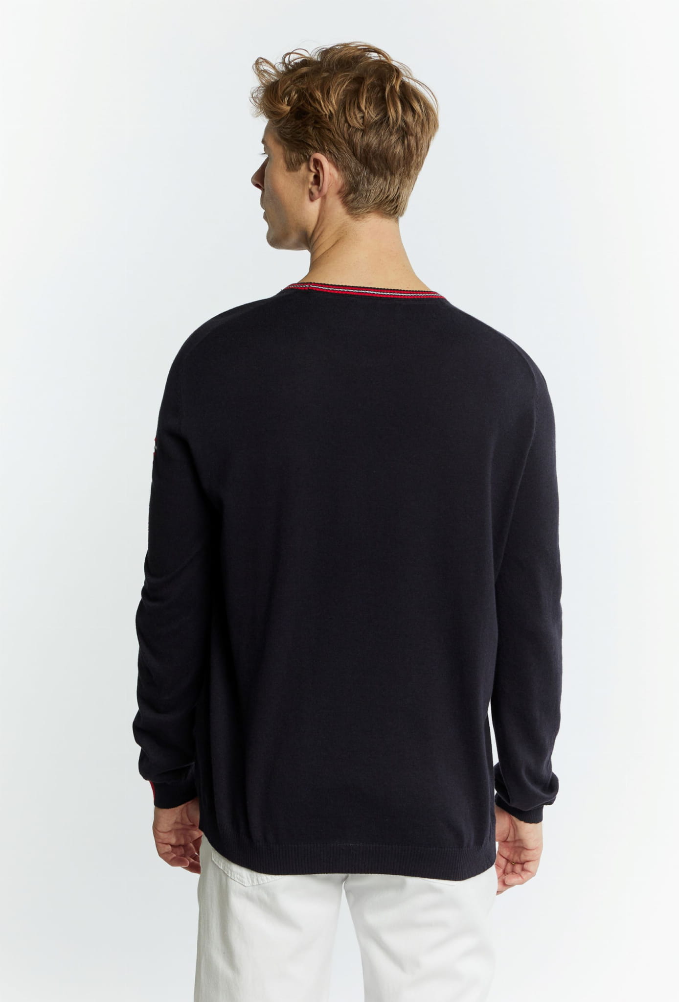 ⇒ Okrągły prążkowany dekolt w biało-czerwonym kolorze.