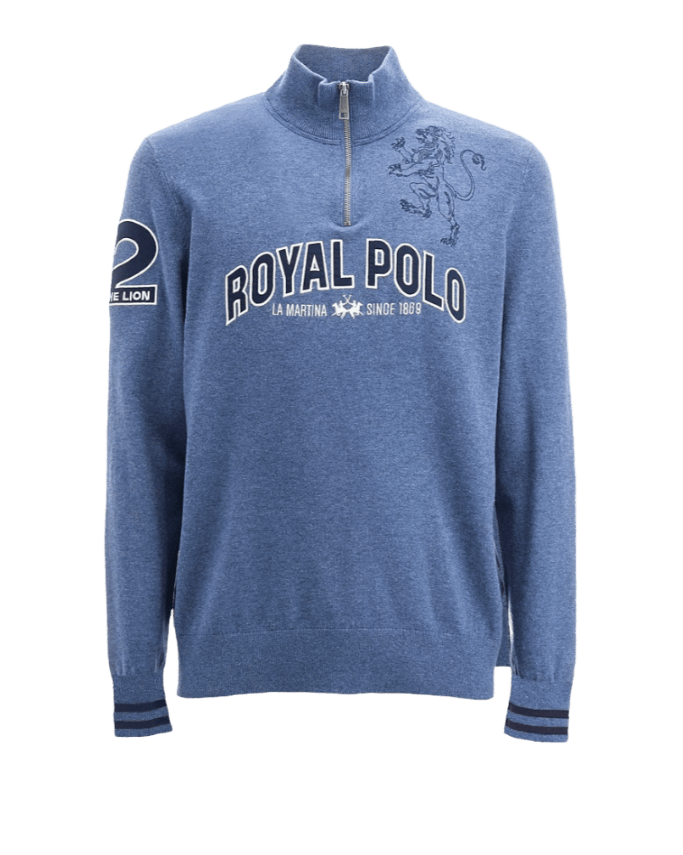 ⇒ Przód swetra zdobią efektowne hafty w formie logo marki, napisu "LA MARTINA SINCE 1869" oraz lwa, a także duża aplikacja "ROYAL POLO".