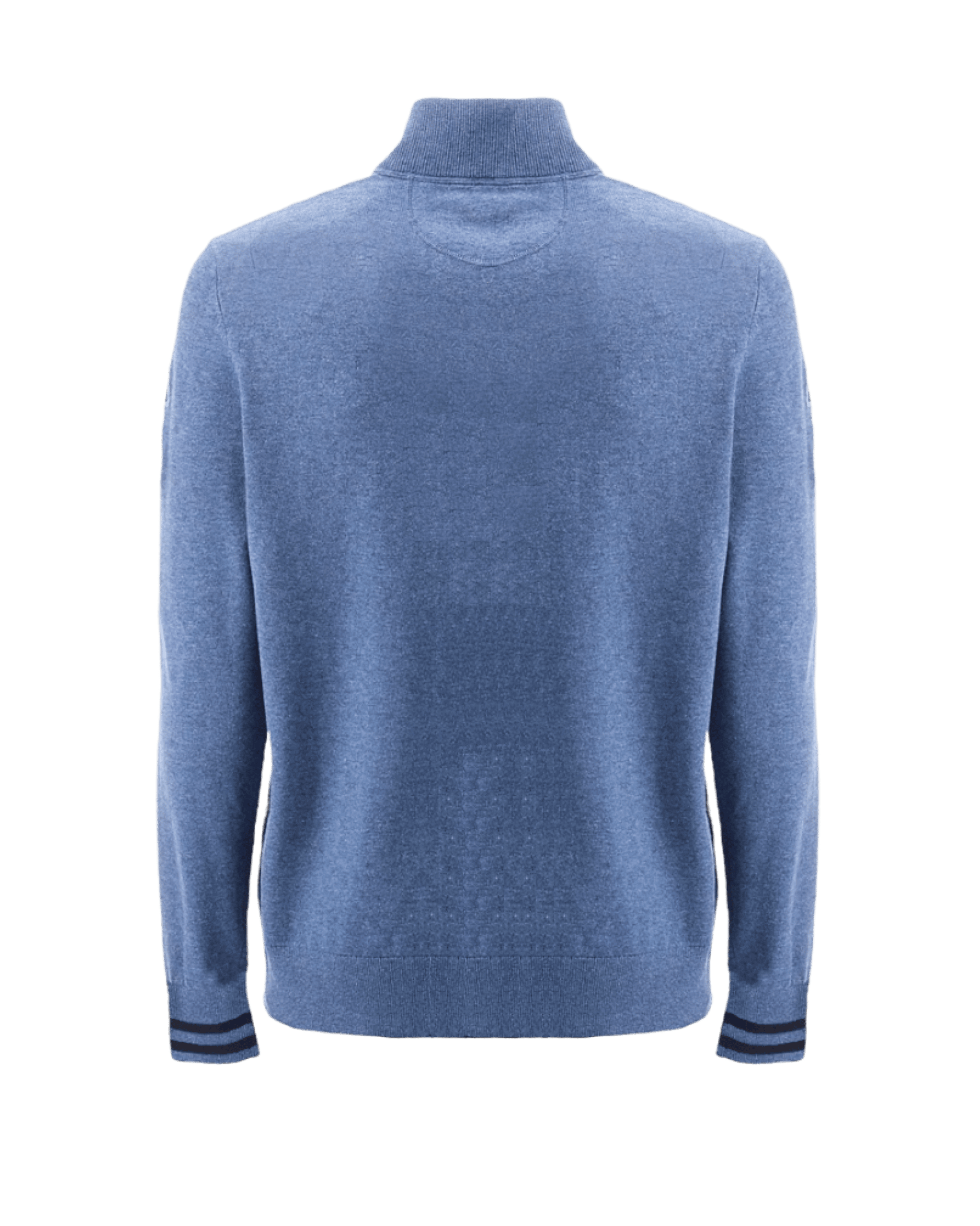 Męski wkładany przez głowę sweter ze stójką i długim rękawem marki La Martina, w kolorze niebieskim.