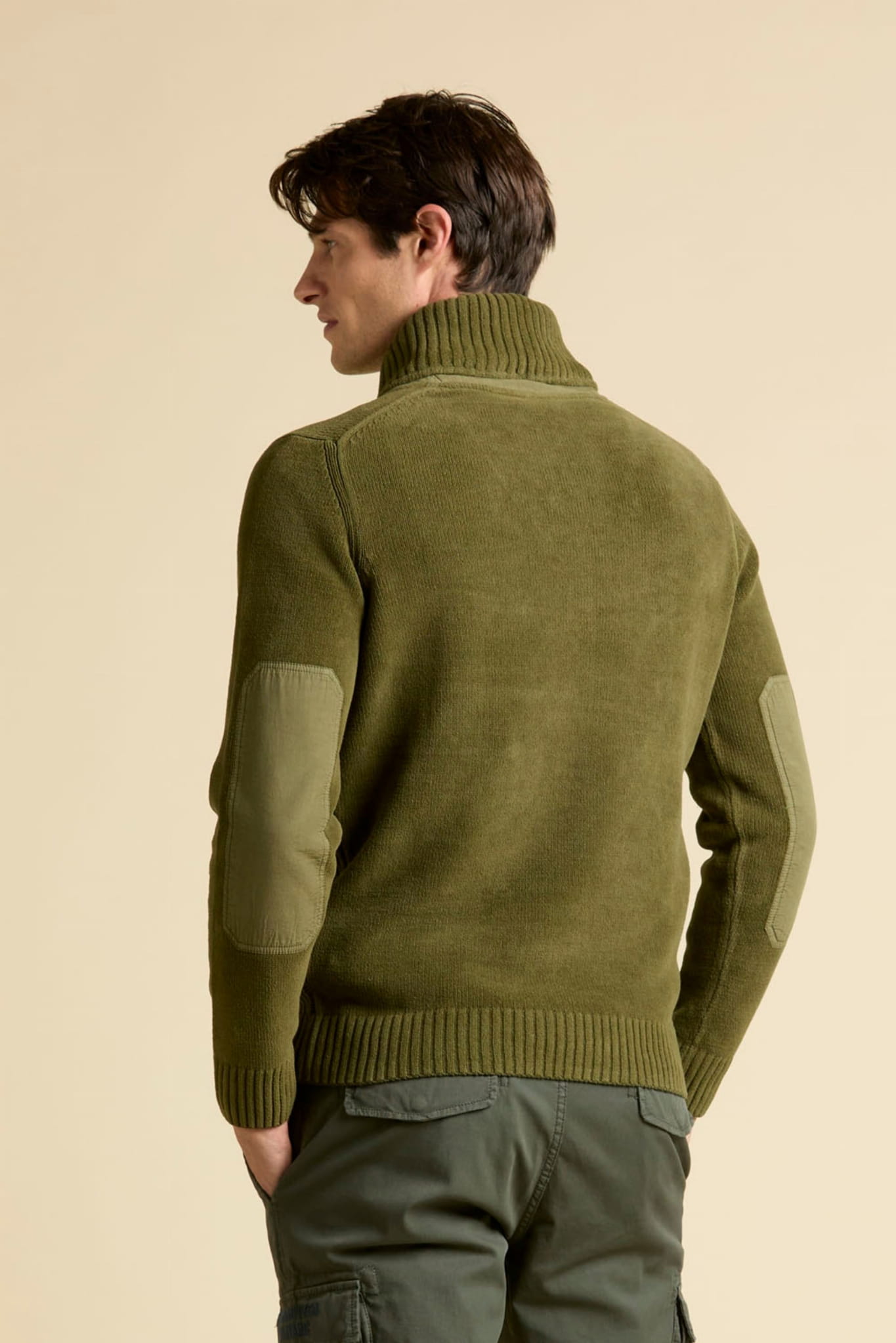 ⇒ Naprzemienne zastosowanie gładkiej dzianiny i dzianiny prążkowanej rib dodaje mu swobody i głębi, a wstawki z gabardyny pod kołnierzem i na łokciach nadają mu nowoczesny, techniczny charakter.