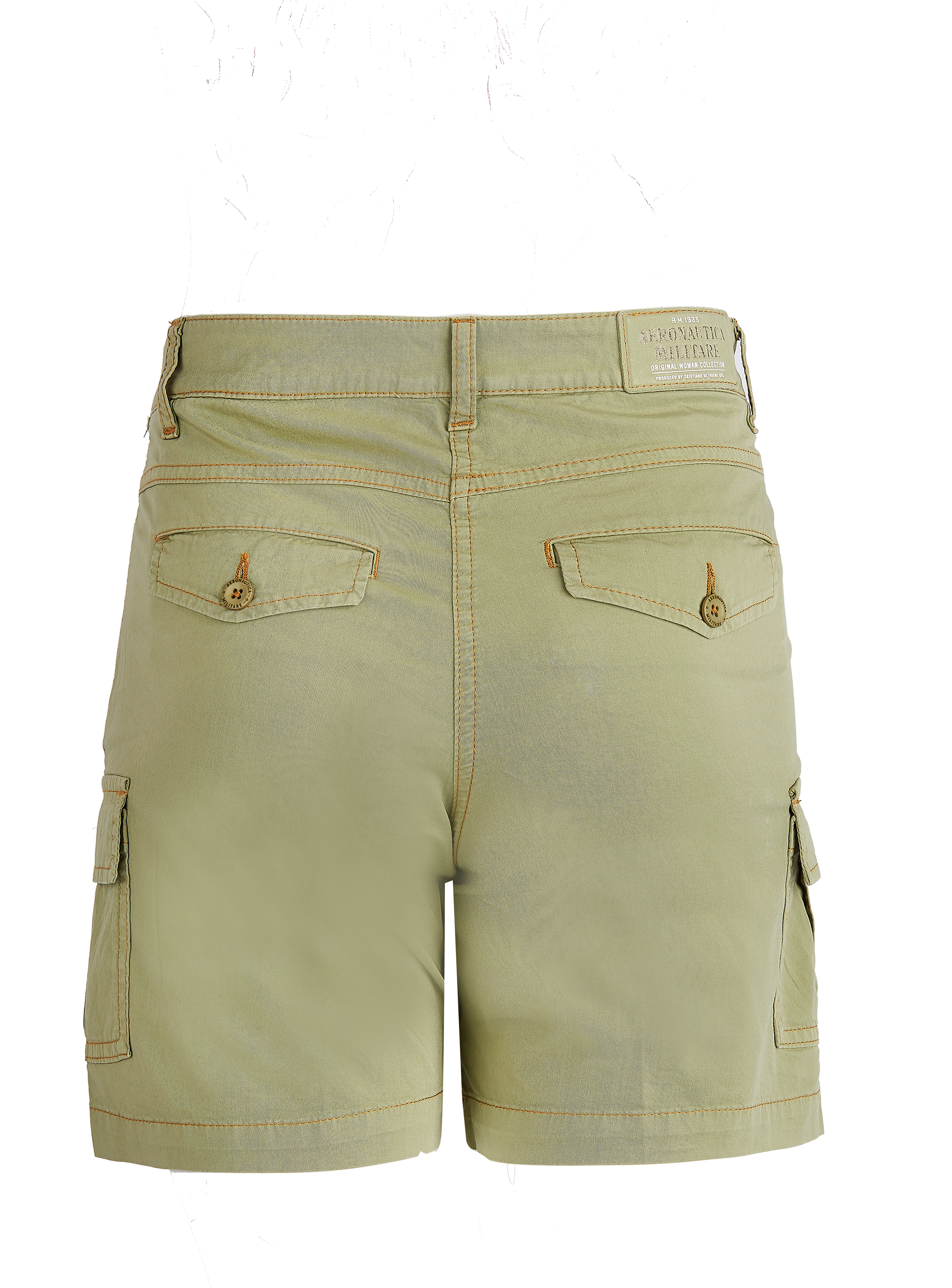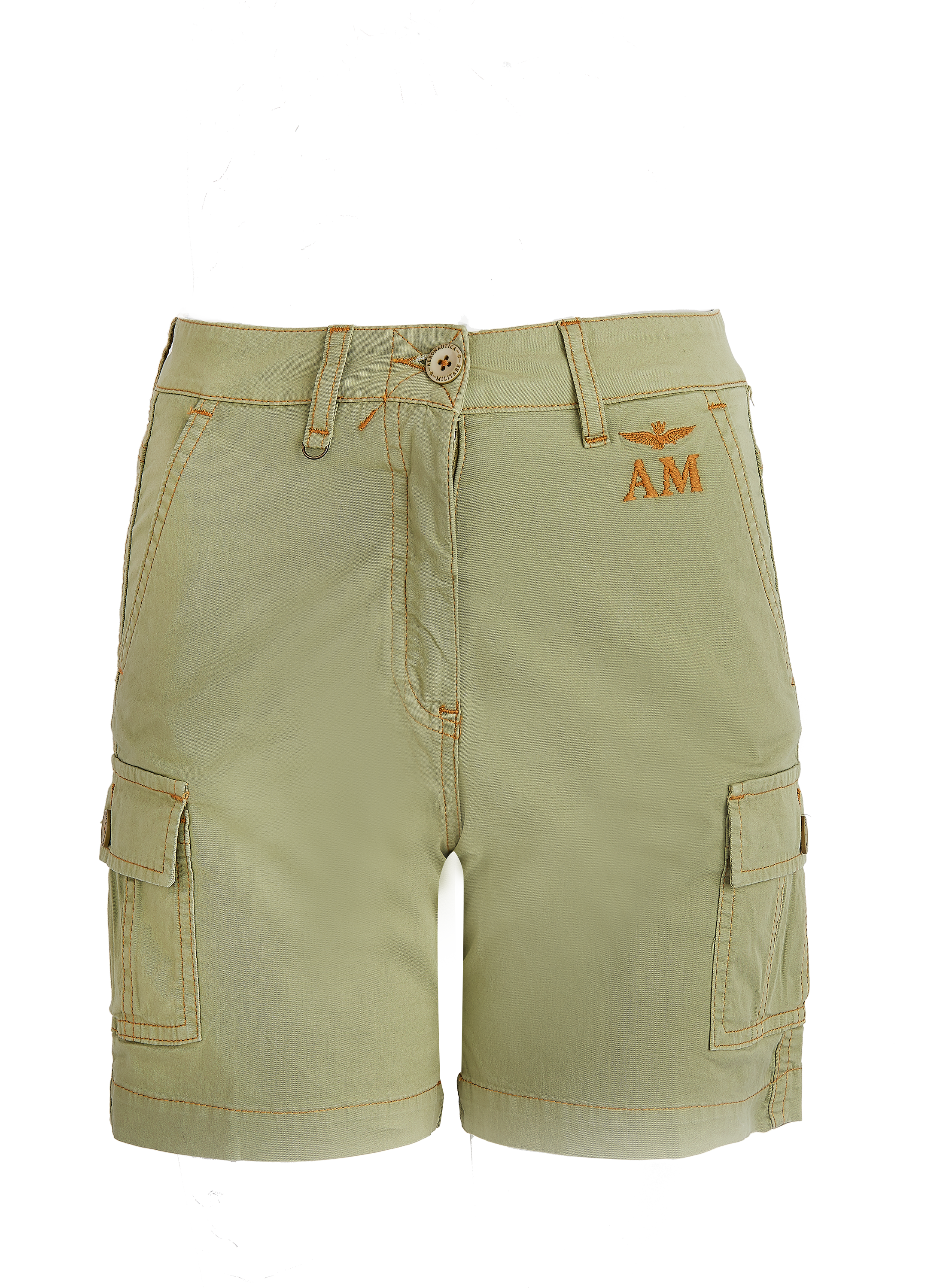 Damskie krótki spodenki bermudy typu cargo marki Aeronautica Militare, w kolorze jasnej militarnej zieleni.