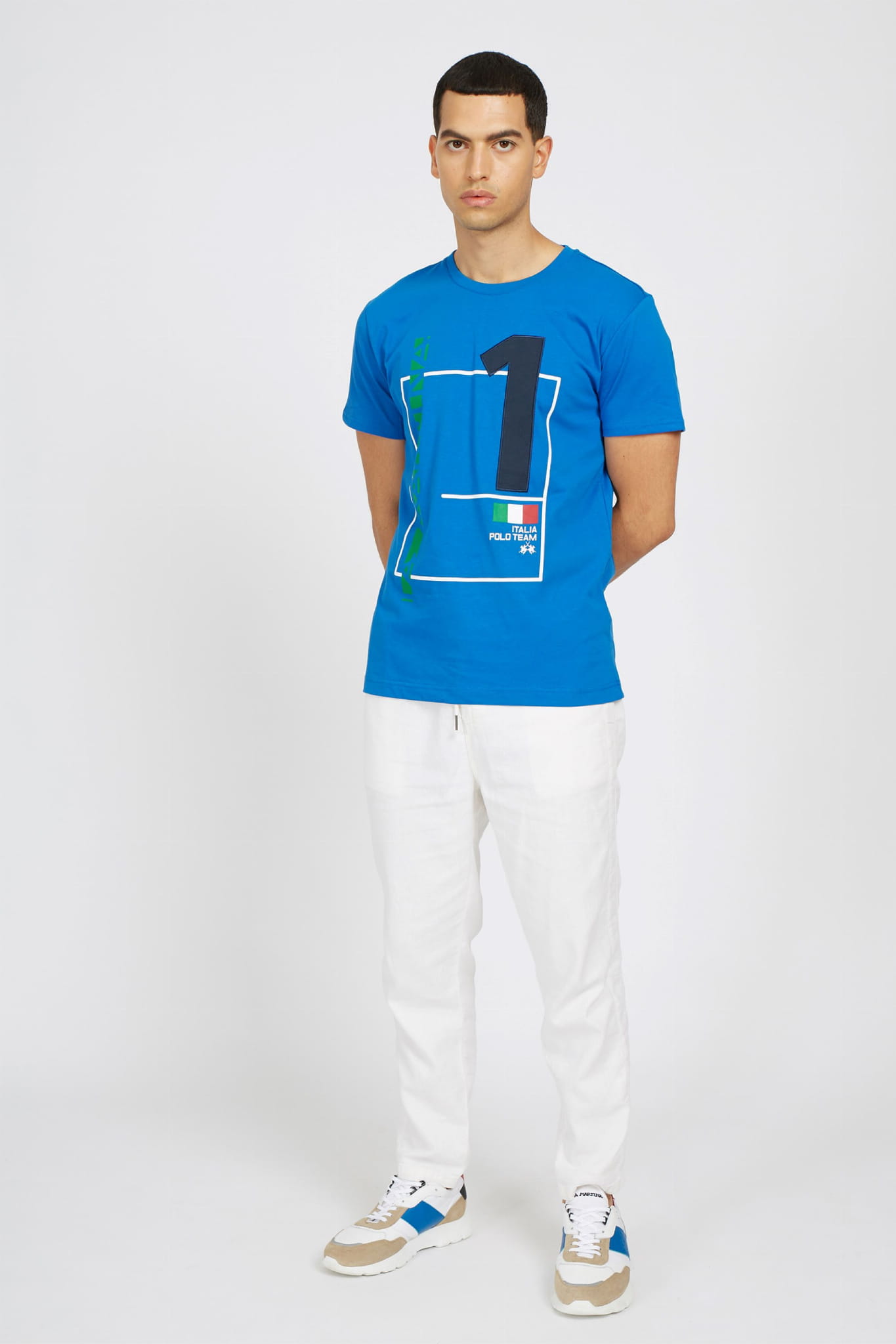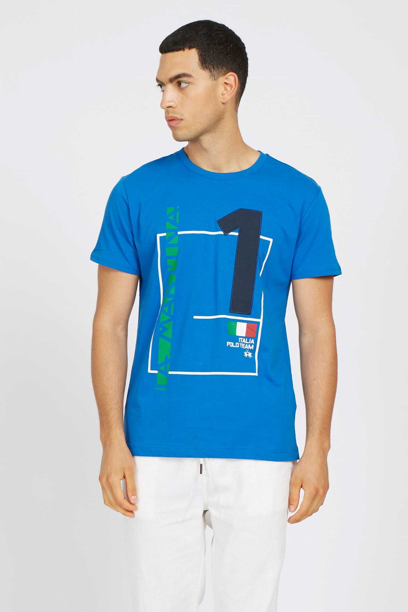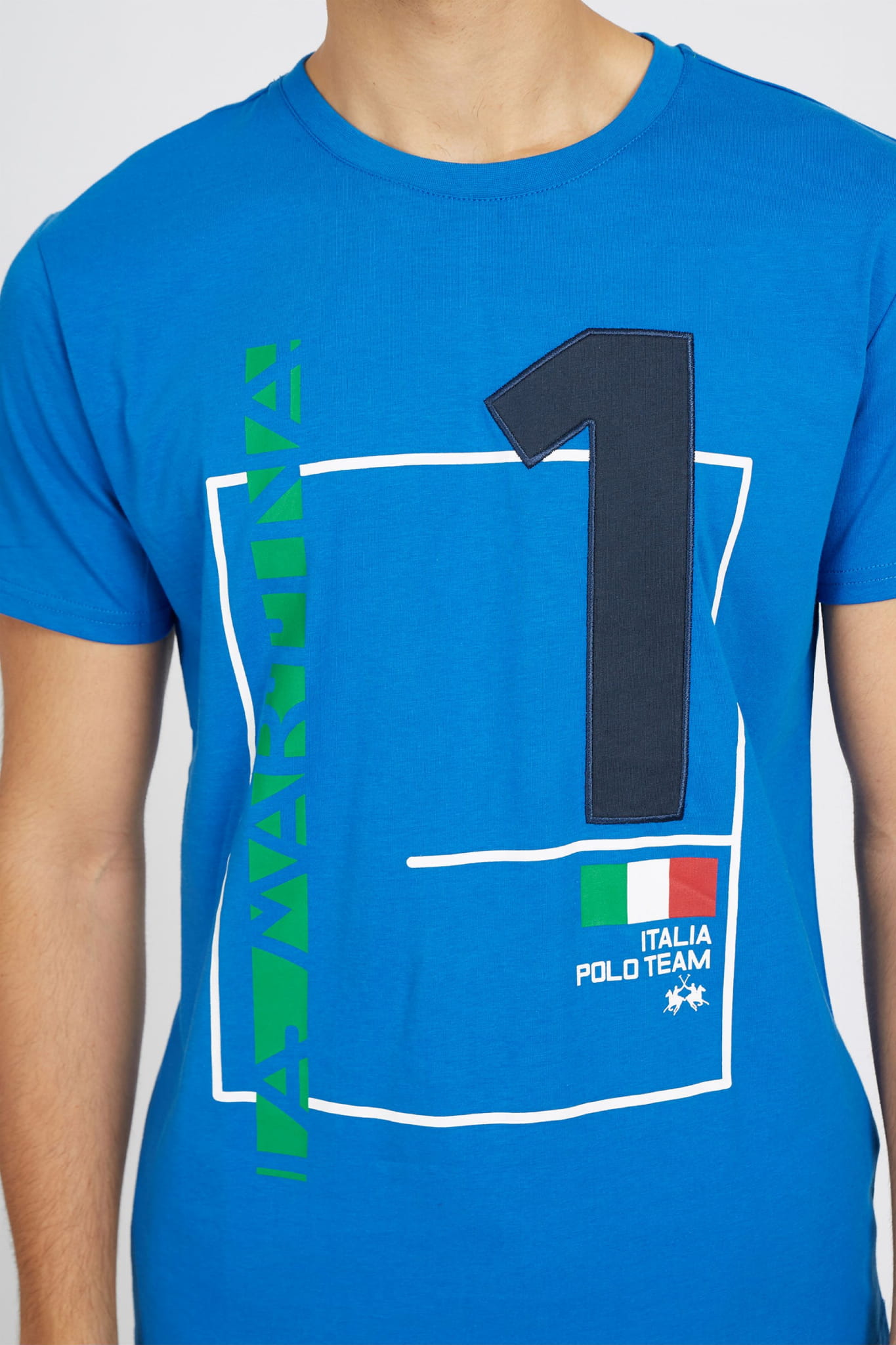 ⇒ Z przodu znajduje się efektowna aplikacja z dużym numerem 1, napis "La Martina" oraz włoska flaga, a także małe subtelne logo marki.