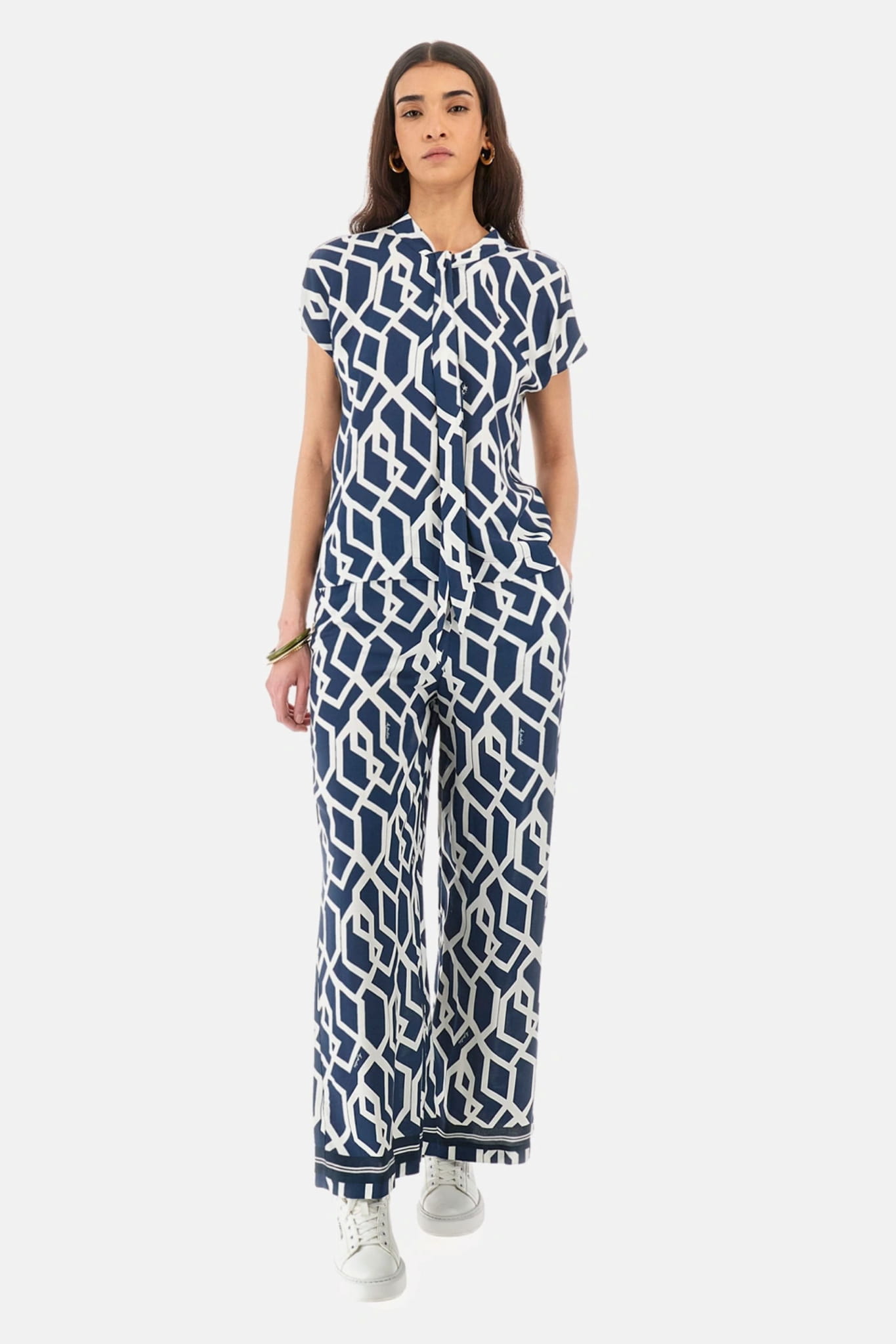 Damska koszulka z krótkim rękawem marki La Martina, w biało-granatowe geometryczne wzory.