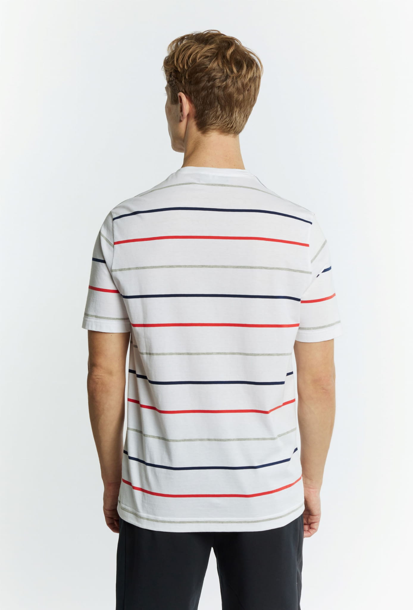 Męski t-shirt z krótkim rękawem marki Campione, w kolorze białym w granatowo-czerwono-szare paski.