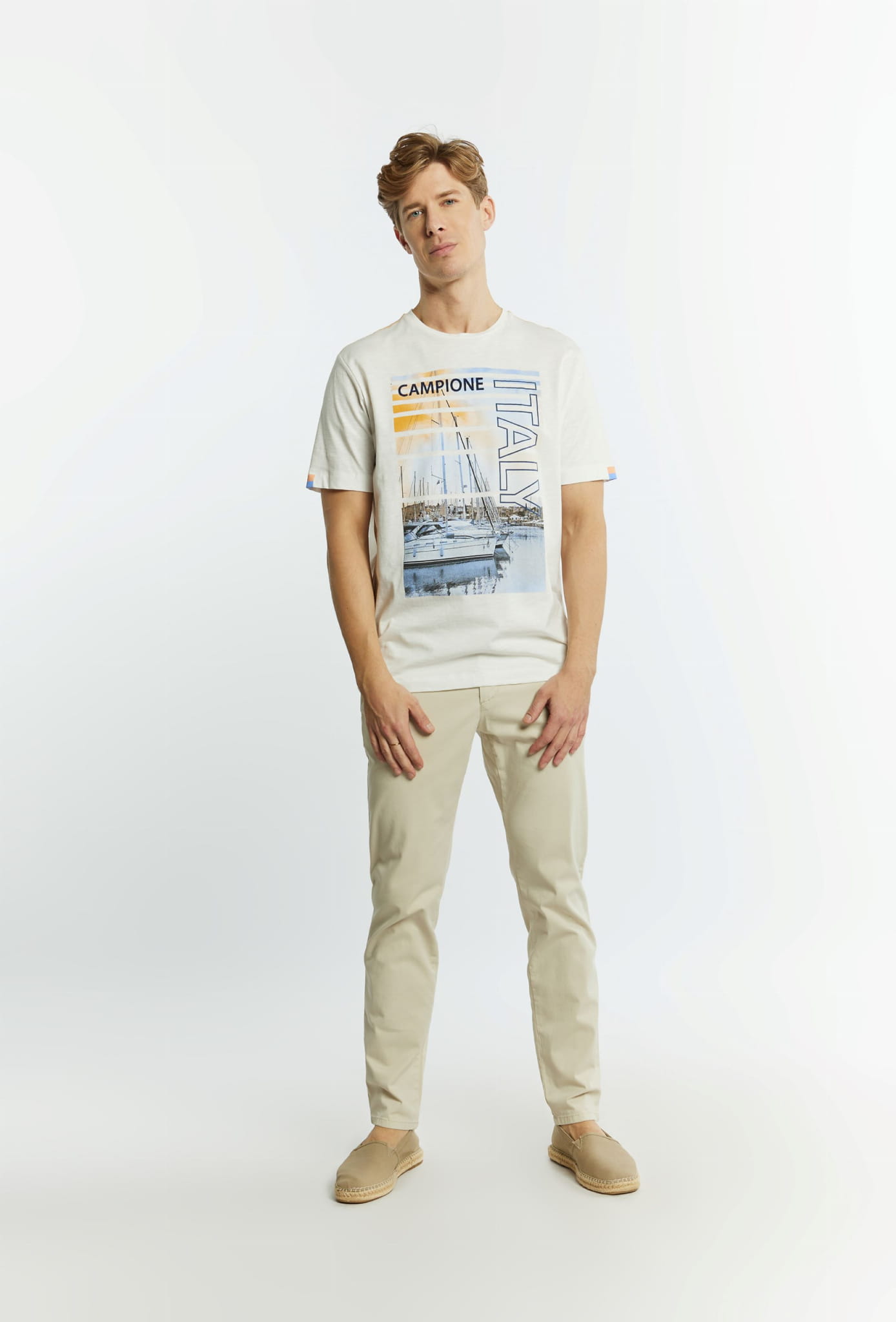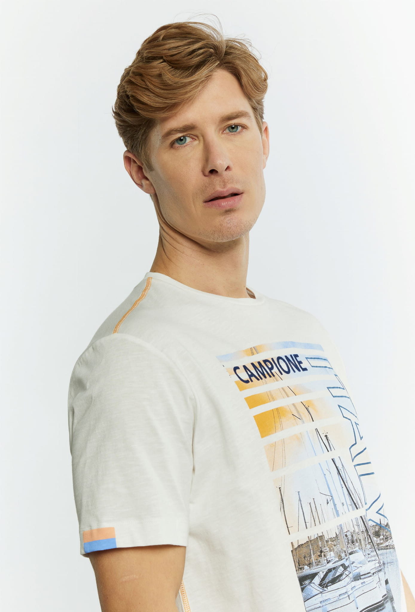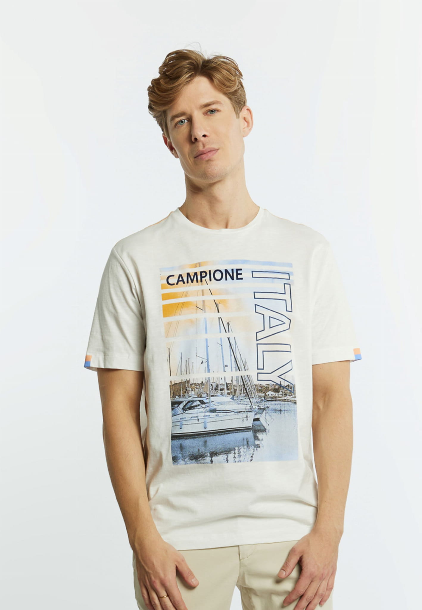 ⇒ Przód zdobi kolorowy duży nadruk o yachtingowym charakterze.