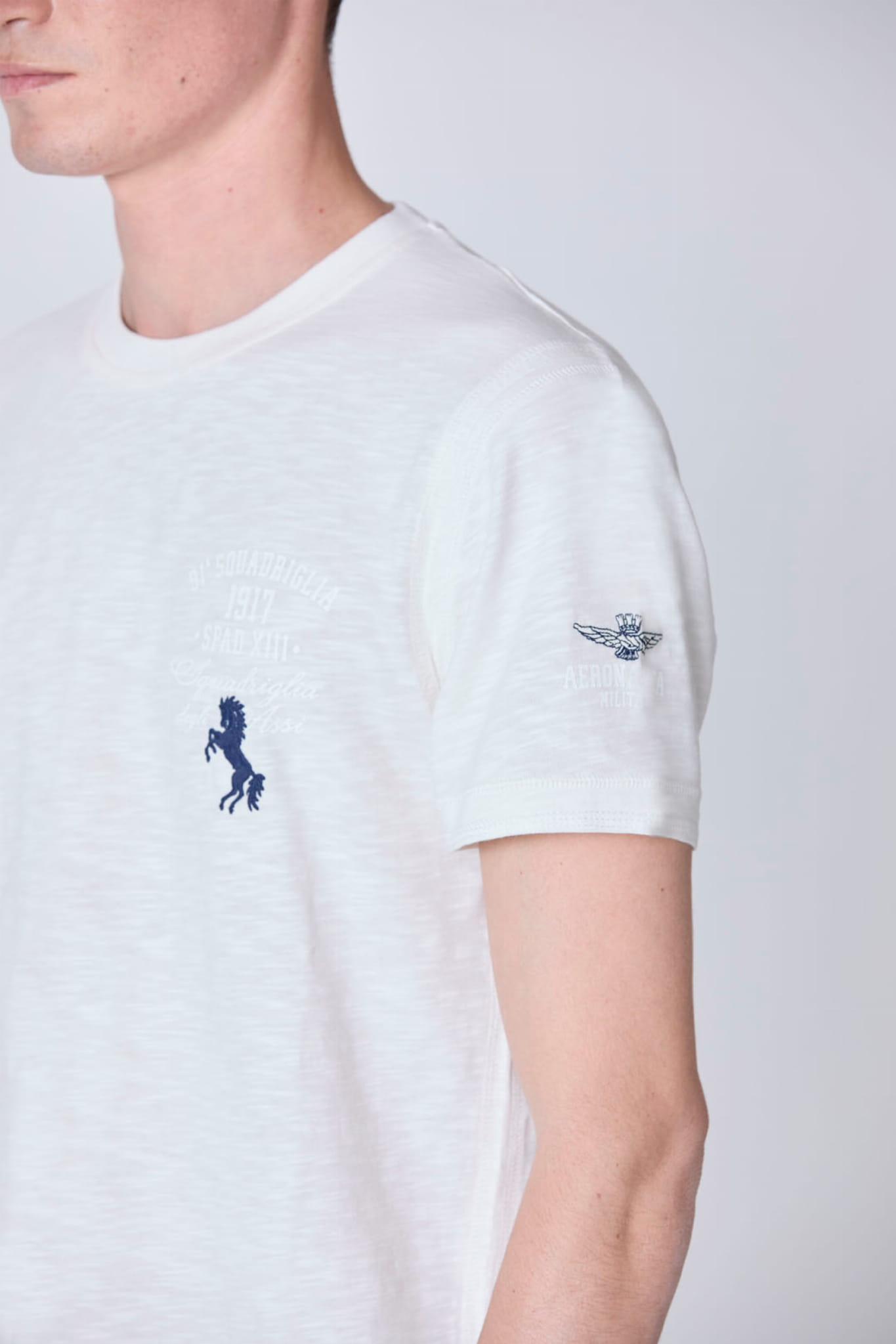⇒ Starannie wyhaftowane logo marki Aeronautica Militare w formie kultowego orzełka na lewym rękawie.