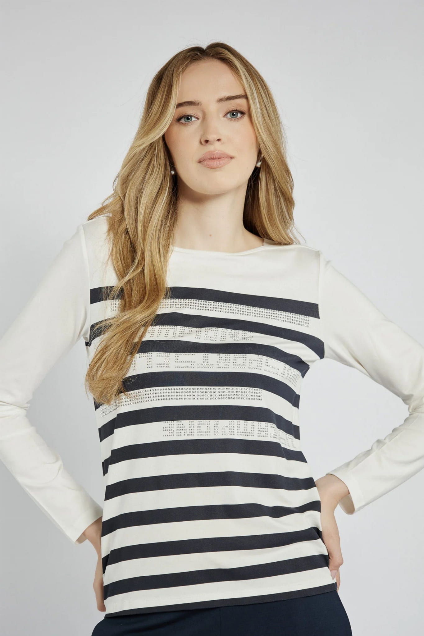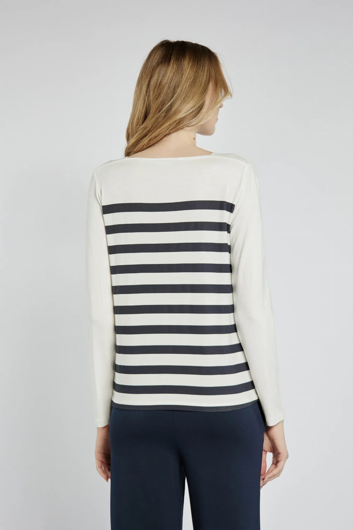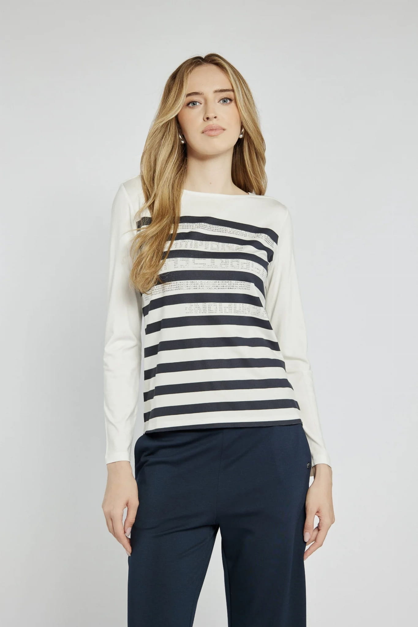 Damska wiskozowa bluzka z długim rękawem marki Campione, w biało-granatowe paski.
